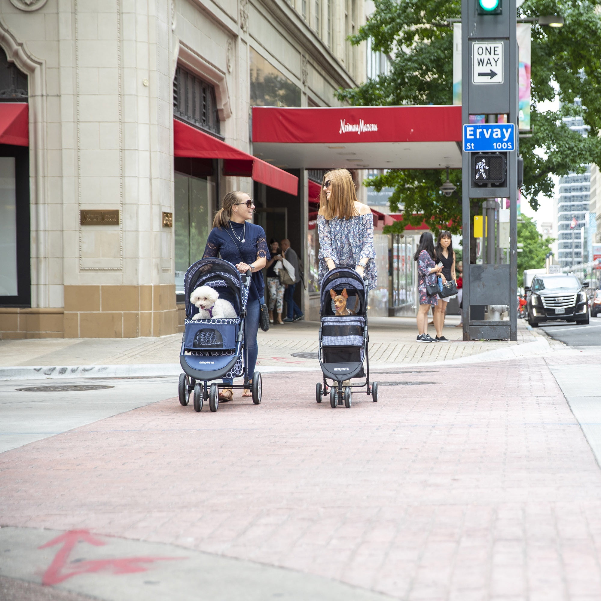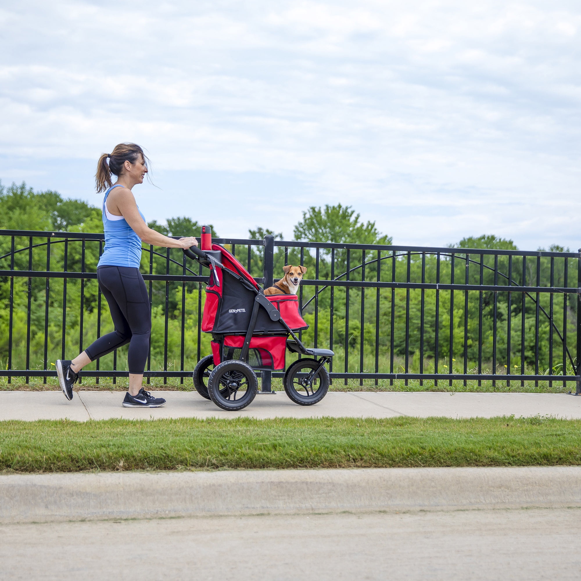 Take a pet anywhere with the Gen7Pets® G7 Jogger Pet Stroller. Great for an active family that’s always on the go; the G7 Jogger Pet Stroller holds up to 75 lbs. making this perfect for a large dog or two small dogs. The mesh Smart-Canopy allows pet parents to enclose their pets in the interior pet compartment or roll the Smart-Canopy up under the hood to expose pets and give them more room. For added safety; the interior pet compartment features two adjustable safety tethers that can be attached to a collar or harness to keep a pet in the stroller during use. Whether running on a smooth sidewalk or walking on a rocky trail; the G7 Jogger provides a smooth ride for a pet with shock absorbers and Smart-Wheels that are designed to never run flat. The front convertible wheel allows for sharp turns or navigating easily through large crowds. A rear-wheel brake system allows for locking the stroller in place if needed. Designed with convenience in mind; the G7 Jogger includes an accessory tray; two cup holders; and a storage compartment for a cell phone. The Smart-Basket allows for the storage of jackets; bags; pet toys; etc. The unique Smart-Reach handle provides a greater amount of kick space behind the stroller to jog or walk at any pace. A Smart-Fold design allows for folding the stroller flat for storage with the push of a button. Easy to assemble; no tools required. PRODUCT NOTE: Interior Pet Compartment Dimensions: 26″ L x 14″ W x 22″ H For assembly instructions; visit petmate.com/petstroller-instructions
