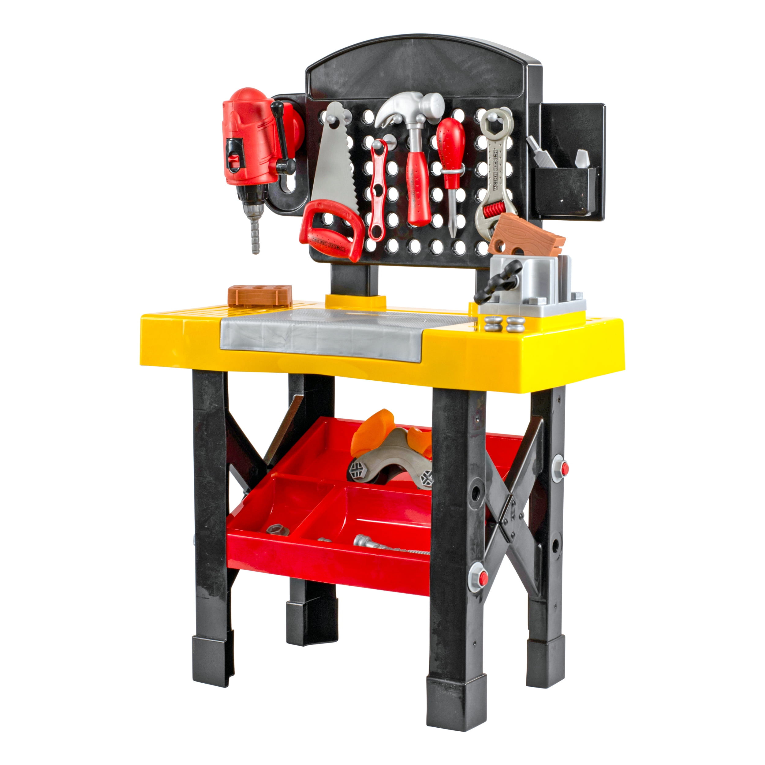 Includes Life Size Tool Bench with 2 Cross braced Legs, Work Surface with Storage and Peg Board, Bottom Storage Container Tools Included Hammer, Hand Saw, Crescent Wrench, Tool Handle with Slot, Phillips Head and File Inserts 3 Play Wood Blocks Includes 10 Nuts, 8 Bolts, 6 Nails and 7 Tool Hangers Gener8 Preschool item for any male ages 3 Years and Up Good birthday or Holiday Gift Item for your child