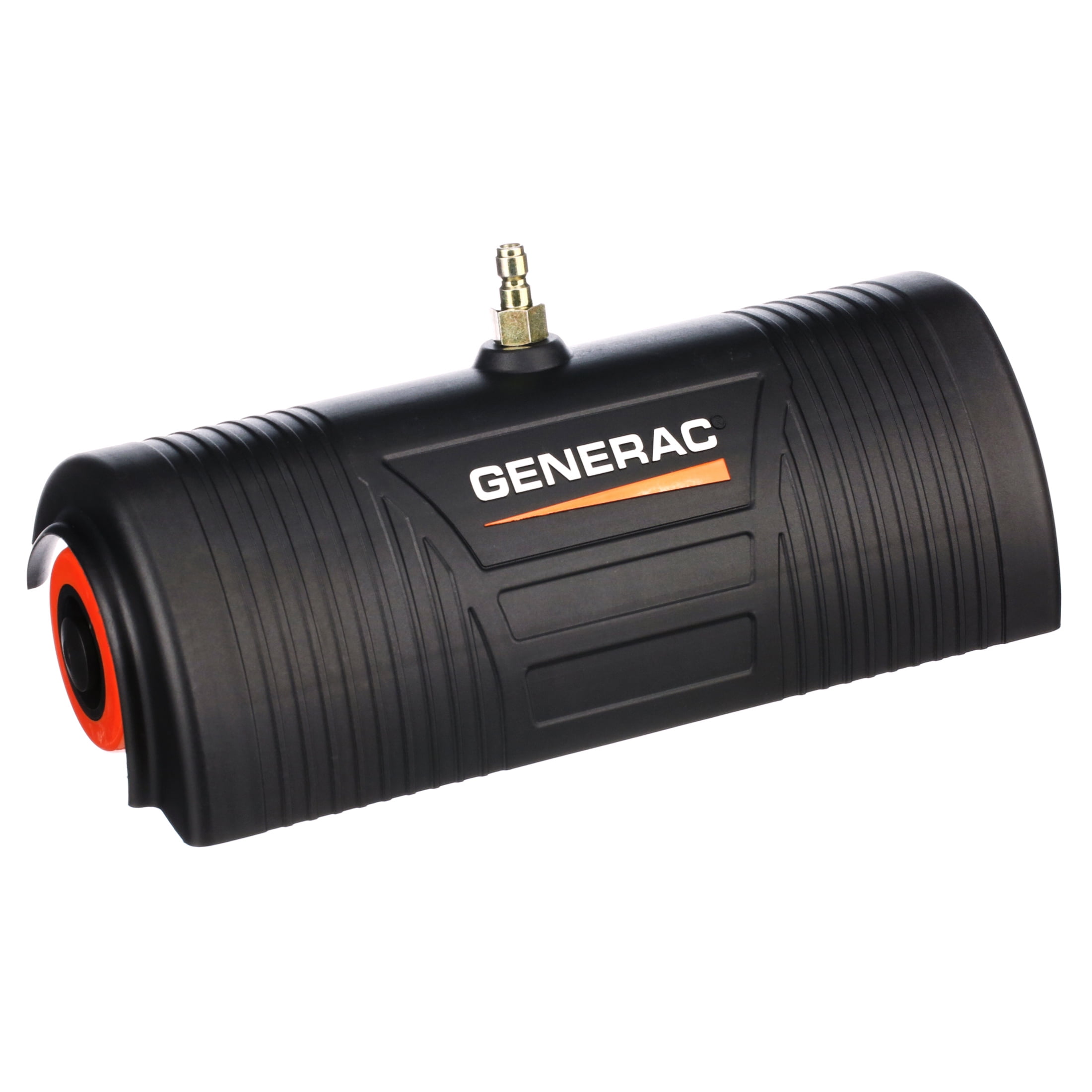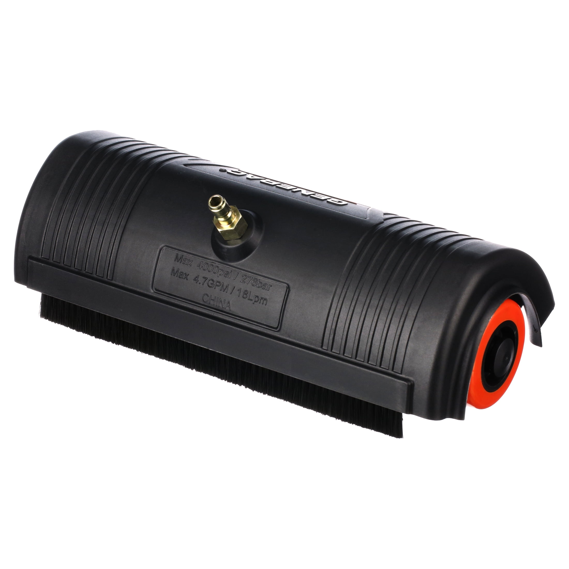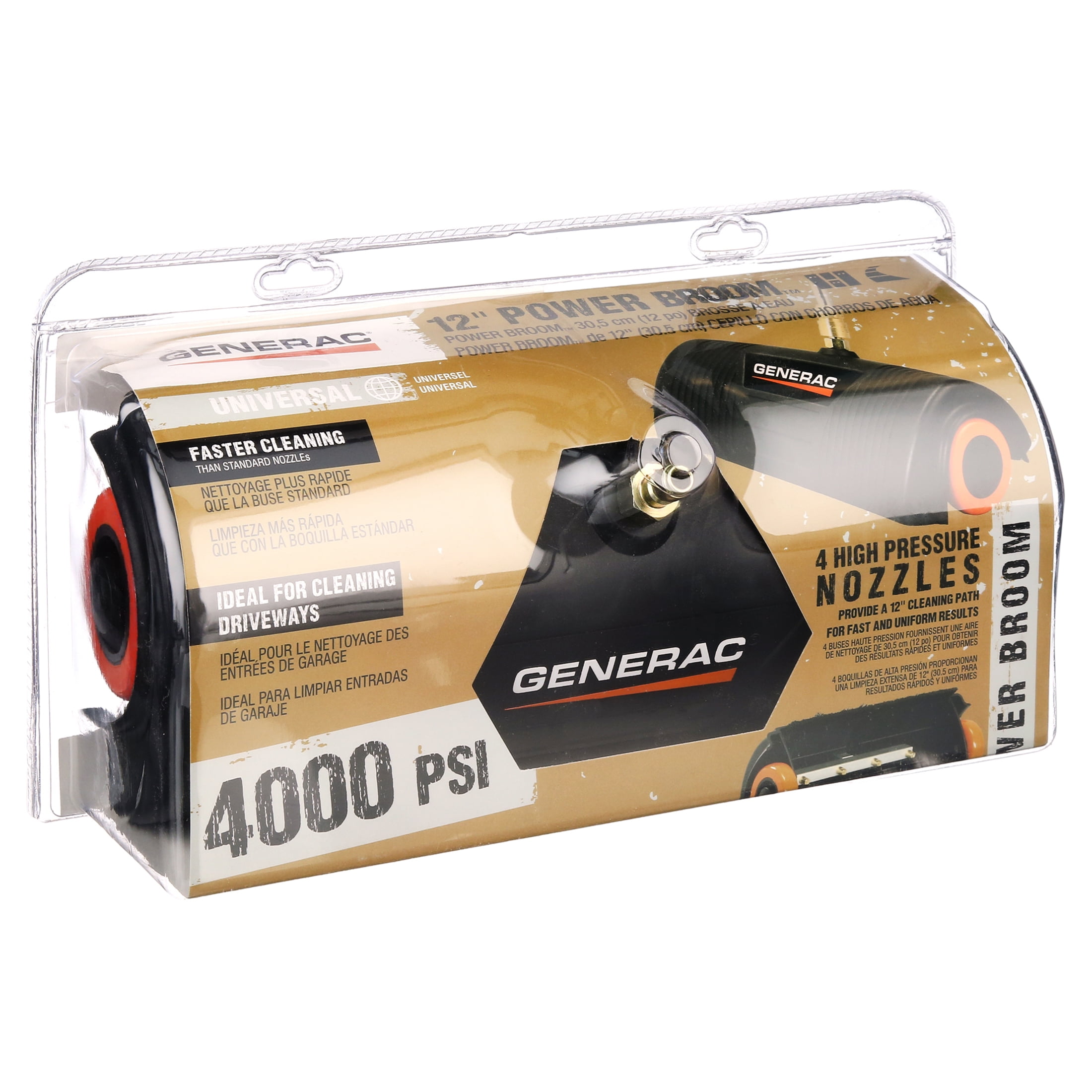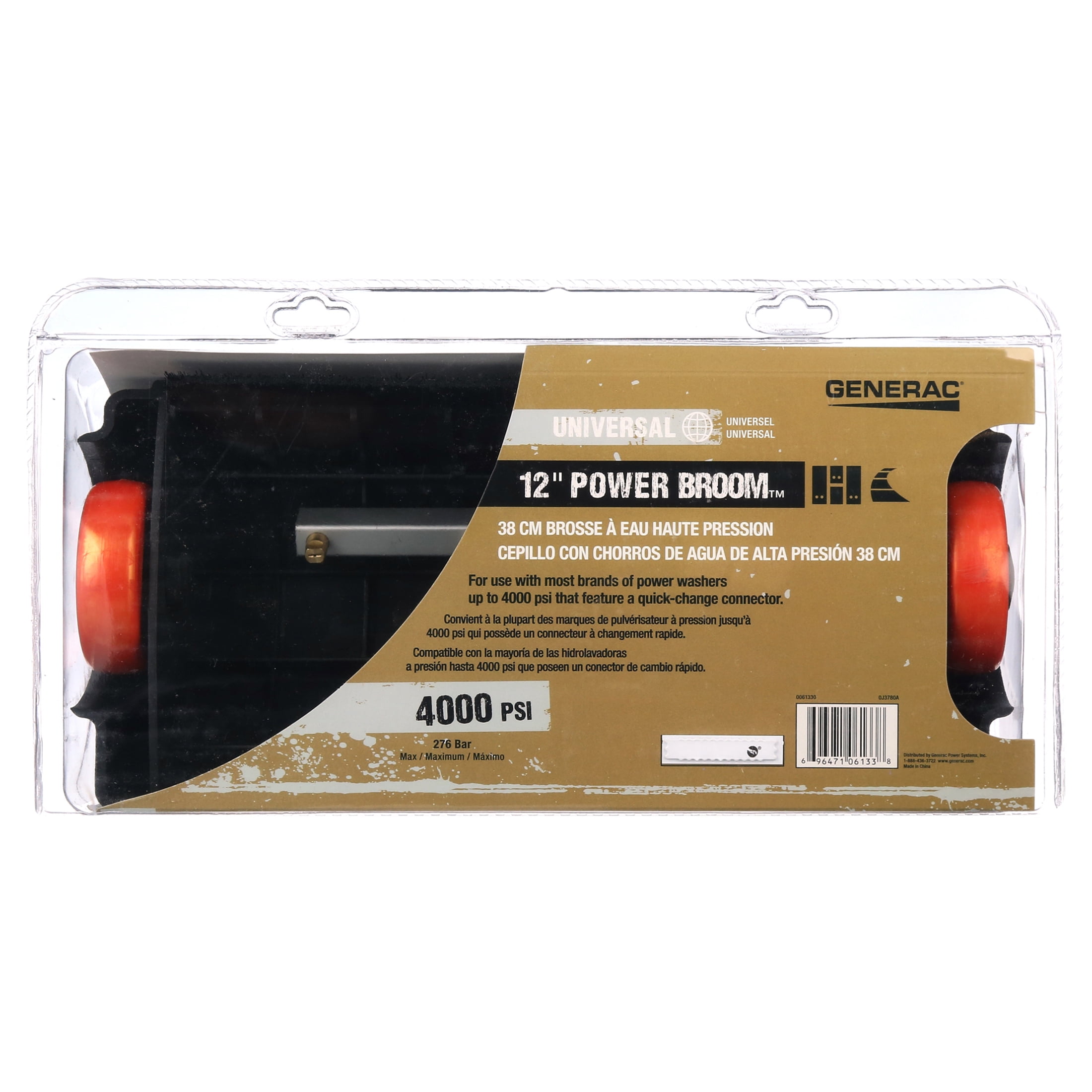 Generac 12″ Power Broom: Works with pressure washers rated up to 4000 PSI Cleans large areas faster than a standard spray nozzle 4 high-pressure nozzles provide a 12″ cleaning path Ideal for decks, patios and walkways Pressure washer power broom has a durable housing that minimizes over-spray Generac power broom has solid molded wheels for a smooth rolling motion Quick-change connector