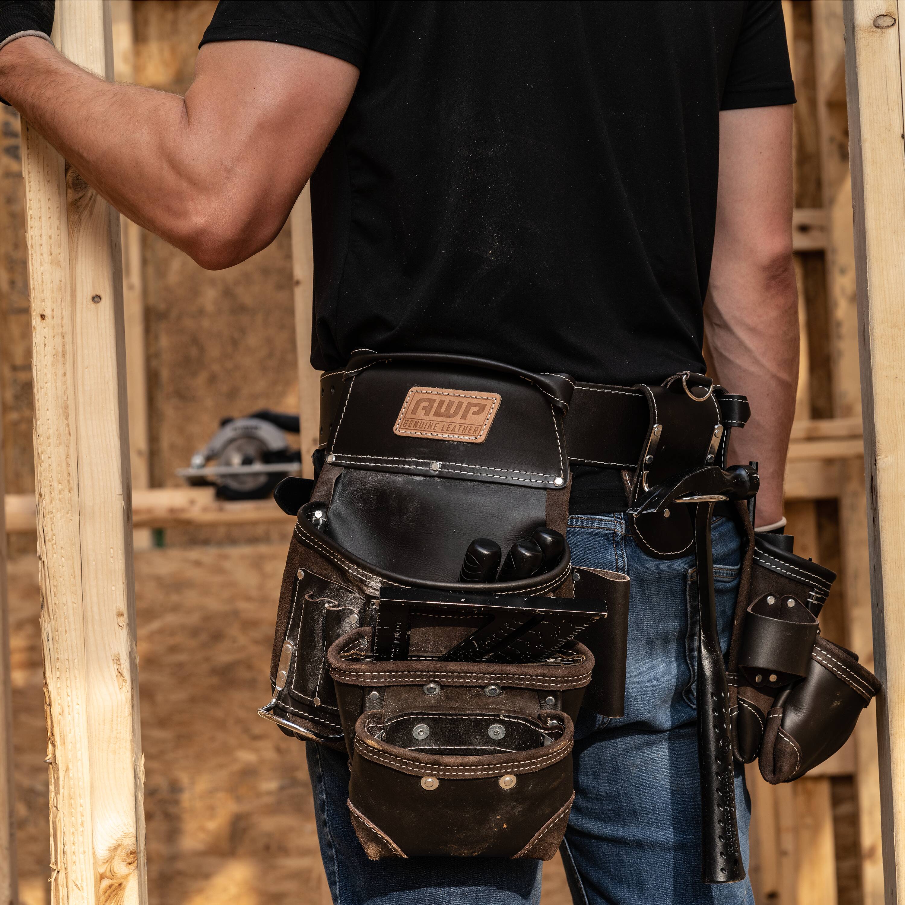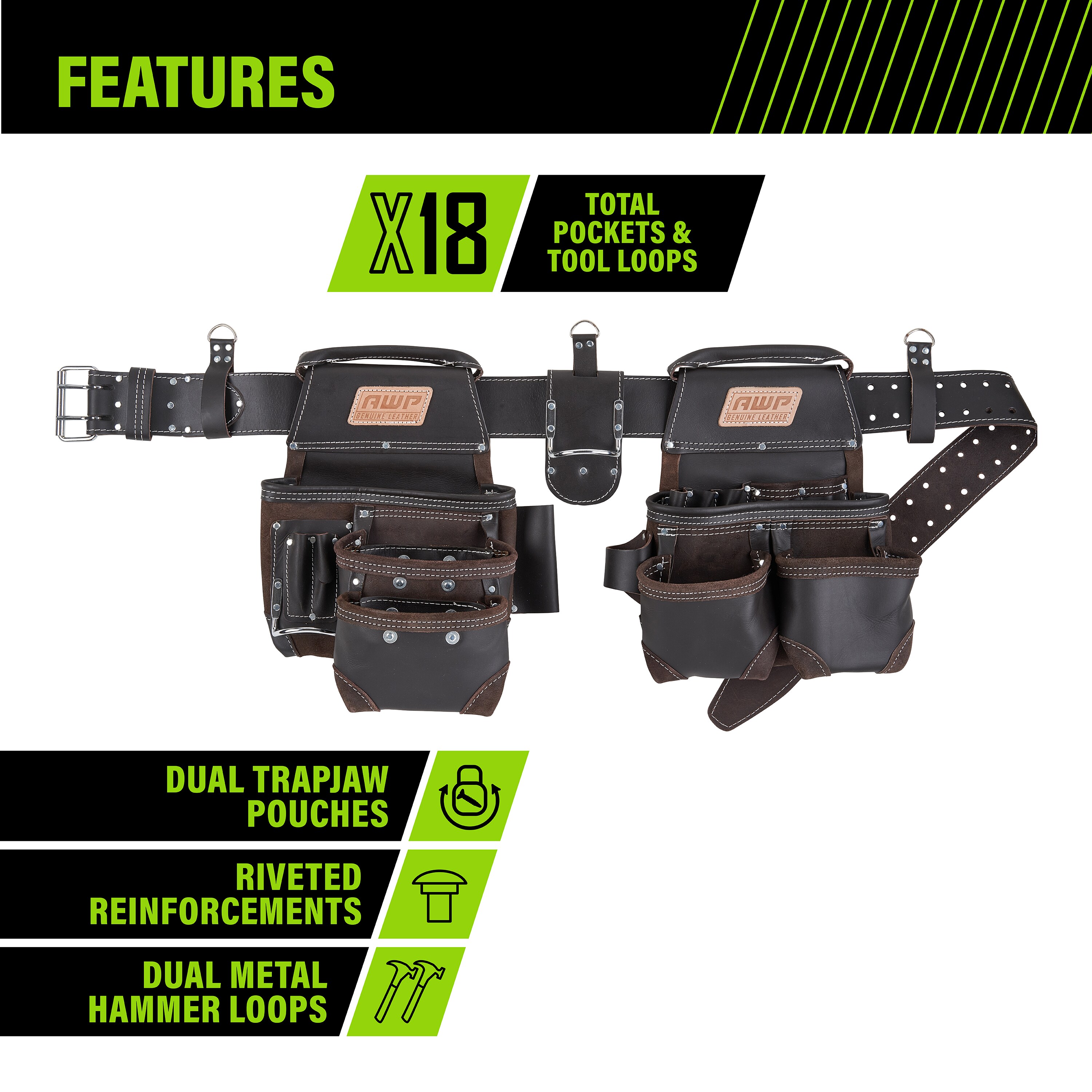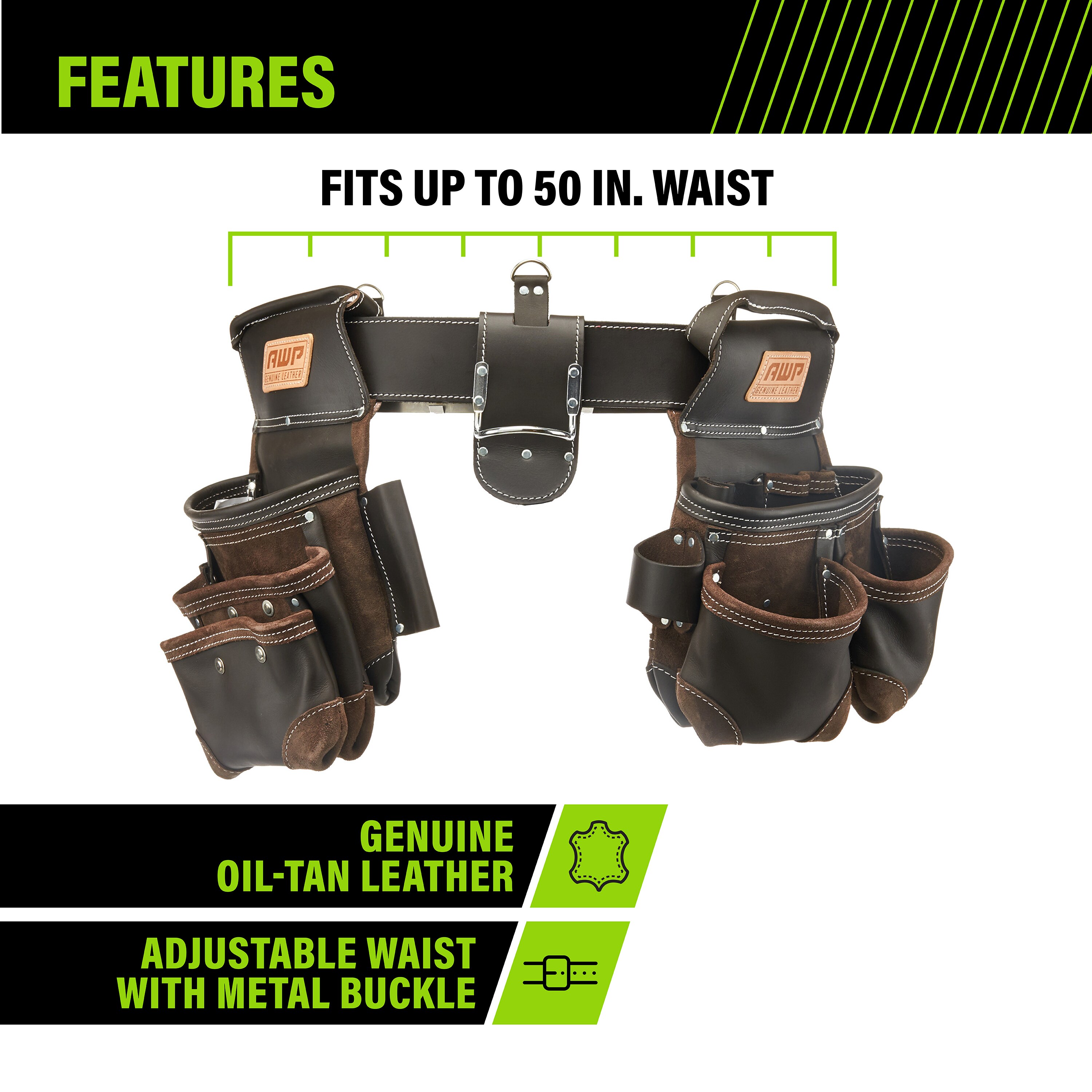 The AWP oil-tanned leather tool rig features the patented, Lowe’s exclusive TrapJaw™ technology on two of the pockets. TrapJaw™ snap open wide to provide easy-access and snap closed to secure small tools and fasteners inside. Made of premium oil-tanned leather for maximum durability. Two large capacity pouches, additional smaller capacity pockets and two metal hammer holders means you can carry plenty of hand tools on the jobsite. The belt fits waists up to 50 inches and has a double roller buckle so you can easily adjust to your size. Also includes d-rings to add the AWP padded suspenders (sold separately).