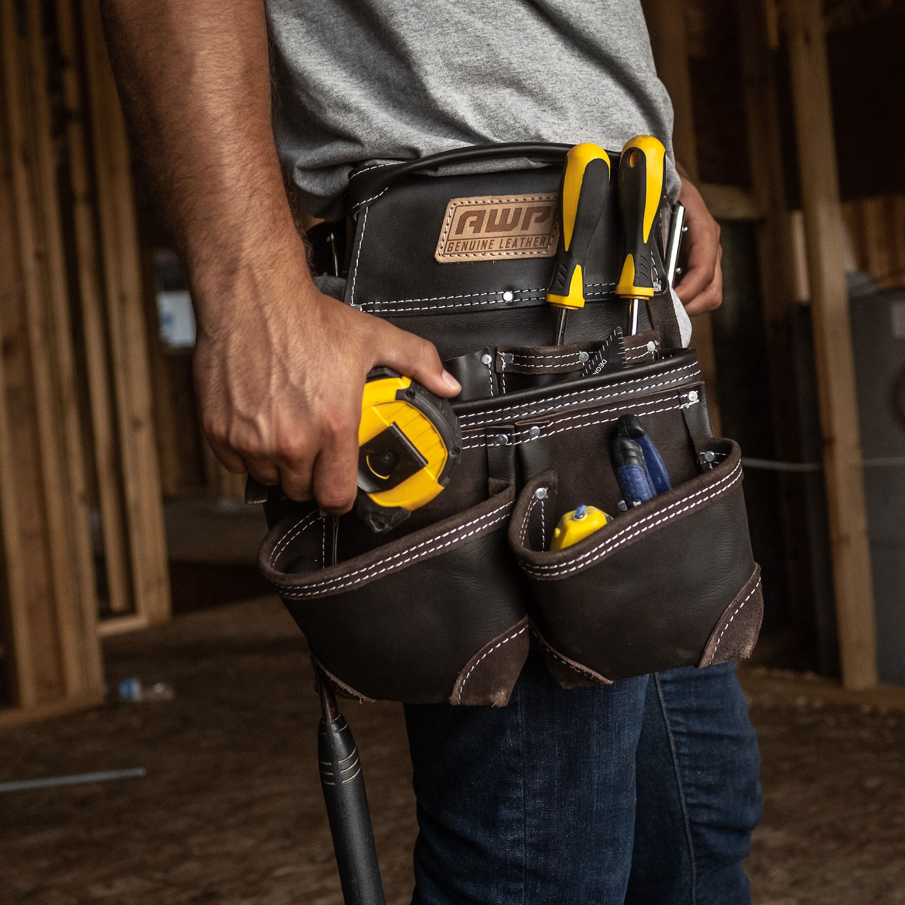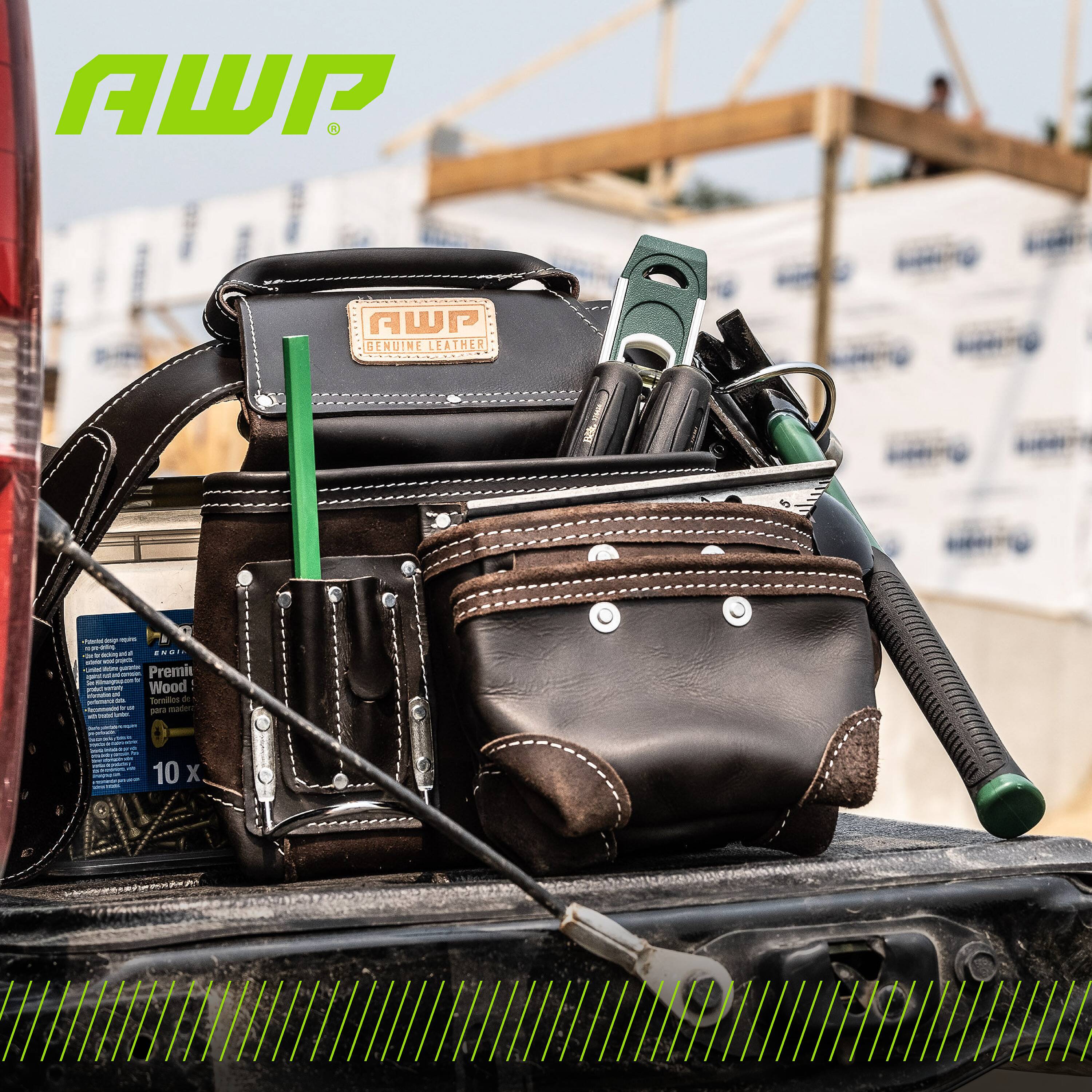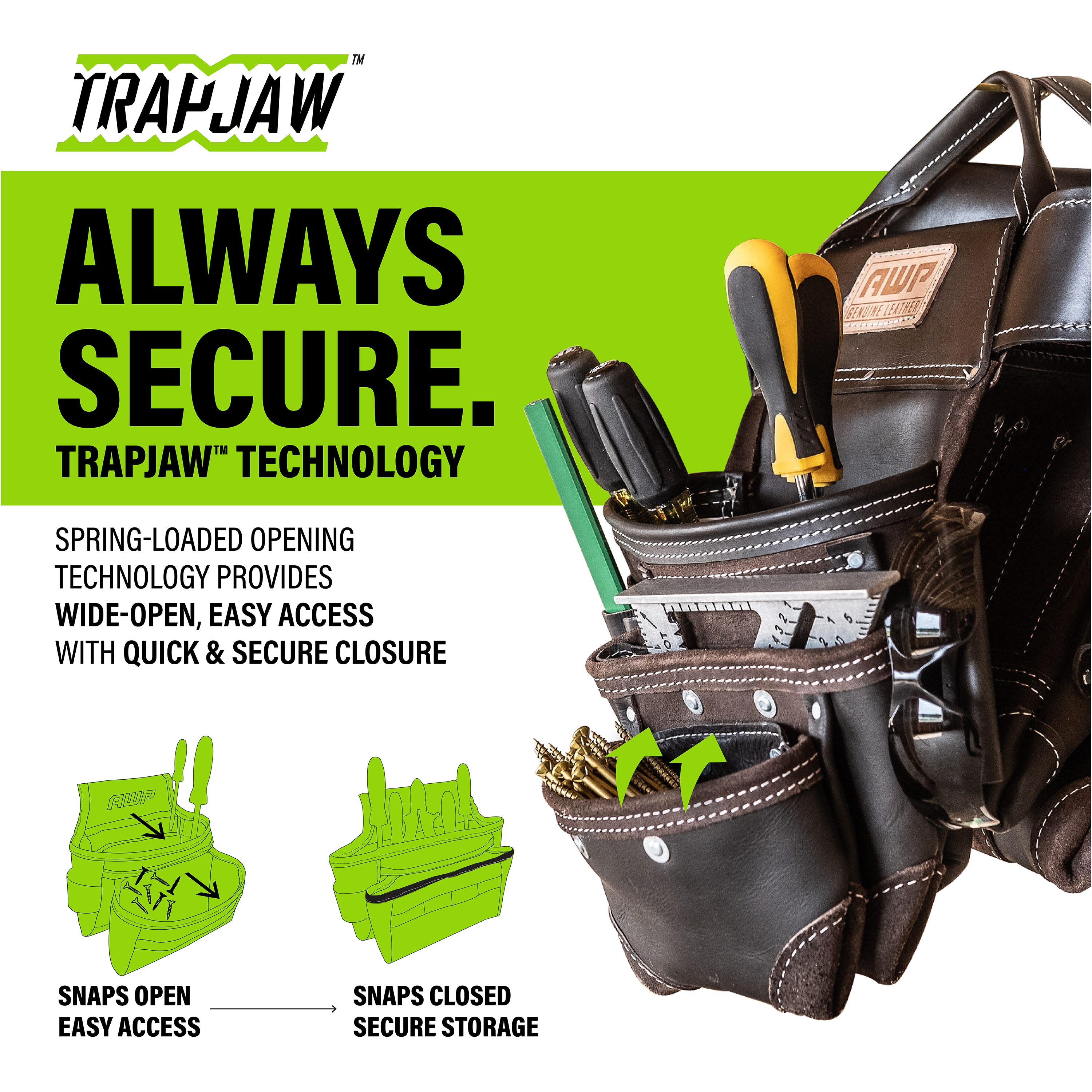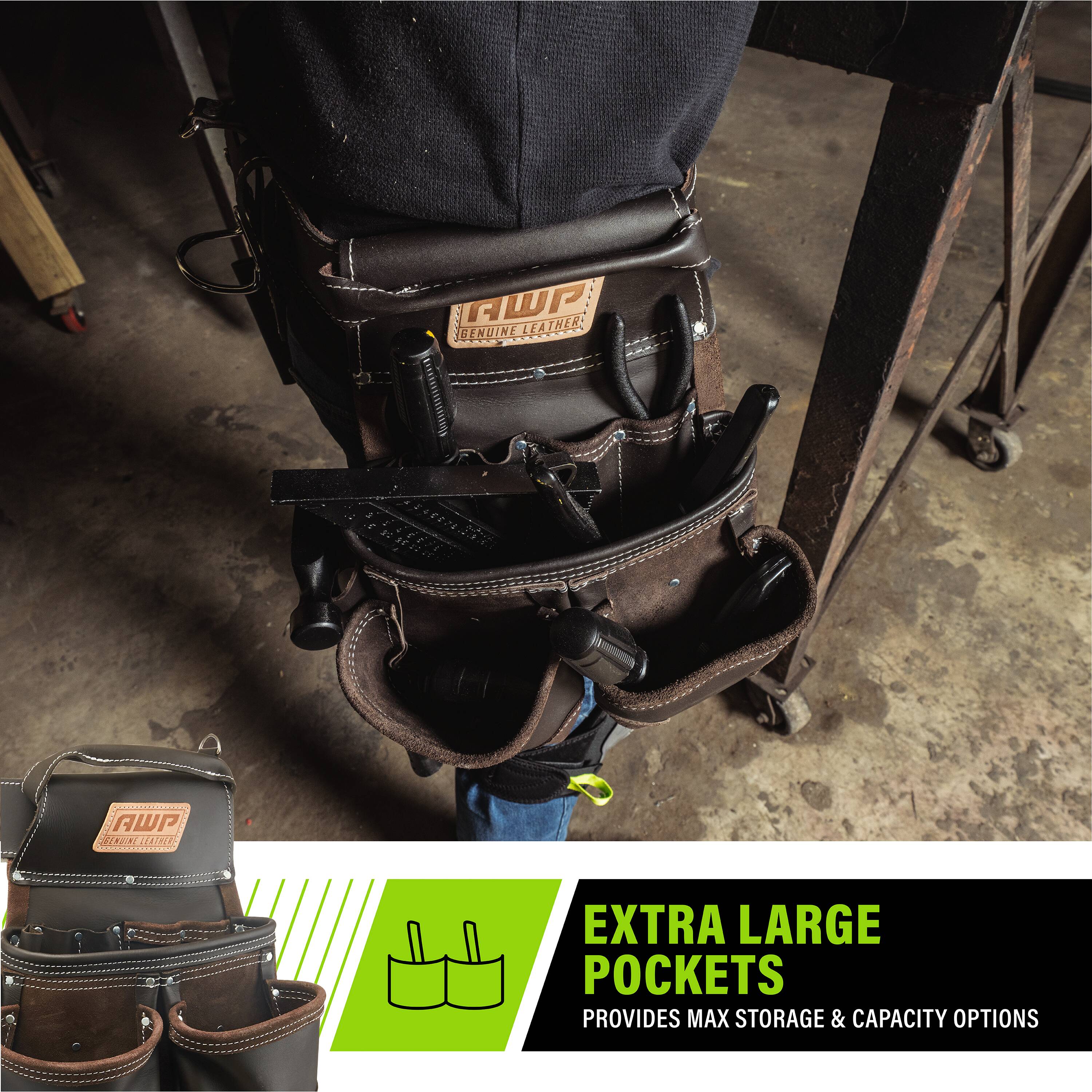 The AWP oil-tanned leather tool rig features the patented, Lowe’s exclusive TrapJaw™ technology on two of the pockets. TrapJaw™ snap open wide to provide easy-access and snap closed to secure small tools and fasteners inside. Made of premium oil-tanned leather for maximum durability. Two large capacity pouches, additional smaller capacity pockets and two metal hammer holders means you can carry plenty of hand tools on the jobsite. The belt fits waists up to 50 inches and has a double roller buckle so you can easily adjust to your size. Also includes d-rings to add the AWP padded suspenders (sold separately).
