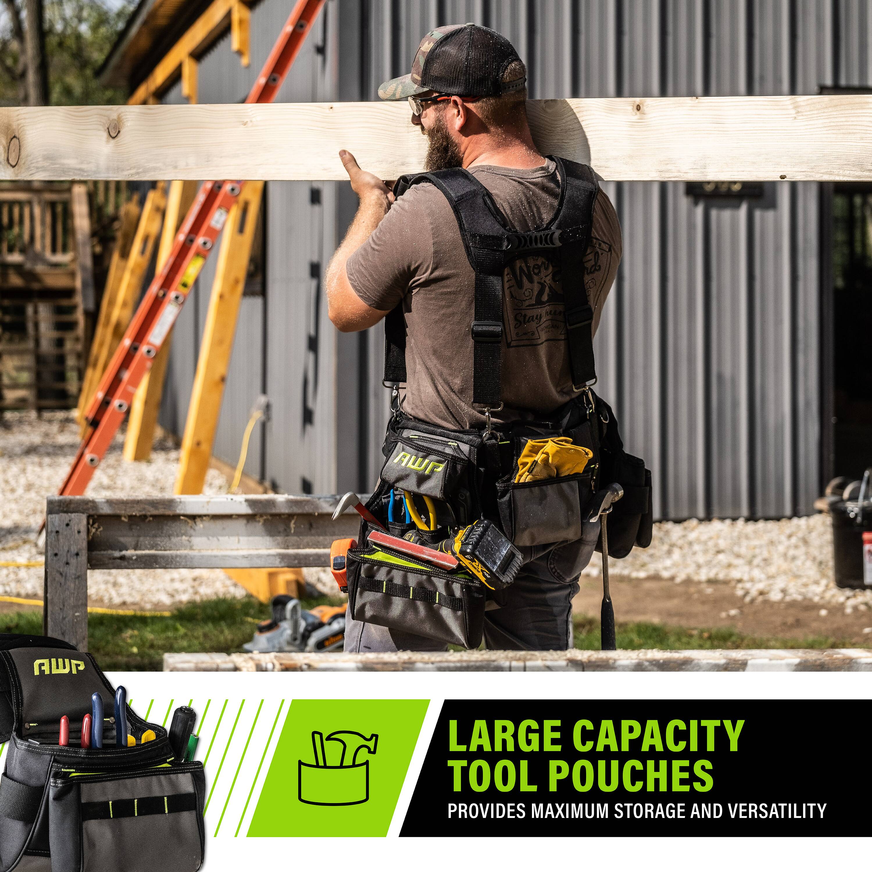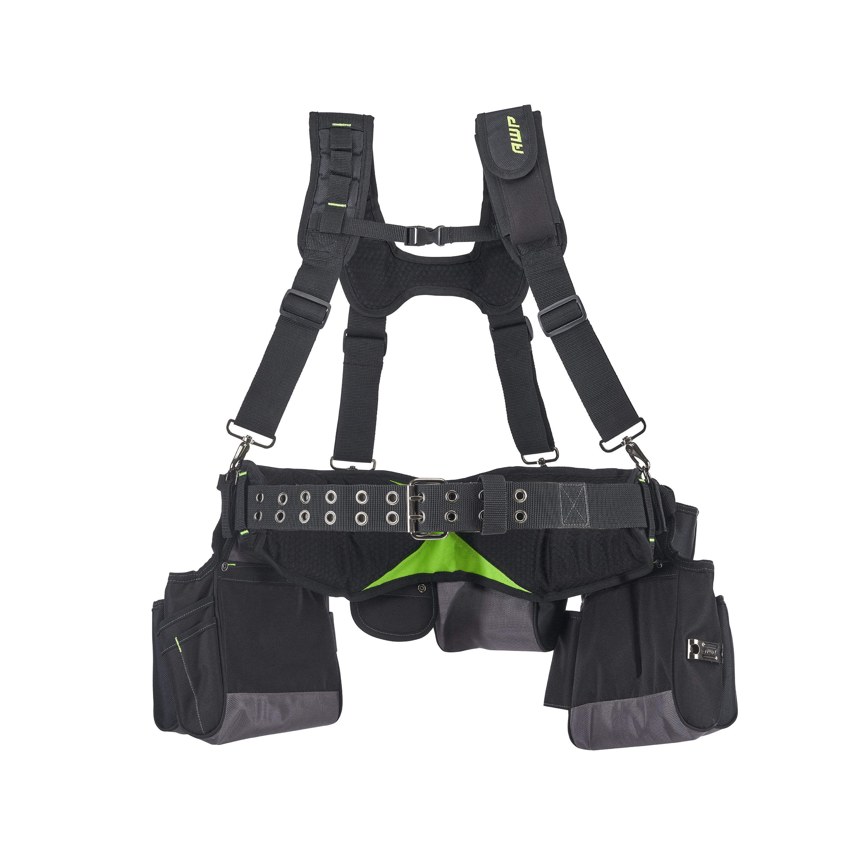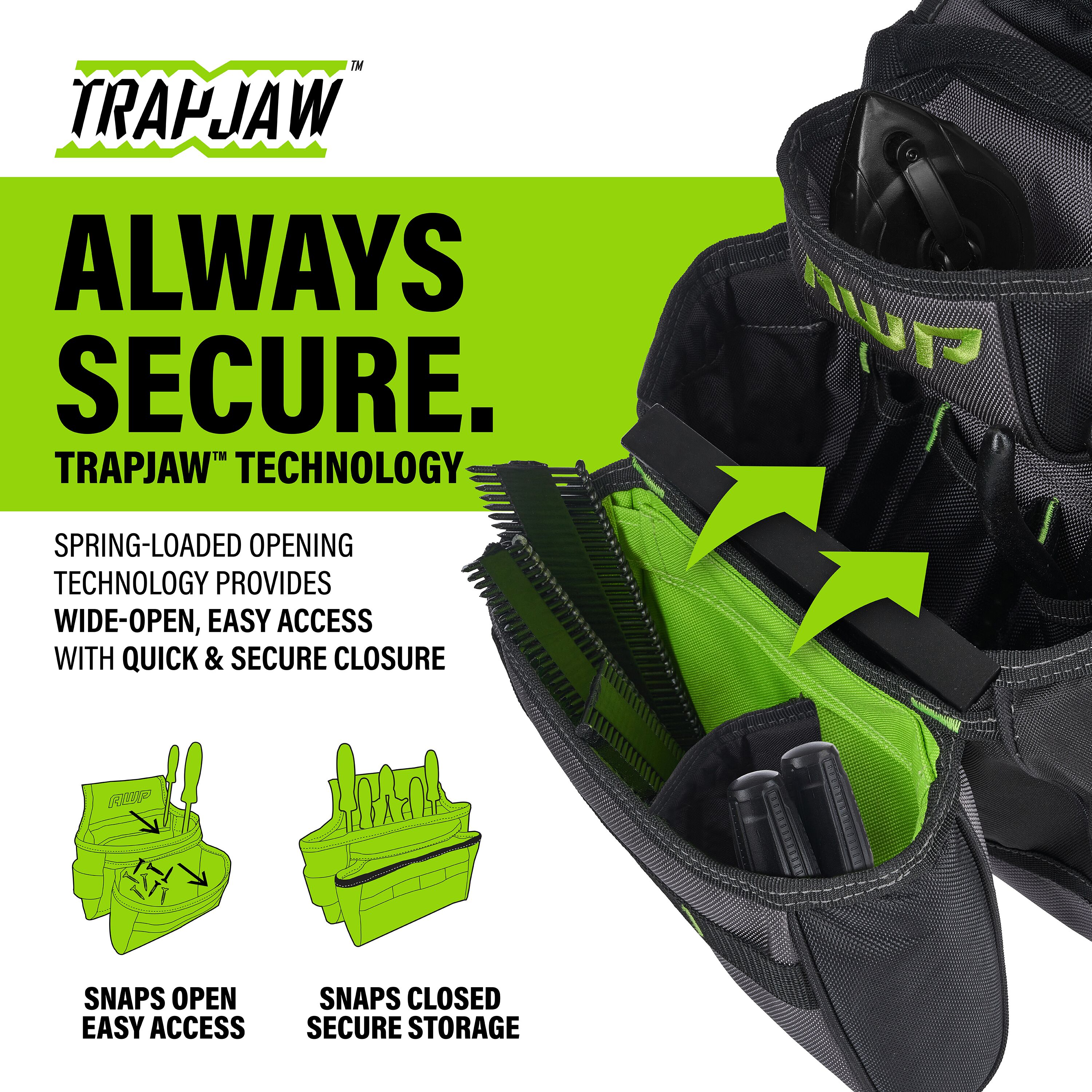 Featuring the innovative, spring-loaded technology from AWP, the Pro Framing Tool Rig includes 5 TrapJaw pouches that snap open wide to provide easy-access and snap closed to secure small tools and fasteners inside. Constructed of rugged, 1680 denier polyester with reinforced wear areas for long-term durability, this rig delivers a total of 20 pockets and sleeves to hold your tools. The dual speed square pockets, cell phone pocket, and multiple tool loops and pockets keep you organized on the job. A breathable air-mesh padded belt and suspenders distribute weight for all-day comfort.