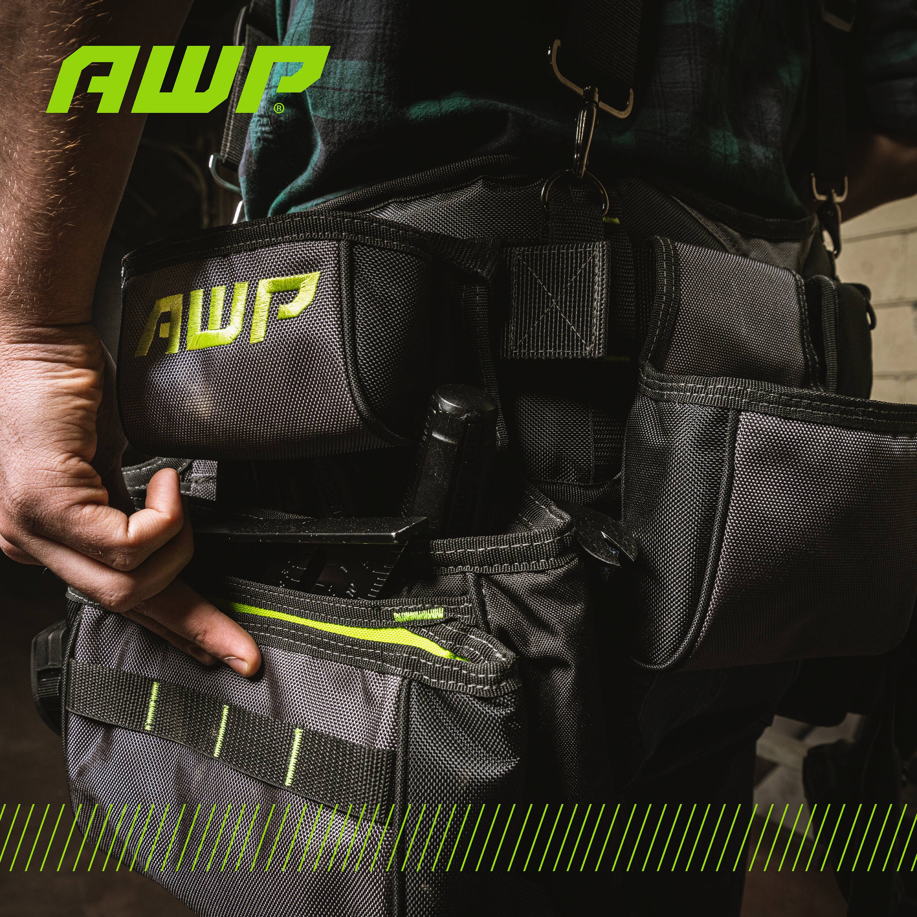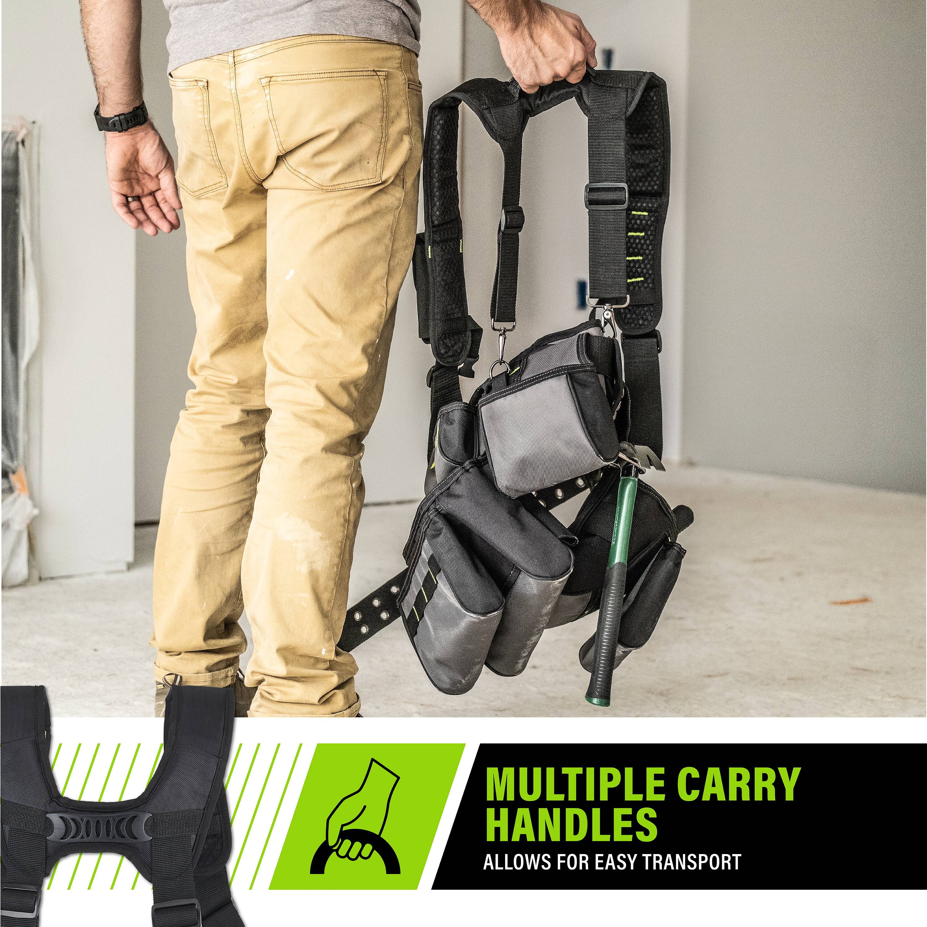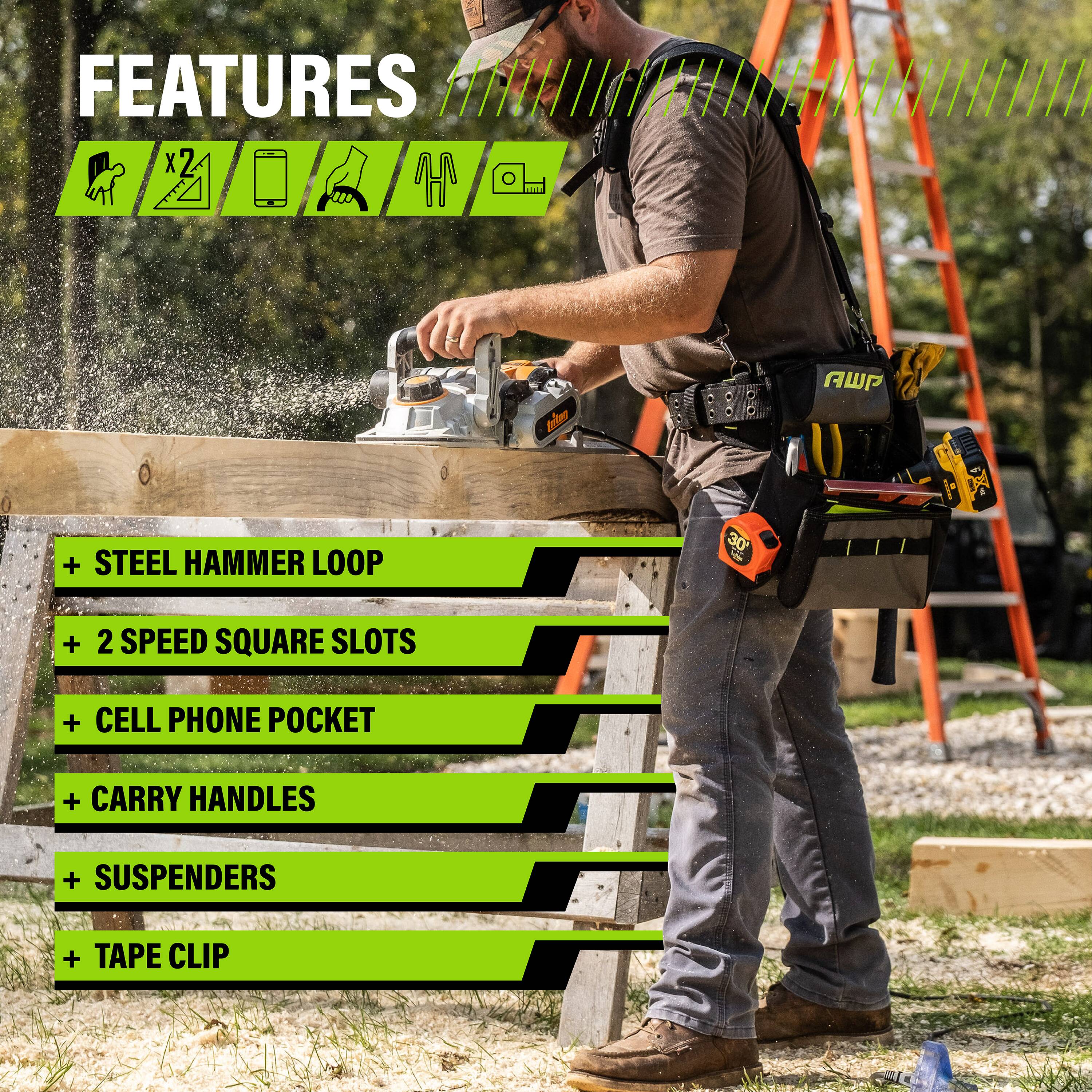 Featuring the innovative, spring-loaded technology from AWP, the Pro Framing Tool Rig includes 5 TrapJaw pouches that snap open wide to provide easy-access and snap closed to secure small tools and fasteners inside. Constructed of rugged, 1680 denier polyester with reinforced wear areas for long-term durability, this rig delivers a total of 20 pockets and sleeves to hold your tools. The dual speed square pockets, cell phone pocket, and multiple tool loops and pockets keep you organized on the job. A breathable air-mesh padded belt and suspenders distribute weight for all-day comfort.