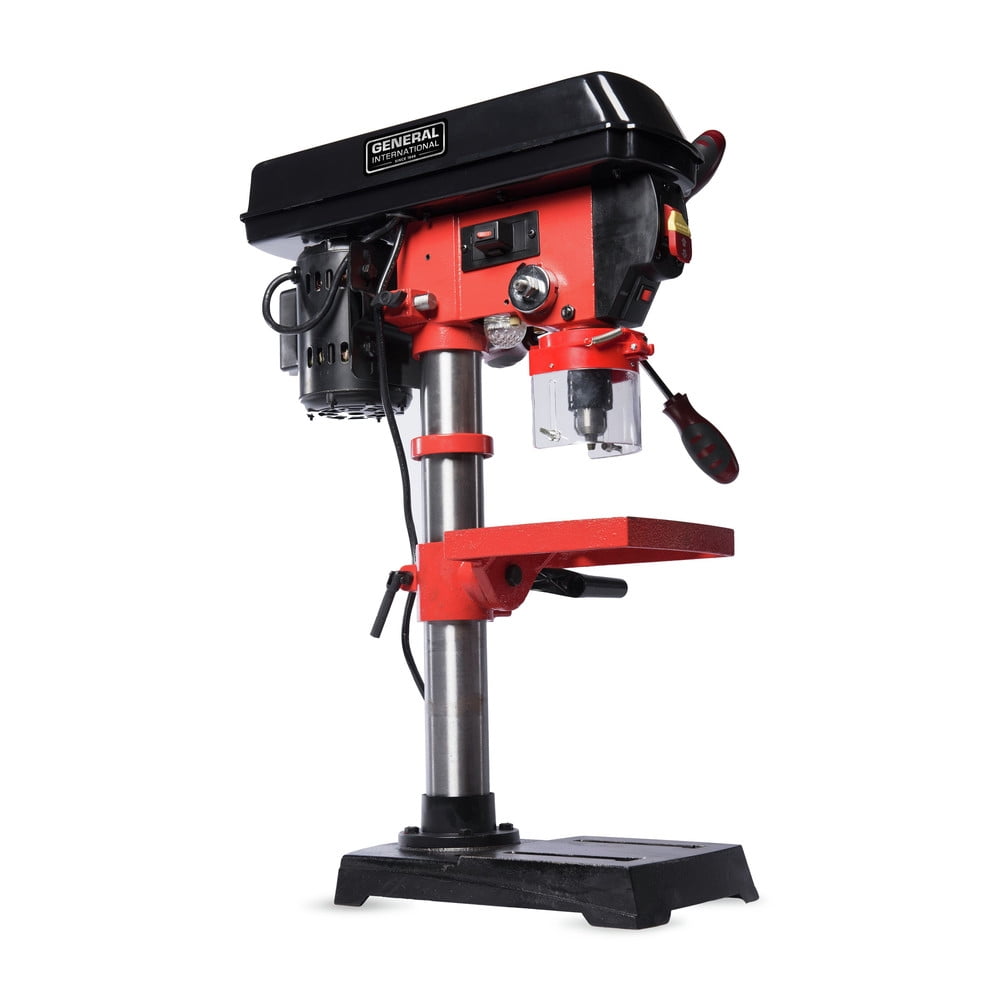 GENERAL INTERNATIONAL 10 inch 5 Speed Cast Iron base Drill Press delivers the power you need for your garage or work shop. This drill press is a Beast. Same column size as the General international DP2003 13″ stationary floor model. Loaded with features you would expect in a more industrial type drill presses. Choose from 5 speeds to perfectly match the ideal cutting conditions you need for your material. Featuring our global patented cross-pattern precision laser guide system and unique built-in LED work light, this drill press is perfect for home or worksite. General’s 10 inch swing drill press with laser centering device is a powerhouse for your shop. Packed with features that you’ll find in larger more industrial type drill presses. Power through metal, wood and other materials with ease. Change from five speeds to target the exact RPM right for your project (620-3100 RPM). Construction of solid cast iron provides sturdiness and reliability. Its powerful induction motor features ball bearings for an extended life, all combining together with smooth and balanced performance at any speed. The 1/2” chuck gives you versatility with a variety of bits. Worktable bevels 45° left and right for those tricky operations for the perfect angles consistently. Base has predrilled holes for mounting onto a bench or work stand. Our patented X-pattern laser locks-on to your drill points saving on guesswork and sparing expensive materials. A very versatile and valuable tool for any shop especially when you expand its range of use with optional accessories such as mortising attachment, drum sanders, circle cutters, etc… Since 1946 General has proudly produced innovative powered tools focused on value delivering meaningful features that will help you complete and enjoy the work as much as the project.