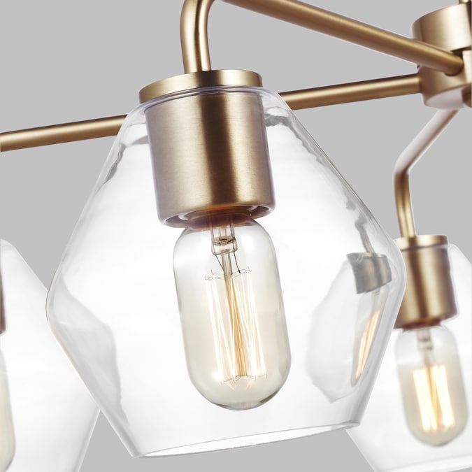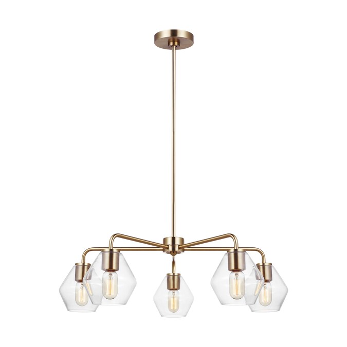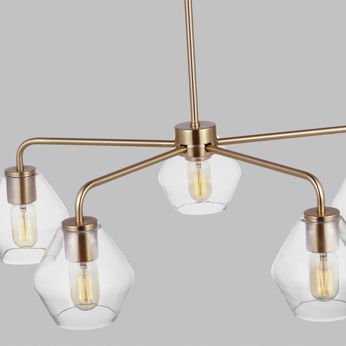 The Jett five light single tier chandelier in satin brass pairs the artful allure of modern sculpture with the function of a light fixture. This glass and metal combination is a perfect example of an industrial farmhouse lighting design.