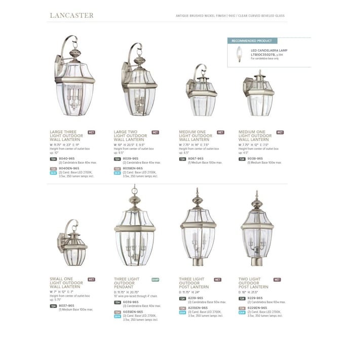 The Lancaster one light outdoor wall fixture in antique brushed nickel creates a warm and inviting welcome presentation for your home’s exterior. Light has a way of sparkling against glass to create a warm and inviting welcome, and the Lancaster outdoor collection by is a classic example of such traditional design. Clear Curved Beveled glass is paired with one of four beautiful finish options including Polished Brass, Black, Antique Bronze and Antique Brushed Nickel. The assortment includes small, medium and large one-light outdoor wall lanterns, two-light outdoor wall lantern, three-light outdoor wall lantern, two-light and three-light outdoor post lanterns and a three-light outdoor pendant. Some of the fixtures can easily convert to LED by purchasing LED replacement lamps sold separately.