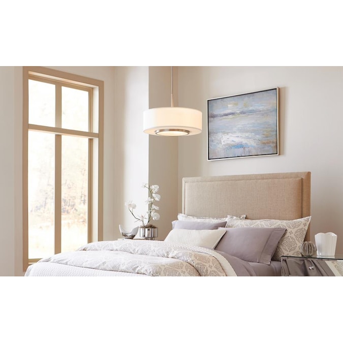 The Nance three light indoor pendant in brushed nickel enhances the beauty of your home with ample light and style to match today’s trends. The mid-century inspired Nance lighting collection by is a versatile transitional design which fits in a wide array of traditional or contemporary settings. The tapered, off-white, faux silk shades add warmth and sophistication. The large pendant and semi-flush faux silk drum shades are complemented nicely with Satin Etched Opal glass diffusers to soften the downlight. In either of the available Brushed Nickel or Heirloom Bronze finishes, all the Nance fixtures are timeless additions to any foyer, kitchen or dining area. The assortment includes three- five- and nine-light chandeliers; a one-light wall sconce; two- and three-light bath vanities and a two-light semi-flush convertible drum pendant. Incandescent and ENERGY STAR-qualified LED lamping are available; all fixtures are California Title 24 compliant.