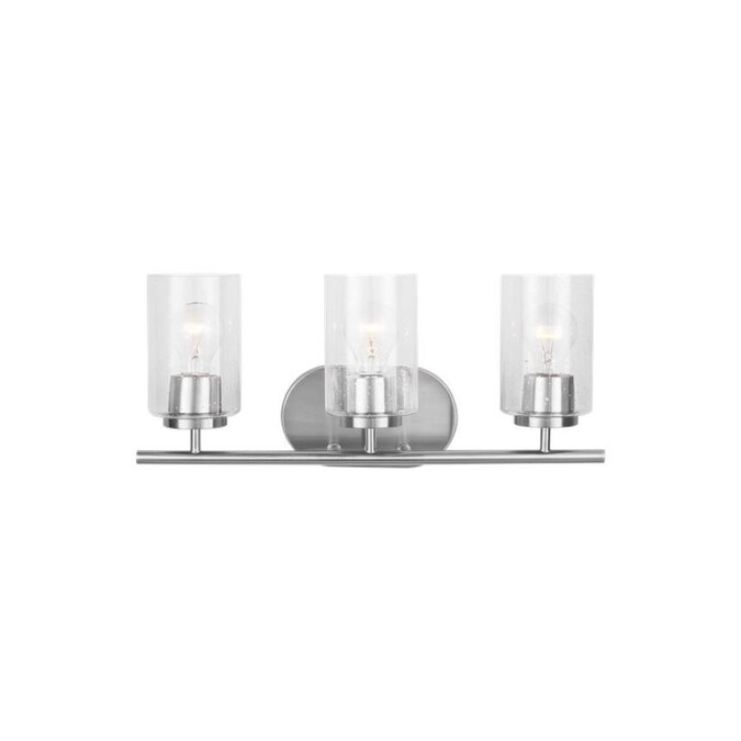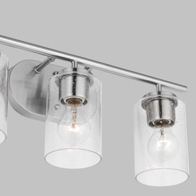 The Oslo three light vanity fixture in Brushed Nickel offers shadow-free lighting in your powder room, spa, or master bath room. The Oslo lighting collection by is a sleek design, with smooth and clean lines. The Clear Seeded glass adds to this collection’s contemporary and minimalist character. Offered in Chrome, Brushed Nickel, Bronze and Midnight Black finishes, the collection includes nine-, five-, and three-light chandeliers, mini pendant, both flush and semi-flush ceiling fixtures, as well as one-, two-, three- and four-light wall/bath fixtures. Both incandescent lamping and ENERGY STAR-qualified LED lamping are available. All fixtures are California Title 24 compliant.