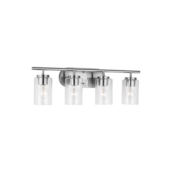The Oslo four light vanity fixture in Brushed Nickel offers shadow-free lighting in your powder room, spa, or master bath room. The Oslo lighting collection by is a sleek design, with smooth and clean lines. The Clear Seeded glass adds to this collection’s contemporary and minimalist character. Offered in Chrome, Brushed Nickel, Bronze and Midnight Black finishes, the collection includes nine-, five-, and three-light chandeliers, mini pendant, both flush and semi-flush ceiling fixtures, as well as one-, two-, three- and four-light wall/bath fixtures. Both incandescent lamping and ENERGY STAR-qualified LED lamping are available. All fixtures are California Title 24 compliant.
