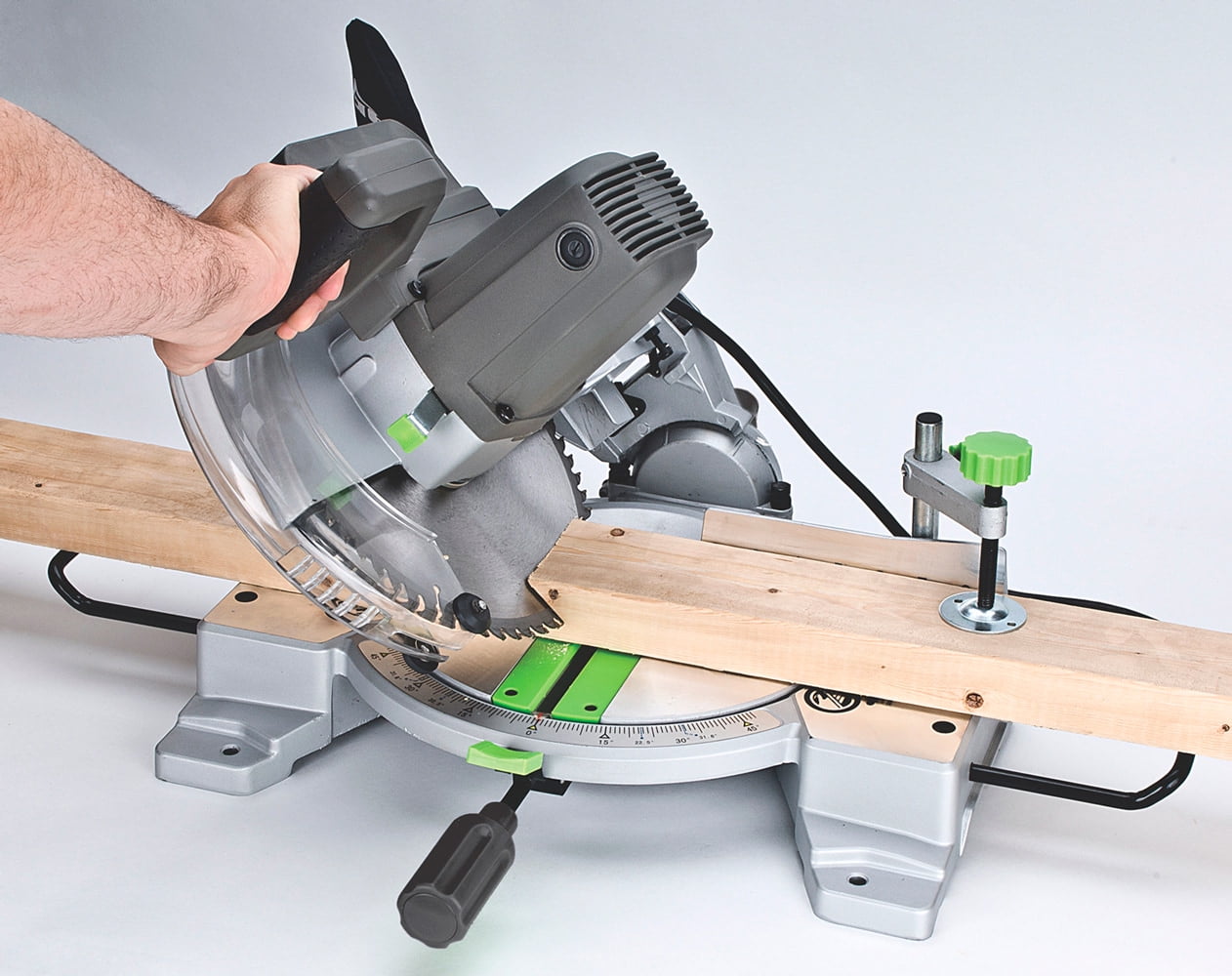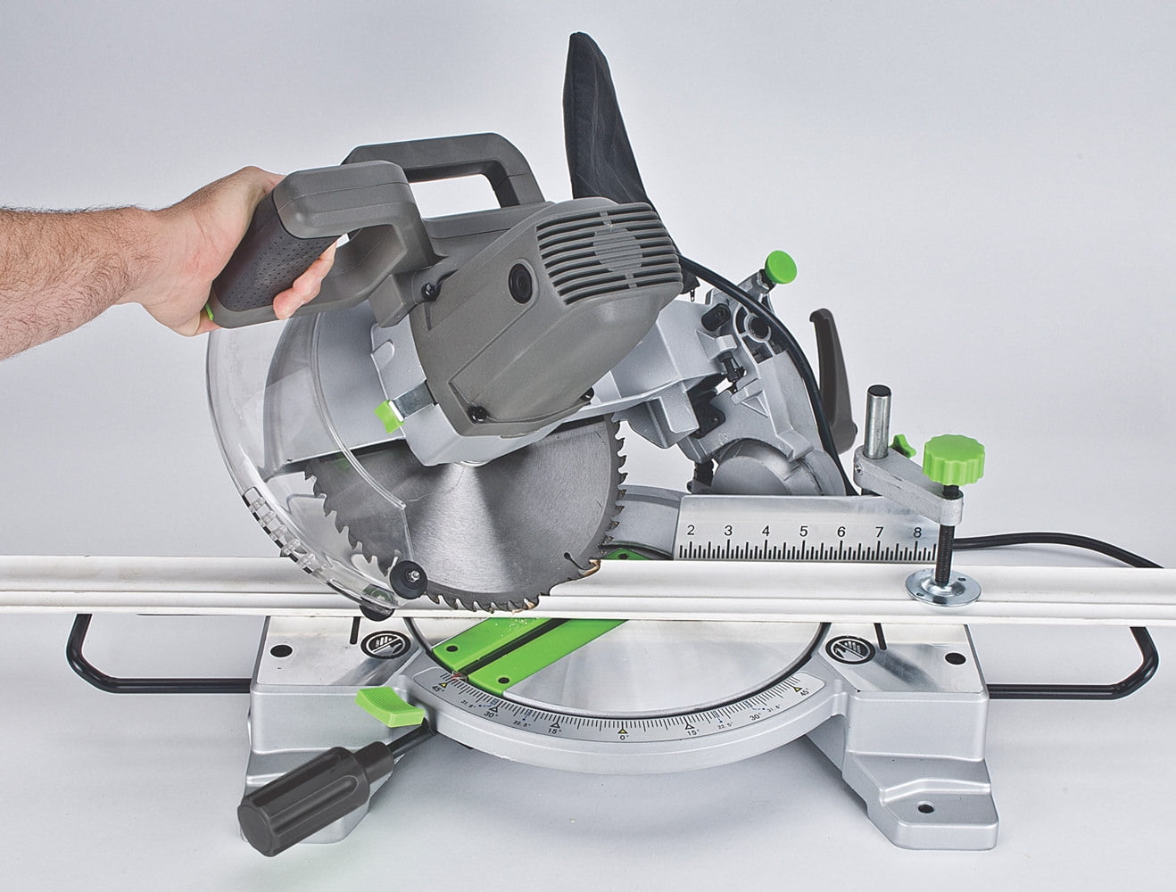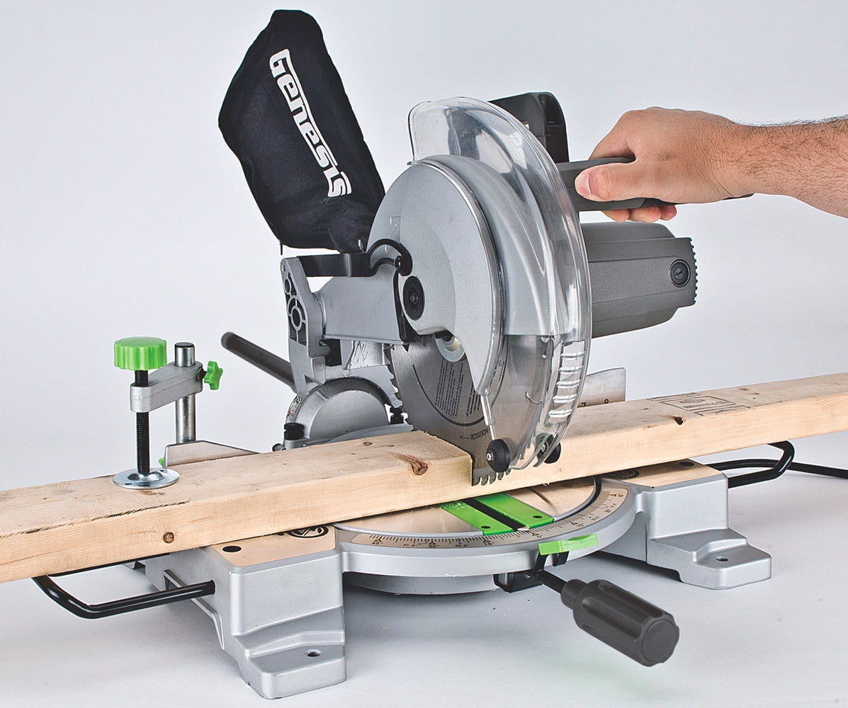 Genesis 10″ Compound Miter Saw (92552E) with Laser: Make precision miter cuts up to 45 degrees left and right, with 9 position stops at commonly used angles Sliding compound miter saw helps you make bevel cuts up to 45 degrees left Use compound cutting for crown molding, shadow boxes, picture frames and more Laser-light cutting guide for quicker alignment and improved accuracy Genesis miter saw has a die-cast aluminum base for portability Electric brake stops the blade in seconds Spindle lock for quick blade changes 120V/60Hz 15A 4,600 rpm Arbor size: 5/8″ CSA certified Includes: 60T carbide tipped blade installed, hold-down clamp, dust bag, 2 extension wings, two AAA batteries for laser and blade wrenches