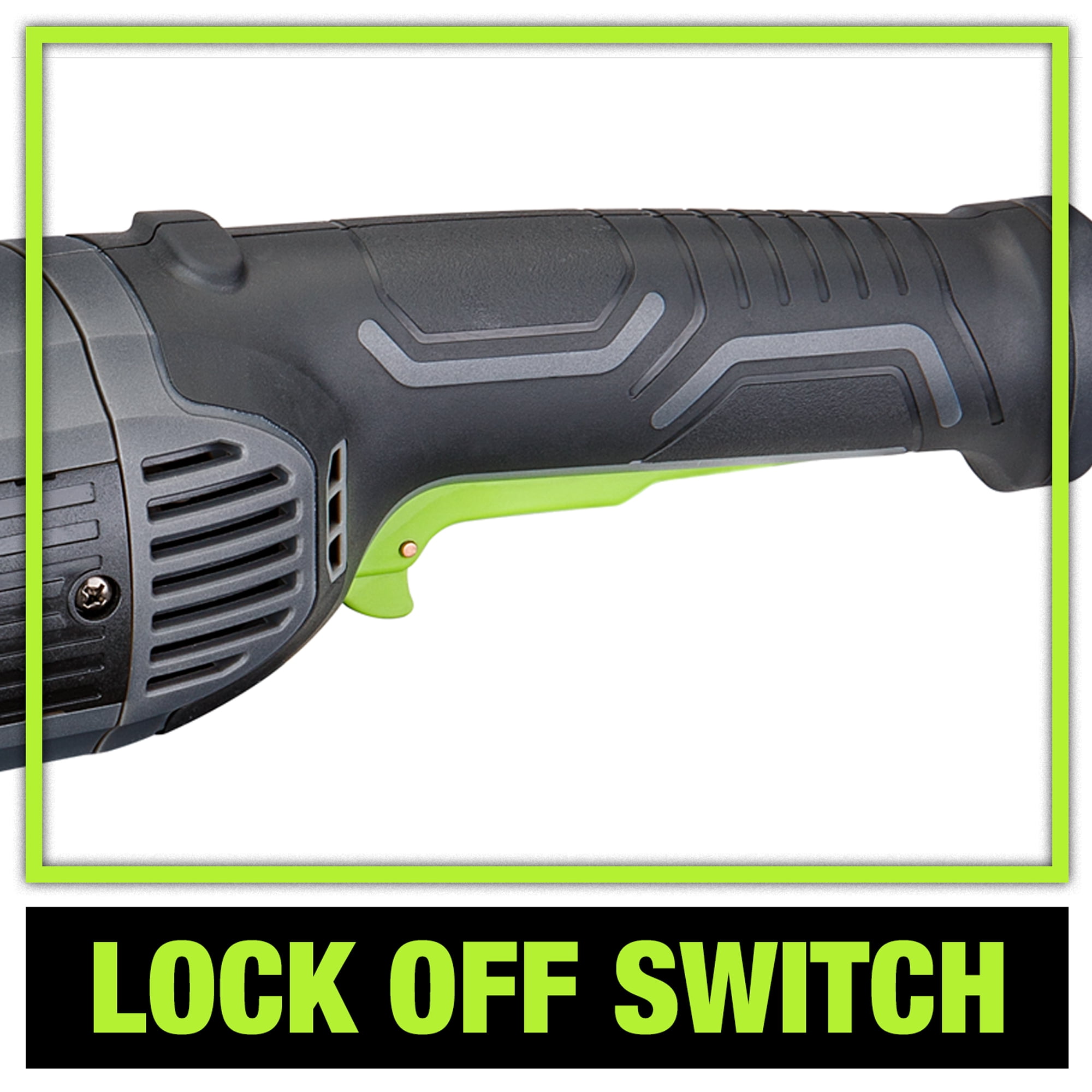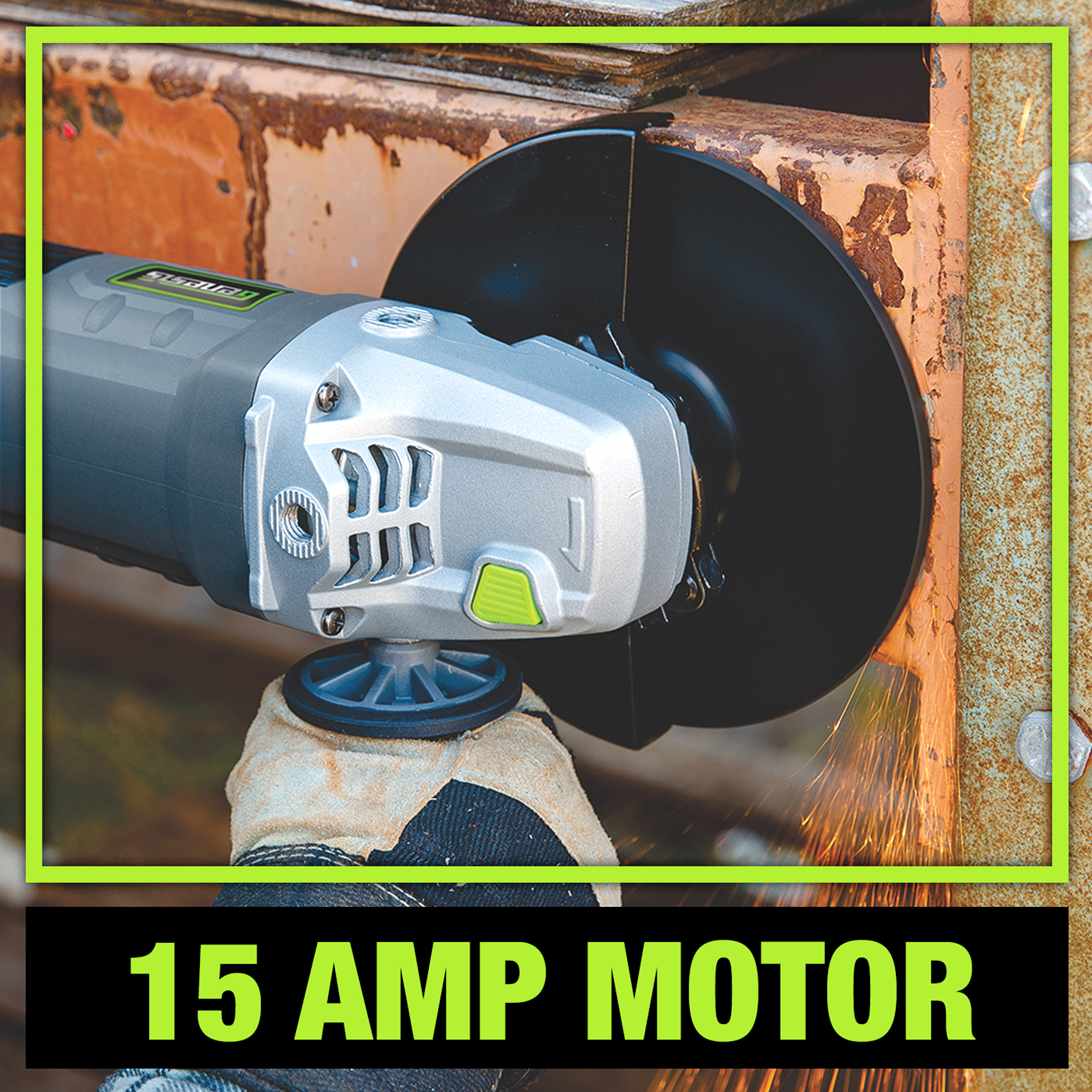 8,500 RPM for Fast Grinding, Cutting, and Cleaning of Metals Cut Tile, Stone, Brick, and Cement Block or Remove Mortar using an optional Masonry Cutting Blade Lock-On Power Switch Reduces Fatigue During Extended Use Spindle Lock for Fast and Easy Wheel Changes Tool-Free Wheel Guard Adjustment Includes: 3-Position Auxiliary Side Handle, Grinding Wheel, Wheel Guard, Spanner Wrench, and Operator’s Manual