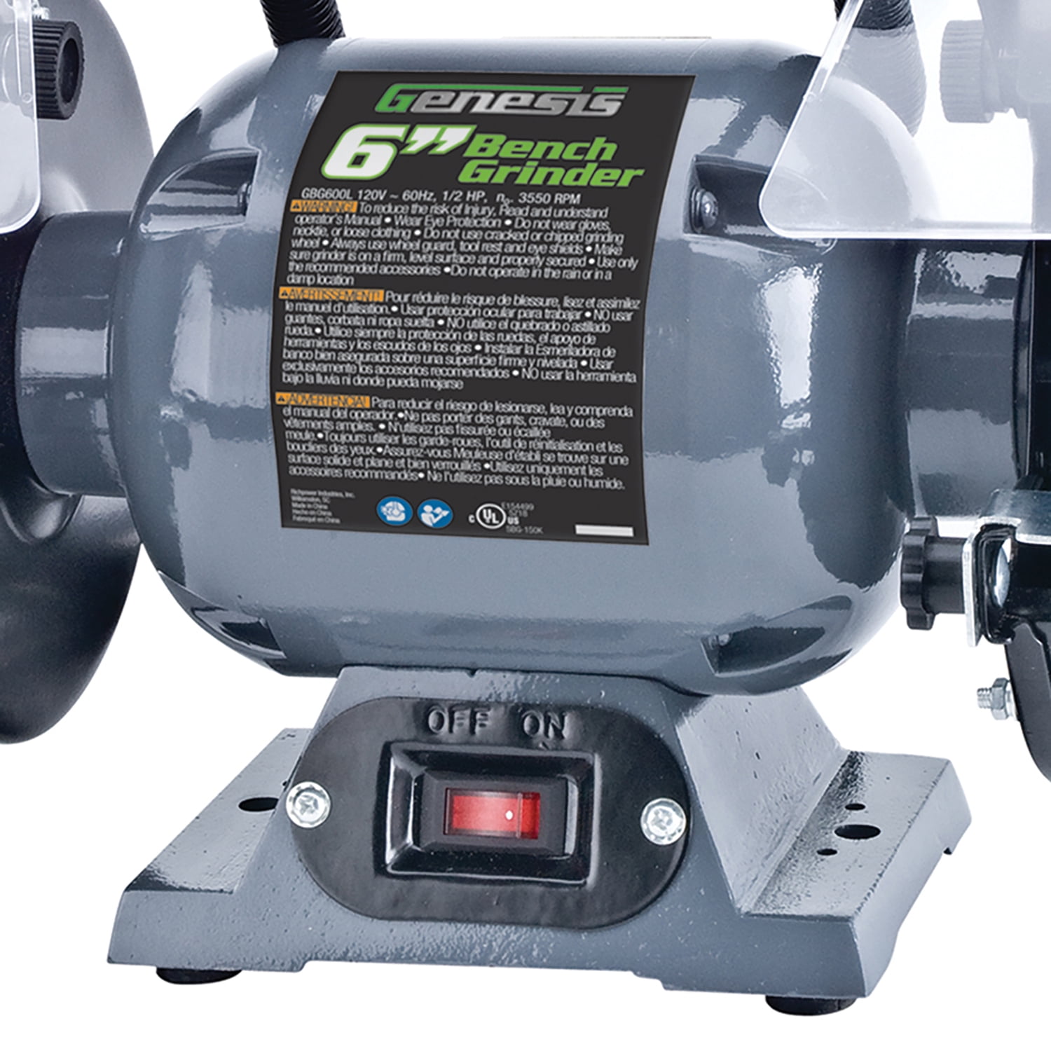 The Genesis GBG600L 6-In. Bench Grinder with Lights is an indispensable shop tool for anyone grinding, sharpening, or refurbishing metal. A 1/2-HP induction motor and heavy cast-iron base make this a smooth, quiet and stable machine. For your convenience and comfort, eye shields, adjustable tool rest, and 2 flexible gooseneck lights are included. The 1/2-in. shaft will accommodate all standard 6-in. bench grinder accessories. A 36G wheel, 60G wheel, and 2 light bulbs are also included with this Genesis Bench Grinder. Genesis has a toll-free hotline and a USA-based customer service team that can be reached at 888-552-8665. You can be assured of a great customer service experience!