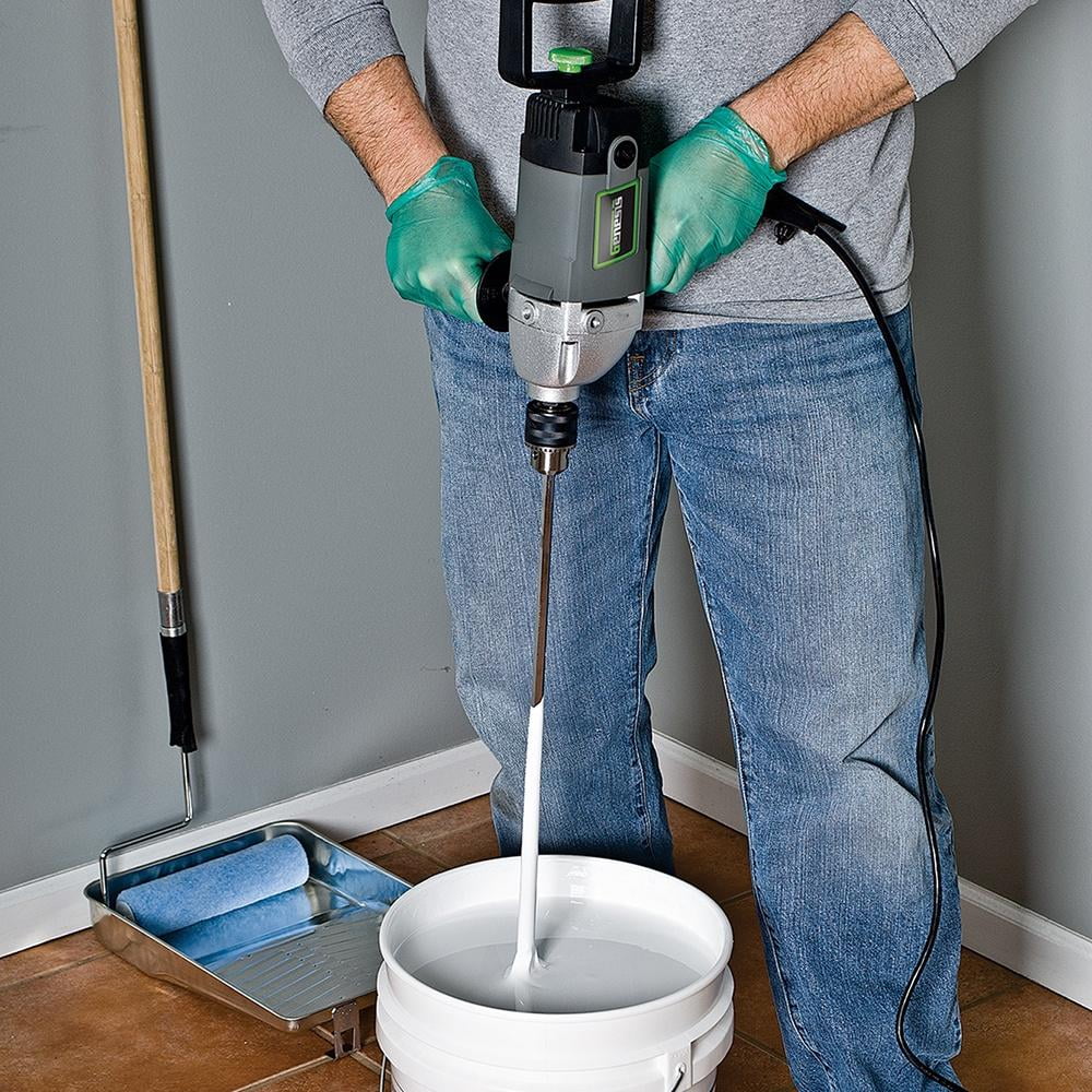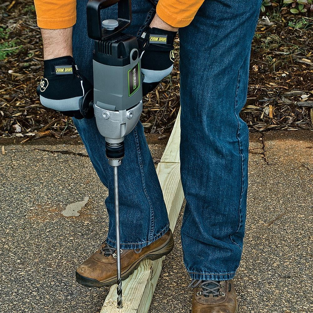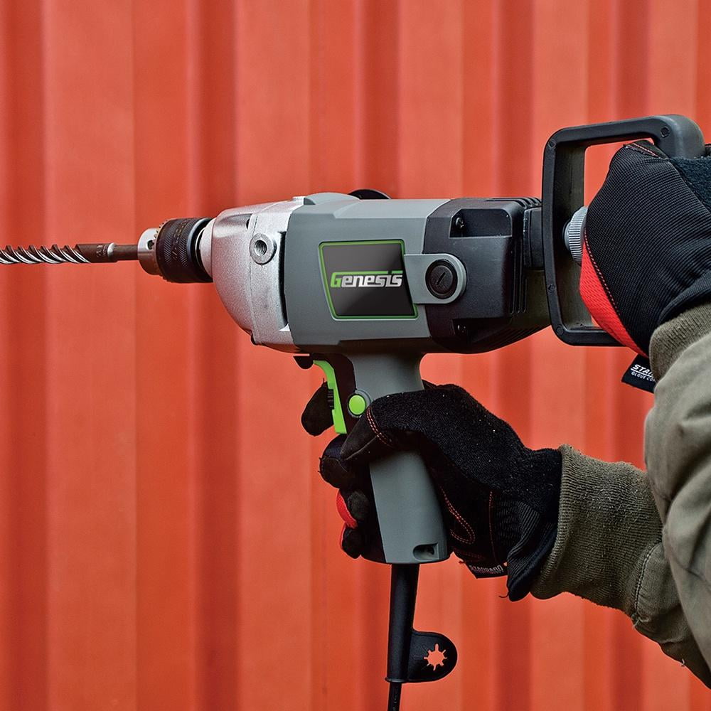 Powerful 9.0 amp motor. 1/2″ metal keyed chuck accepts large diameter bits. Lock-on button for extended use. The Die-cast aluminum gear housing for durability. You can mix sheet rock mud with the Genesis� Spade Handle Drill with ease instead of by hand. 2 -position rear spade handle for greater control. 3-position auxiliary handle. Externally accessible brushes for easy inspection and replacement. Includes: auxiliary handle, rear spade handle and chuck key with holder.