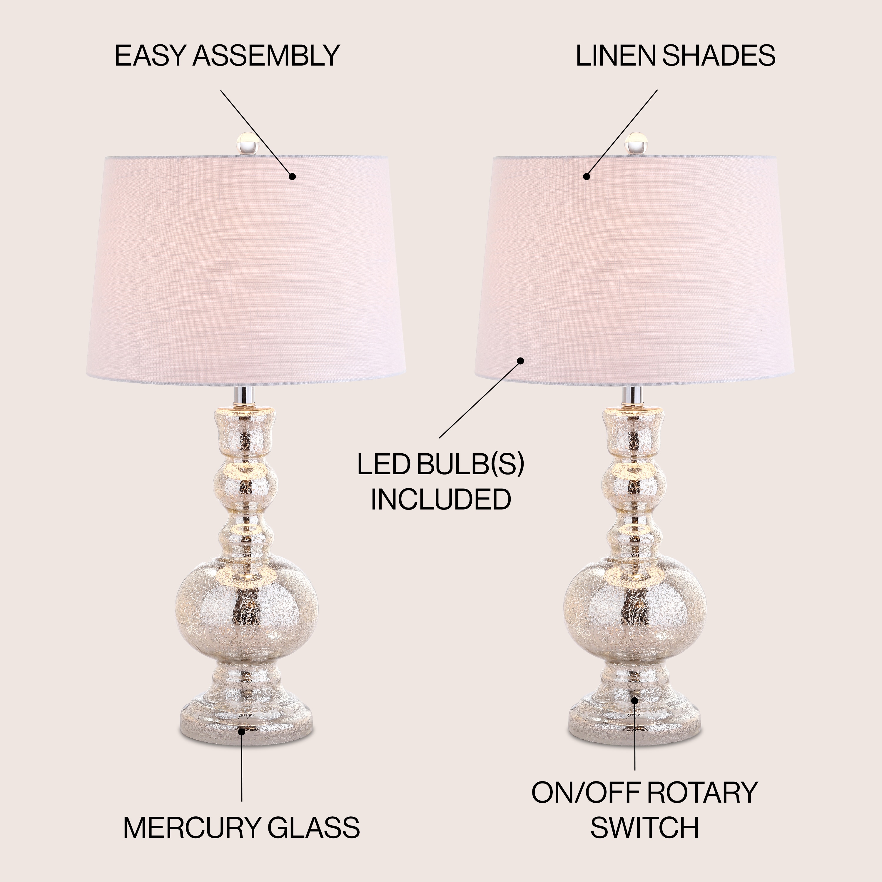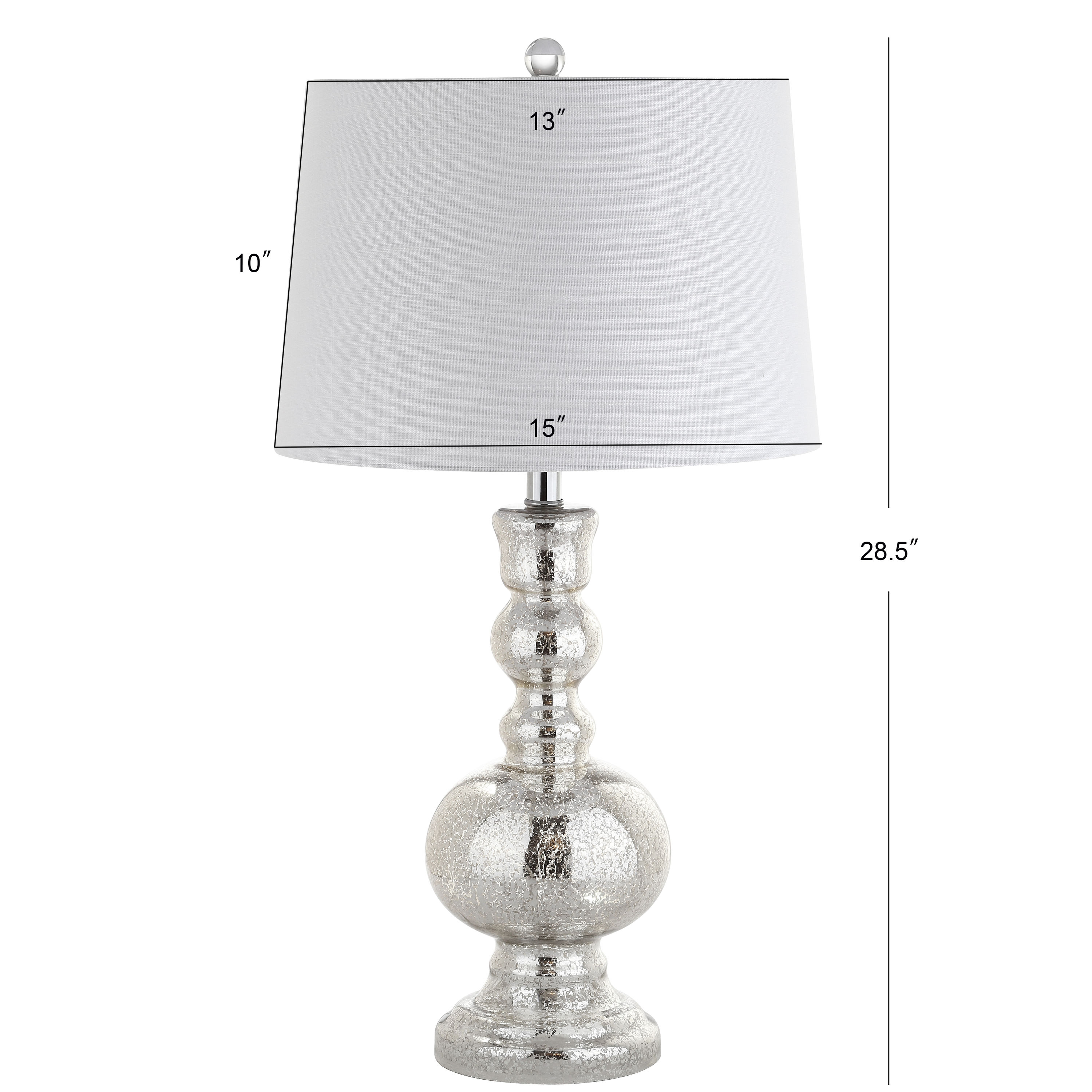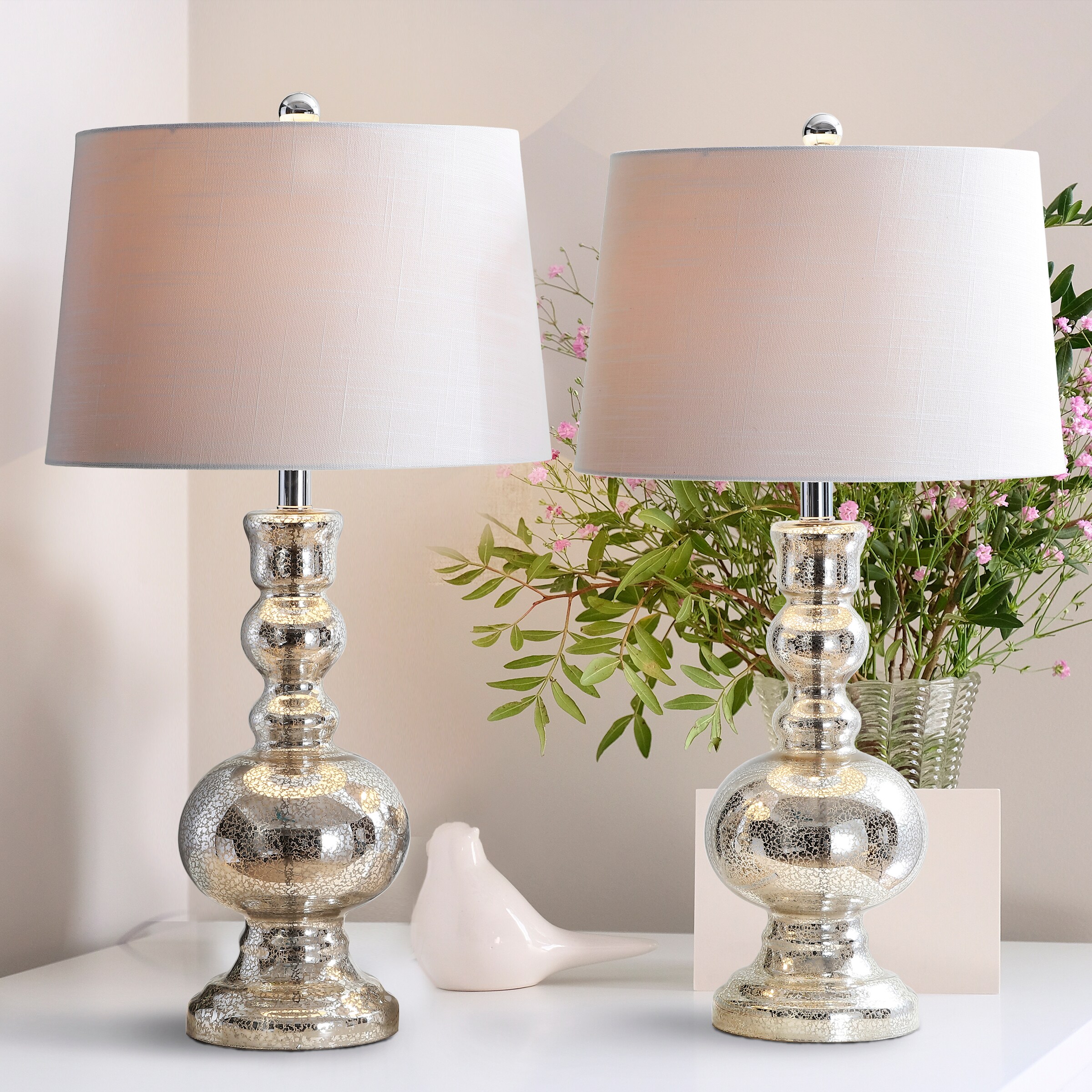 Bookend a shelf or console with an eye-catching pair of these beautiful blown-glass table lamps. The vibrantly hued glass bodies are gently curved, and the crisp white shades finish these lamps in classic style. A classic silver mercury-style glass makes this versatile set of two the perfect pair for any style of home decor.