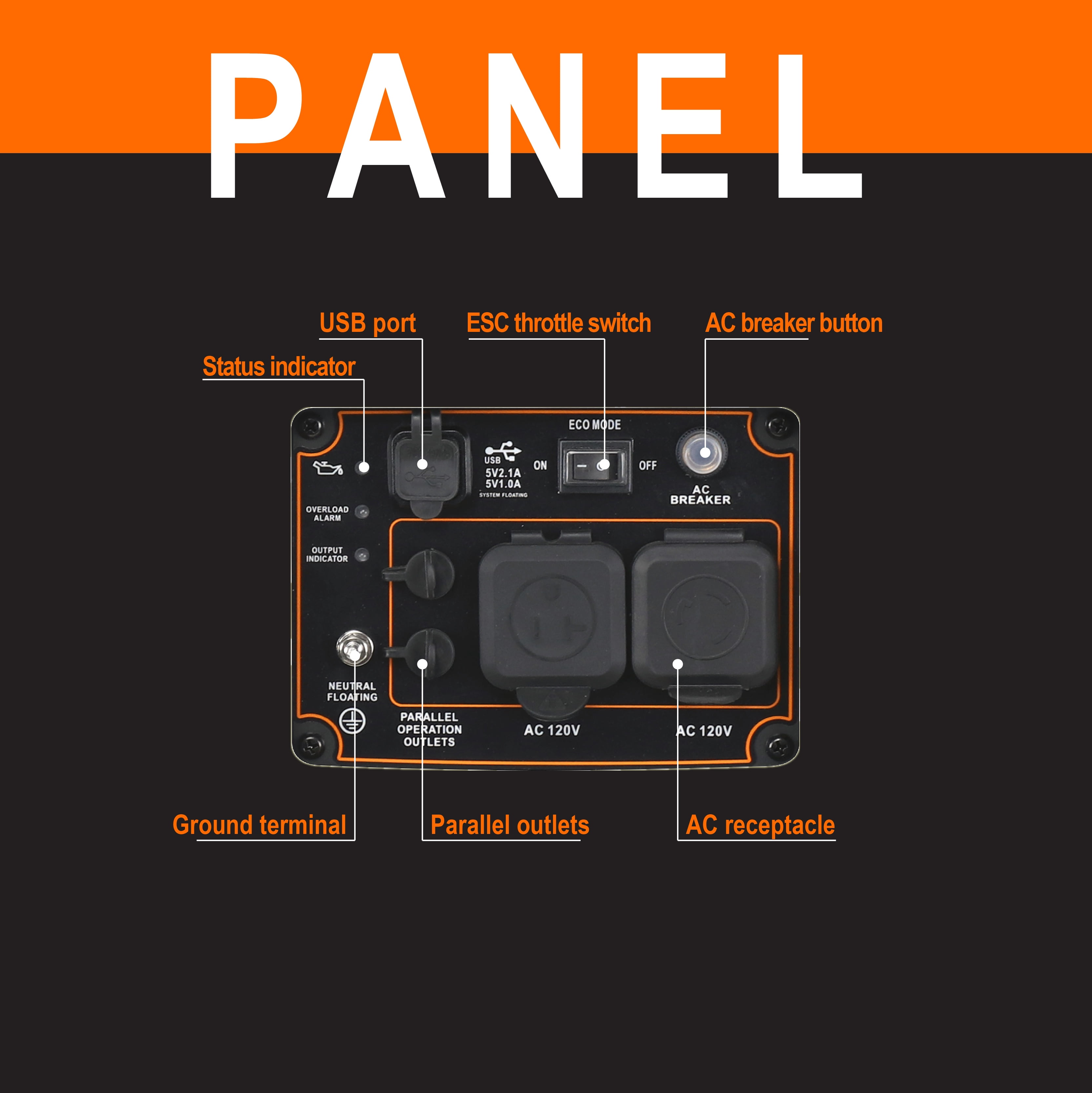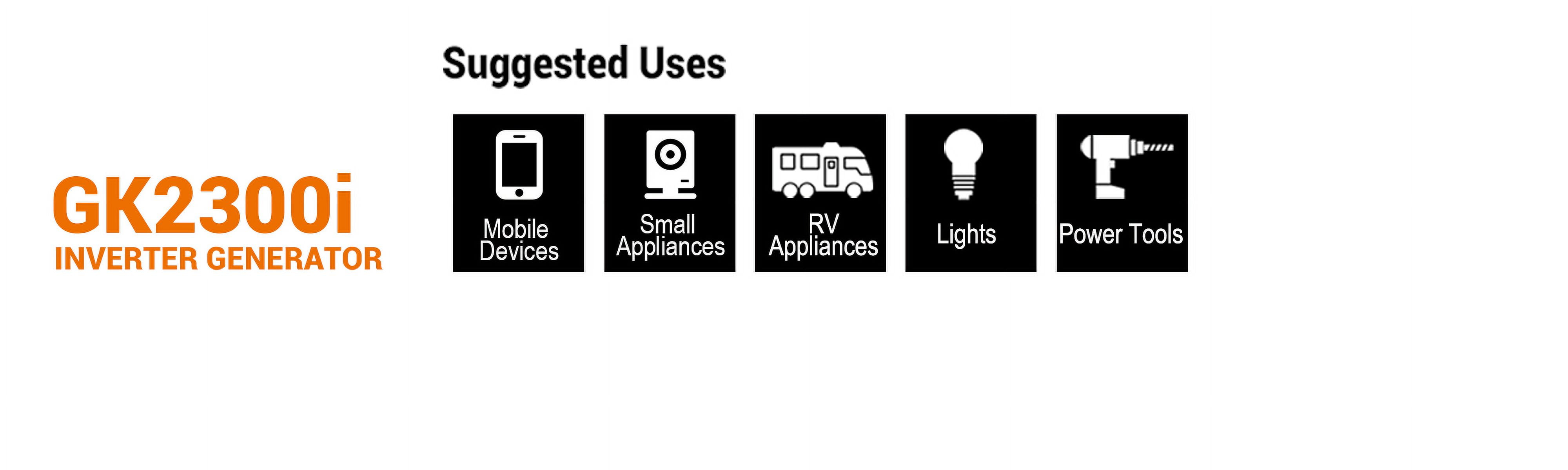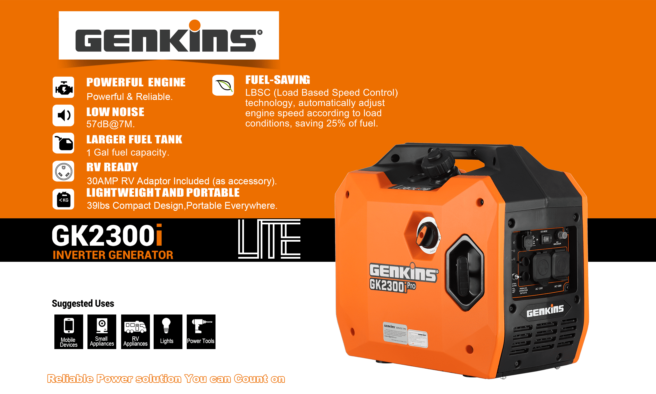 Genkins 2300W Portable Inverter Generator Output a whopping 2300 starting watts & 1800 rated watts powered by Genkins industrial class 79cc 4stroke OHV engine Weighs only 39 lbs and features a compact size, providing the same power and features as the classic GK2300i but lighter and smaller Operates at a low noise level of 5356 dBA, powered by Genkins Pure Sine Wave technology, making it almost whisper quiet when 10 feet away—ideal for RV and camper use Equipped with an auto shut down feature when low on oil and a builtin fuel gauge to help you manage energy levels Includes a builtin Eco mode (50% or 25% load) to help preserve energy consumption when high power demand is not needed