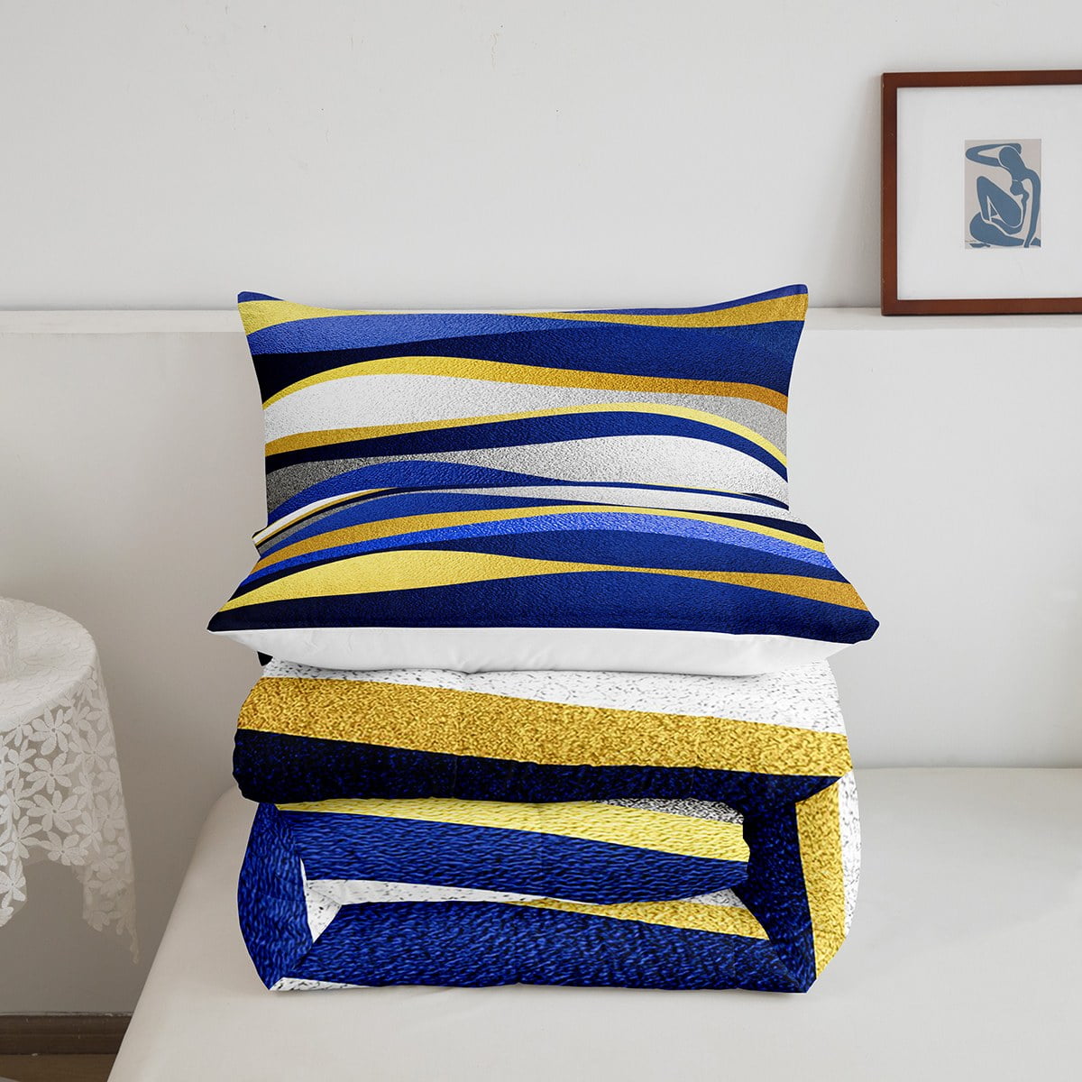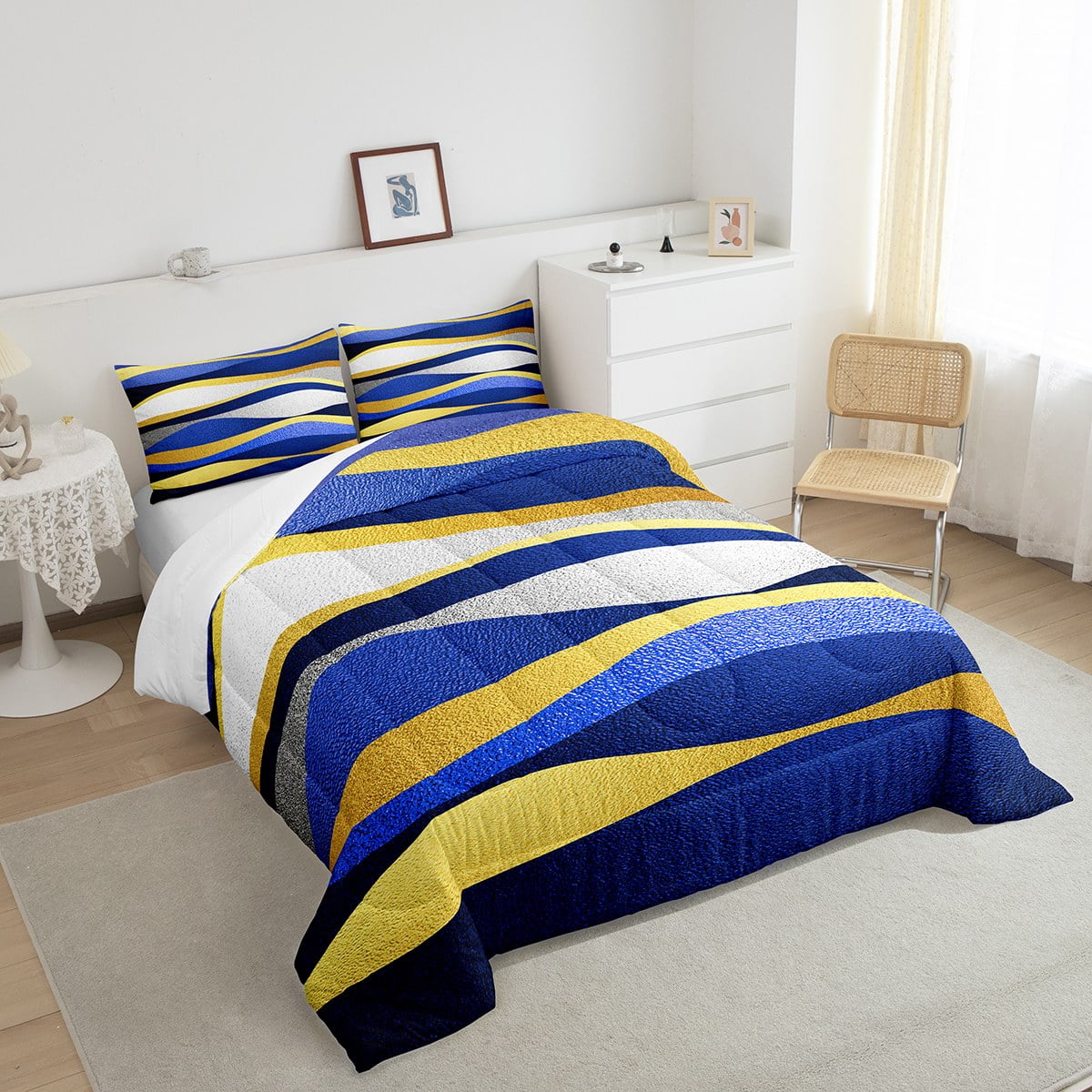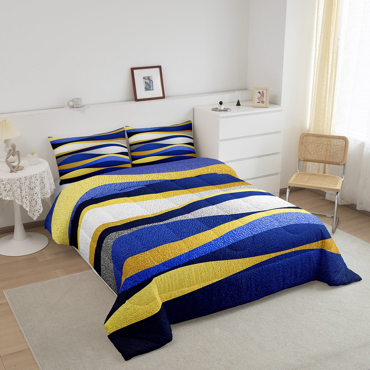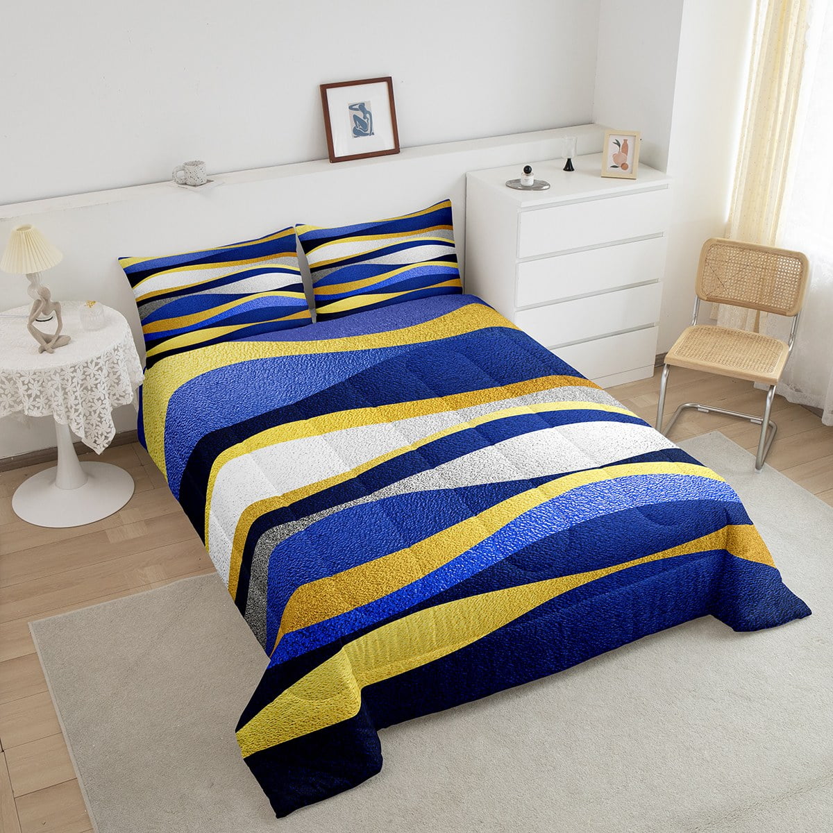 Geometric Bedding Set Navy Blue Gold Stripes Geometry Abstract Comforter Set Twin ,Geometrical Stripe Down Comforter Modern Design Artwork Room Decor Striped Lines Duvet Insert