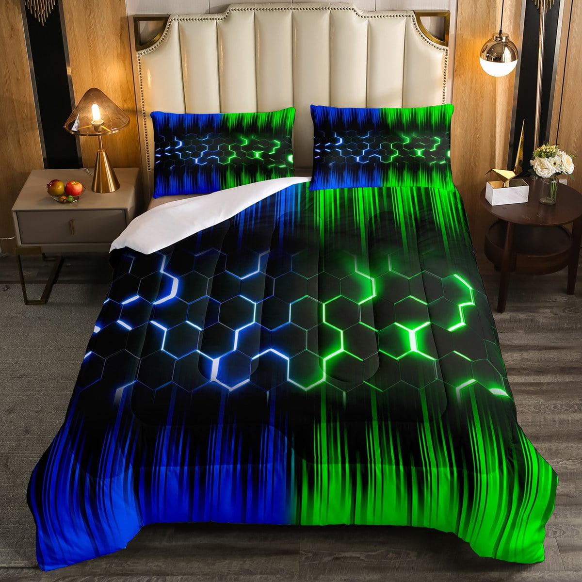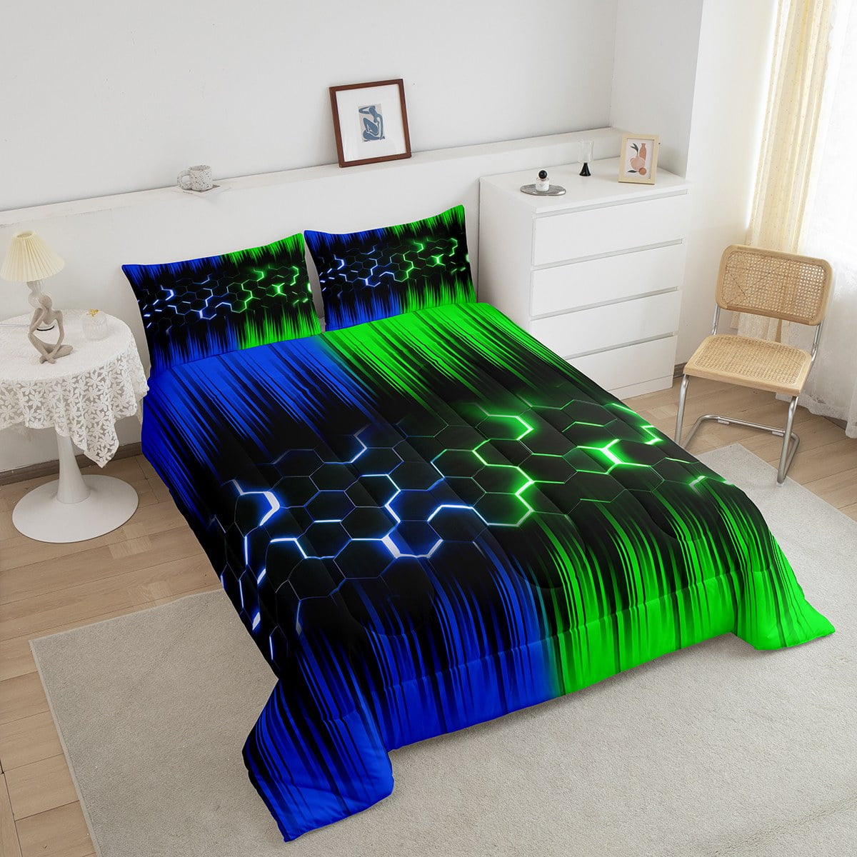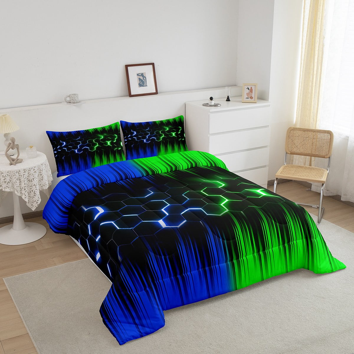 Geometric Honeycomb Comforter Set Twin Neon Green Blue Black Striped Bedding Set Adult,Abstract Gradient Ombre Comforter Set Geometry Beehive Hexagon Bed Set 2Pcs