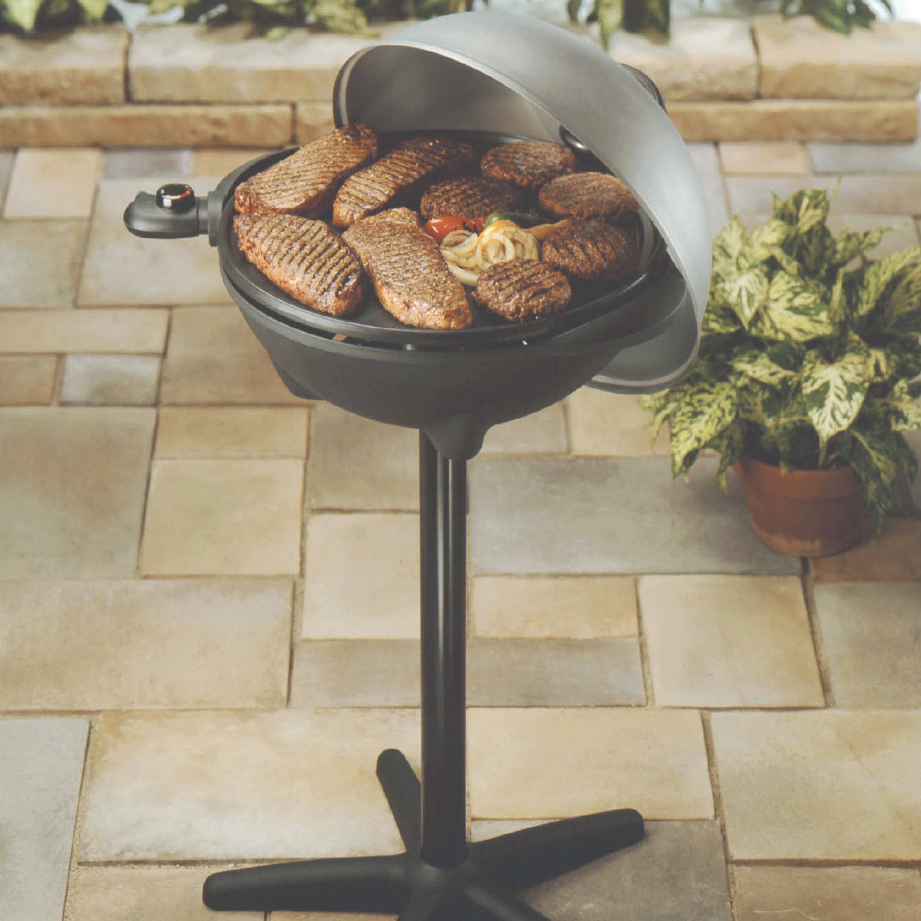 Hope you’re hungry! (And have lots of friends!) The George Foreman Indoor/Outdoor Electric Grill has room for over 15 servings of delicious meats, veggies, kabobs, desserts, and more! Plus, it’s right there in the name and it’s totally true—you can use this grill just as easily outdoors as you can indoors. It’s made possible by the removable grill stand that’s sturdy on the patio and can be removed for countertop grilling. Add in the durable nonstick coating and the patented fat-removing slope, and you’ve got the power to create large, tasty portions of everyone’s favorites with simple cleanup, to boot. What—and where—will you grill.