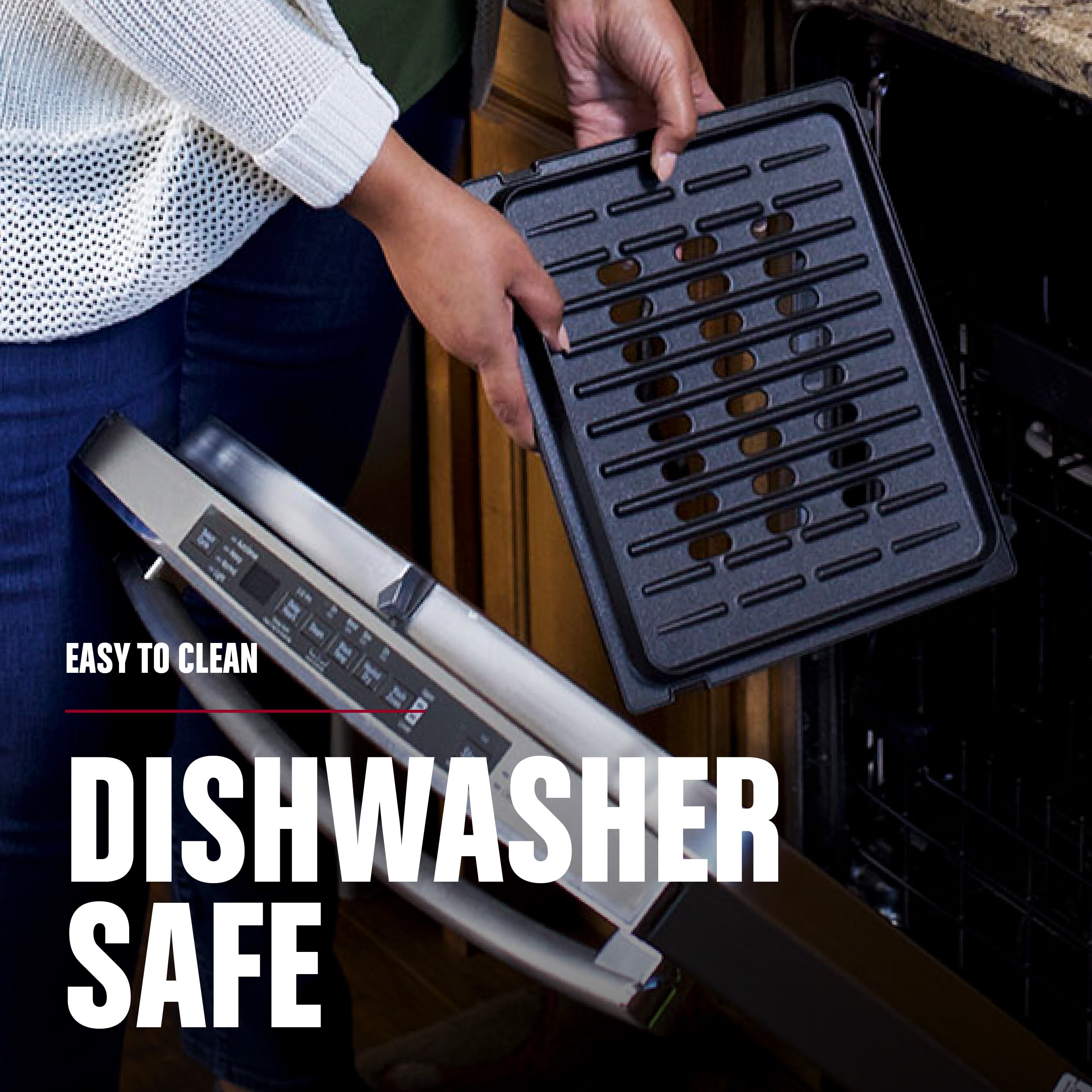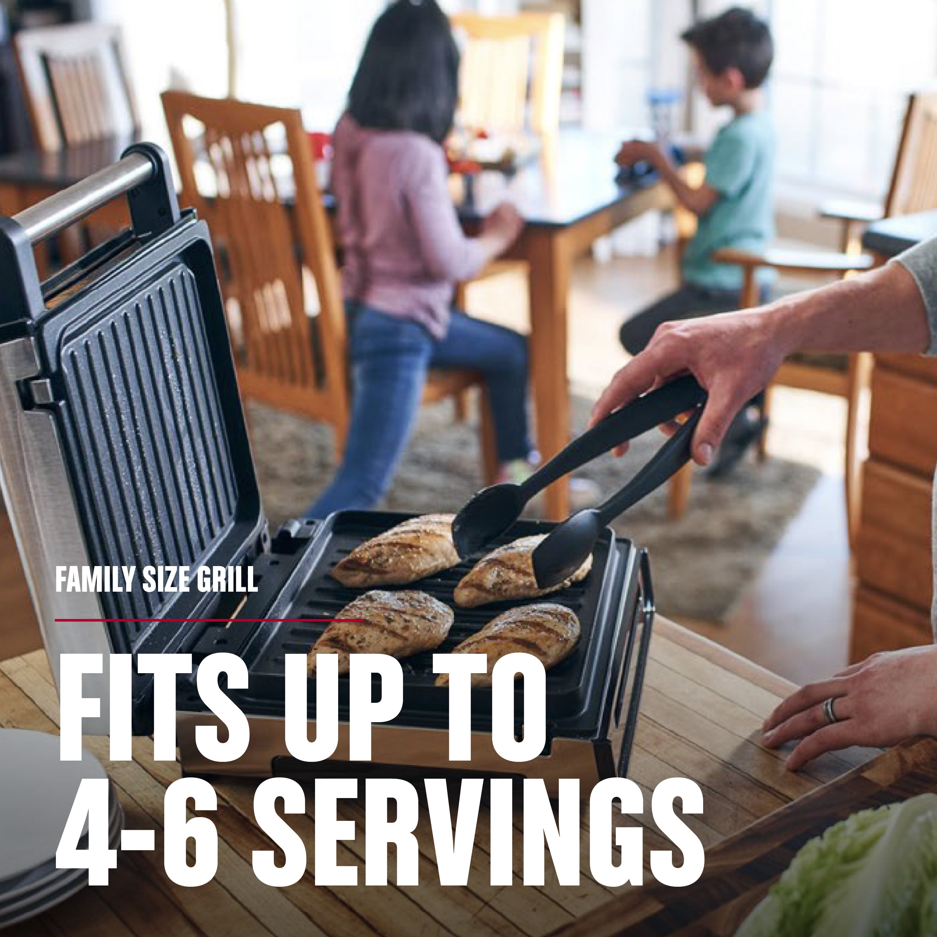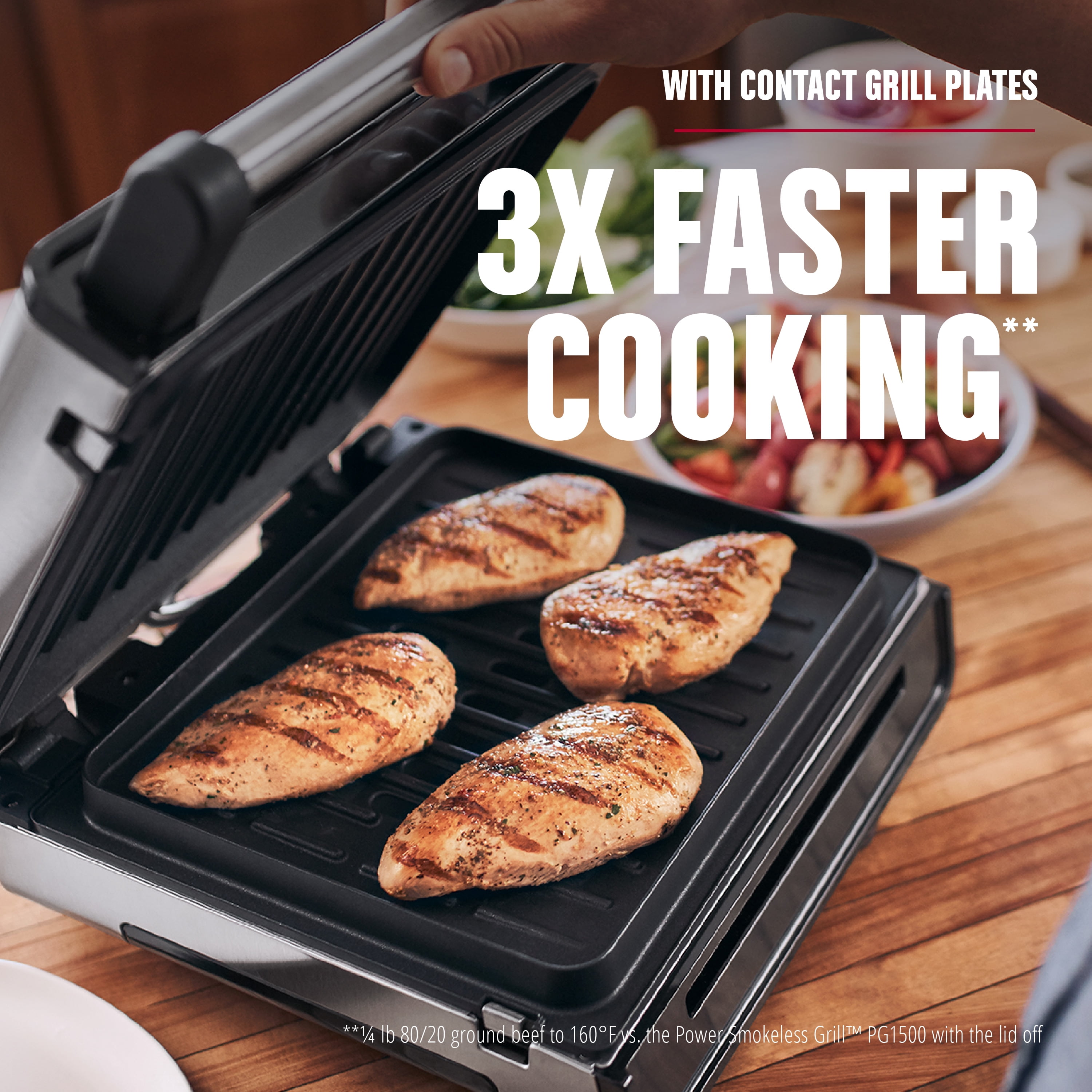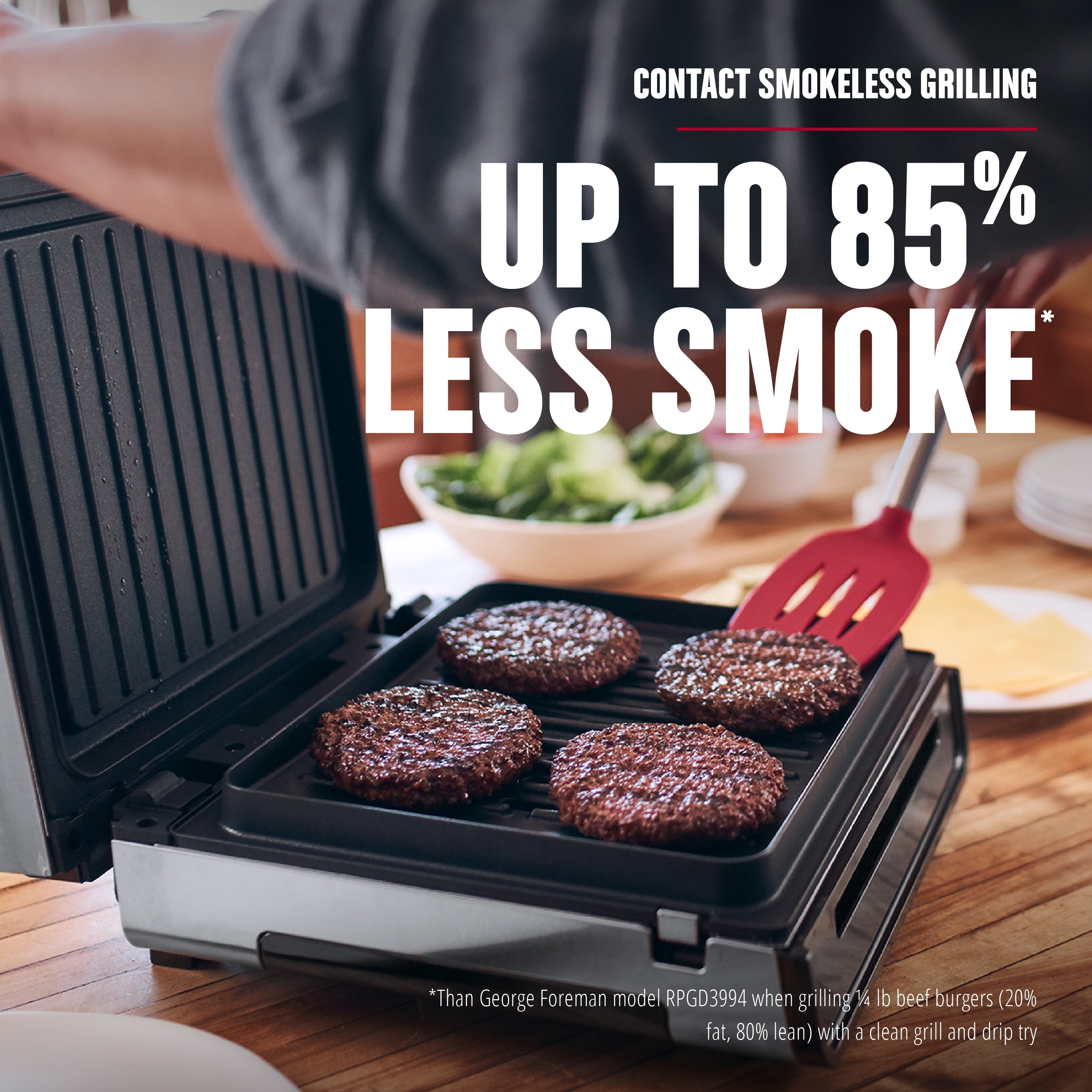 Family Size (4-6 Servings) – The Contact Smokeless Grill makes it easy to create quick weeknight meals the whole family will love. Juicy burgers, sizzling steaks, and so much more fit easily on the 90 sq. in. cooking surface. Advanced George Tough Non-stick PFAS Free Ceramic Coating – There’s a lot to love about this nonstick coating. It’s 3X more durable^^, and easy to clean after cooking. Easy to Clean – Less cleaning time, more family time! The grill plate and drip tray are removable and dishwasher-safe for simplified cleanup. Contact Smokeless Grilling – Up To 85% Less Smoke*! – All sizzle without the smoke! The unique open plate design allows grease to drain onto the dishwasher-safe drip tray, cooling it down before it can burn and produce smoke. 3X Faster Cooking – Enjoy fast cooking without sacrificing flavor! This grill delivers 3X faster cooking** for quick and easy meals any night of the week. Here’s an idea for dinner: you can cook burgers in just six minutes! Tough and Beautiful Stainless Steel Housing – Easy to Clean 90 Square Inch Grilling Area 1265 Watts