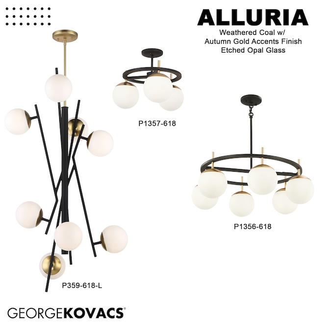 A unique Weathered Black finish with Autumn Gold highlights an exceptional contrast with perched. Etched White glass shades. A variety of designs offers a complete collection with a nod to Mid-Century Modern styling. The tri-color palette is fashionable yet extremely versatile and the minimalist design makes this fixture an ideal complement for modern décor.