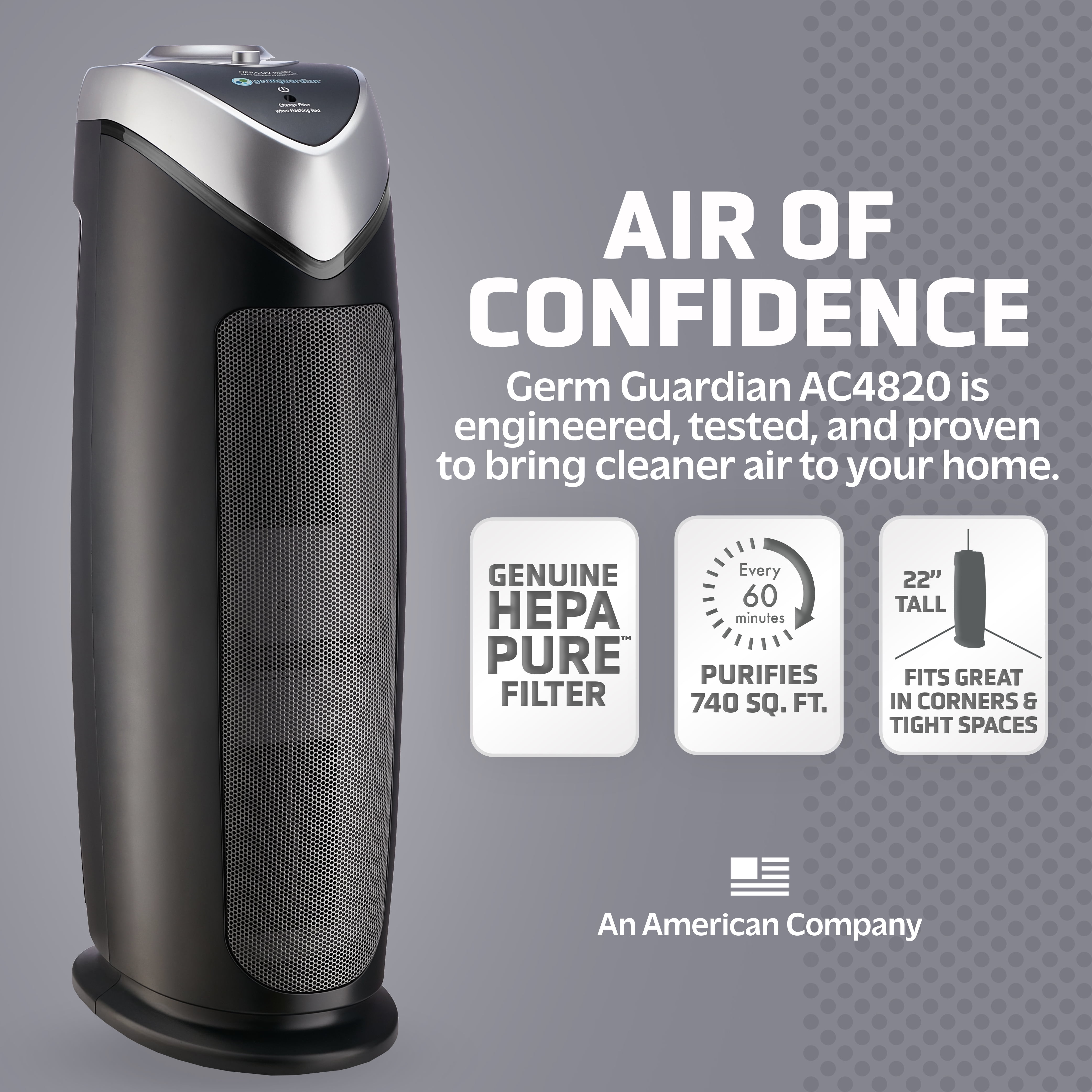 BREATHE FRESH AND CLEANER AIR The Germ Guardian AC4820 air purifier, equipped with Genuine Germ Guardian® HEPA Pure™ filtration technology, effectively captures 99.97% of germs, viruses, and allergens as small as 0.1 microns. Customize your at-home comfort with 3 speed settings and an ultra-quiet mode available at the lowest speed setting. This air purifier circulates the air in a large 740 sq. ft. room every 60 minutes or in a medium 150 sq. ft. room every 12.5 minutes, making it ideal for bedrooms, offices, basements, and other open concept spaces. Designed, engineered, and independently tested in the United States, it exceeds industry standards. Your purifier is only as powerful and effective as the filter you put inside, and our Genuine Germ Guardian replacement parts are essential for maintaining product performance. Each filter or bulb is designed specifically for a particular unit. Not only will genuine replacement parts fit perfectly, but they also match the combination technology of the unit, allowing you to get the most out of your air purifier. This product earned the Energy Star label by meeting strict energy efficiency guidelines set by the U.S. EPA. WARRANTY: Germ Guardian offers reassurance with a 5-year limited warranty in addition to your purchase.”