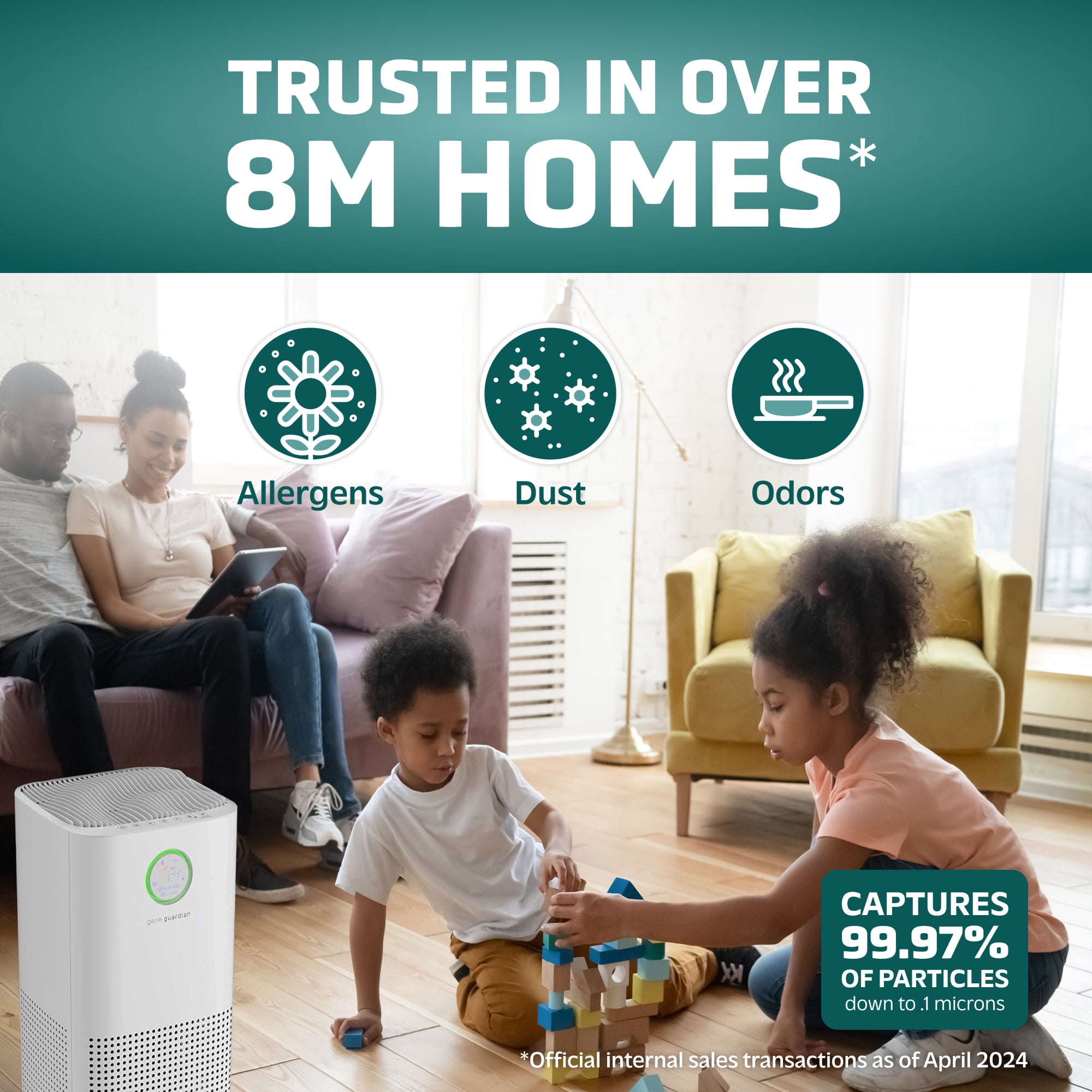 This 6-in-1 Air Purifier Console, equipped with a Genuine HEPA PURE™ 360° air filter, captures 99.97% of harmful germs, dust, pollen, pet dander, mold spores, and other allergens down to 0.1 microns from the air. The activated carbon pre-filter helps reduce unwanted odors from pets, smoke, cooking fumes, and works to reduce the myriad of VOCs emitted by common household products and cleaning chemicals. Equipped with UV-C light technology, this air purifier helps reduce airborne viruses such as influenza, staph, and rhinovirus, while also targeting VOCs and odors before releasing cleaner, fresher air back into the room. The 2.3 watt-quartz glass bulb is over 600% more effective than single-LED solutions, resulting in a Zero Ozone Certified product. This unit is designed with an easy-to-use touch control panel featuring 4 fan speeds, sleep mode, and auto mode with Intellisense ai™. Intellisense™ measures the room air quality 60 times per minute using a PM 2.5 sensor, detecting tiny particles in the air smaller than the diameter of a strand of human hair. It automatically adjusts the speed when poor air quality is detected and returns to a lower speed after clearing the dirty air. While in sleep mode, the unit runs at a library-quiet low speed, and the display lights turn off. A timer can be set for 2, 4, 6, and 8 hours, and the unit is also equipped with a child lock. At 23” tall, this Germ Guardian provides powerful air purification for use in open-concept spaces and large rooms up to 1,905 sq. ft.