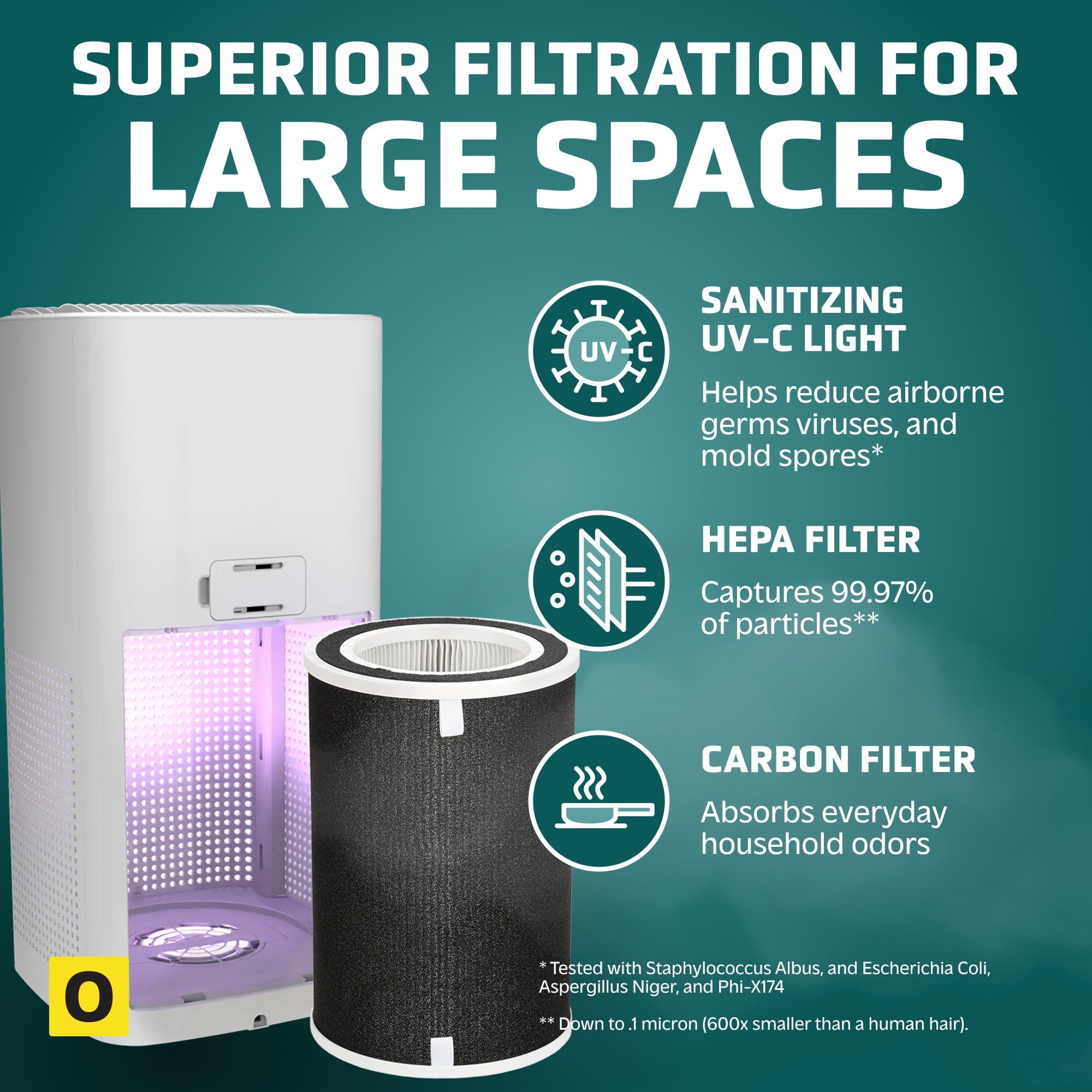 Genuine HEPA Pure Filter: The genuine HEPA Pure 360° air filter, with over 122 pleats and 20.5 square feet of filter area, captures 99.97% of harmful germs, dust, pollen, pet dander, mold spores, and other allergens down to 0.1 microns from the air Reduces Odors: The activated carbon filter pre-filter helps reduce unwanted odors from pets, smoke, cooking fumes, while working to reduce the myriad of VOCs emitted by common household products and cleaning chemicals Fights Germs: UV-C light helps reduce airborne viruses such as influenza, staph, rhinovirus, and works to reduce volatile organic compounds Zero Ultraviolet – C (UV-C) acts as the ultimate line of defense, helping reduce airborne germs such as Staphylococcus Albus, Escherichia Coli, Aspergillus Niger, and Phi-X174 as well as airborne bacteria and mold spores*. Turbo charge your refresh with our UV-C optional setting. Our 2.3 watt quartz glass bulb is over 600% more effective than single LED-led solutions resulting in a zero ozone certified product that releases cleaner, fresher air back into the room Air Quality Monitor: Intellisense ai™ air quality indicator measures the room air quality 60 times per minute using a PM 2.5 sensor detecting tiny particles in the air smaller than the diameter of a strand of human hair. It automatically adjusts the speed when poor air is detected and returns to a lower speed after clearing the dirty air Cleans Air Fast: Circulate and filter the air in a large 1,905 sq. ft. room every 60 minutes or medium 394 sq. ft. room every 12.5 minutes 4 Speeds: Features quiet operation with 4 speed options and a library-quiet sleep mode dims the display lights and reduces the fan speed to low Additional Features: Features a child lock, auto-off timer, auto mode, filter replacement and bulb indicator lights