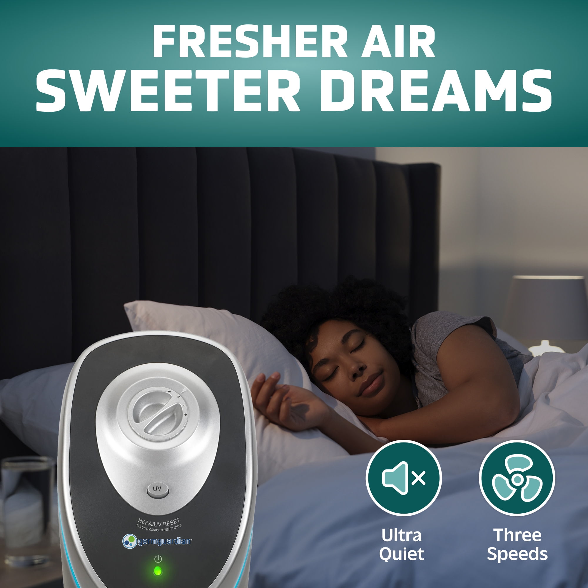 The 3-in-1 GermGuardian Air Purifier with HEPA Filter is perfect for allergy sufferers. The HEPA filter captures 99.97% of dust and allergens as small as 0.1 microns in size, while the charcoal filter captures odors! More than just a filter, UV-C light helps reduce airborne bacteria, viruses, mold spores*, and works to reduce volatile organic compounds. Circulates the air 1x per hour in 915 square foot rooms and 4.8x per hour in 189 sq. ft rooms, making it ideal for medium to large sized rooms such as: dorm rooms, bedrooms, and other living areas! Includes a UV-C control and a filter change indicator. Choose from 3 speeds, including a low speed that runs ultra-quiet. *Tested with Staphylococcus Albus, and Escherichia Coli, Aspergillus Niger, and Phi-X174.