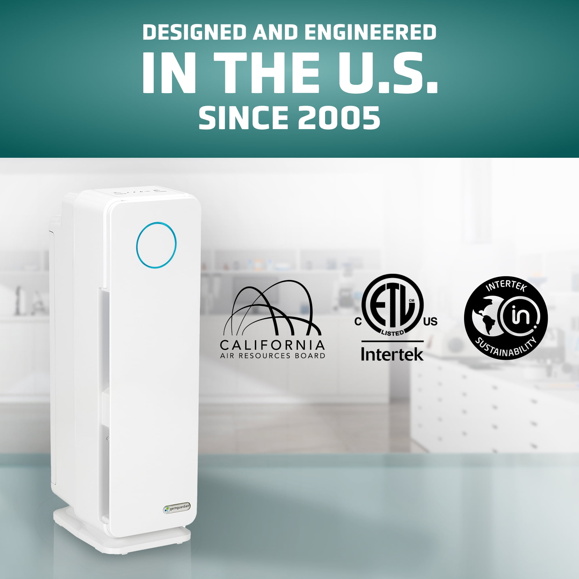 High Performance Air Purifier: Circulates the air 1x per hour in 743 square foot rooms and 4.8x per hour in 153 sq. ft rooms, ensuring thorough purification. Ideal for medium to large sized rooms such as dorm rooms, bedrooms, and other living areas! Genuine HEPA Pet Pure Filter: Our Pet Pure HEPA Filter is designed to tackle pet dander, hair, and odors with exceptional efficiency, capturing up to 99.97% of harmful germs, dust, pollen, mold spores, and other allergens as small as .1 micron. Fights Germs: Equipped with UV-C light technology, this air purifier helps reduce airborne viruses, such as influenza, staph, and rhinovirus, while also targeting volatile organic compounds (VOCs) Traps Allergens: Pre-filter traps dust, pet hair, and other large particles while extending the life of the HEPA filter Reduces Odors: Activated charcoal filter helps to reduce unwanted odors from wildfire smoke, pets, cigarette smoke, cooking fumes, and more Zero Ozone Certified: Our air purifier is Ultraviolet – C (UV-C) enabled, providing an extra layer of defense, helping to reduce airborne germs such as Staphylococcus Albus, Escherichia Coli, Aspergillus Niger, and Phi-X174 as well as airborne bacteria and mold spores* Quiet Operation: The lowest setting can be used as gentle white noise at night for a quiet, restful sleep Additional Features: Features 3 speeds and a Filter Replacement indicator that lets you know when it’s time to replace your filters