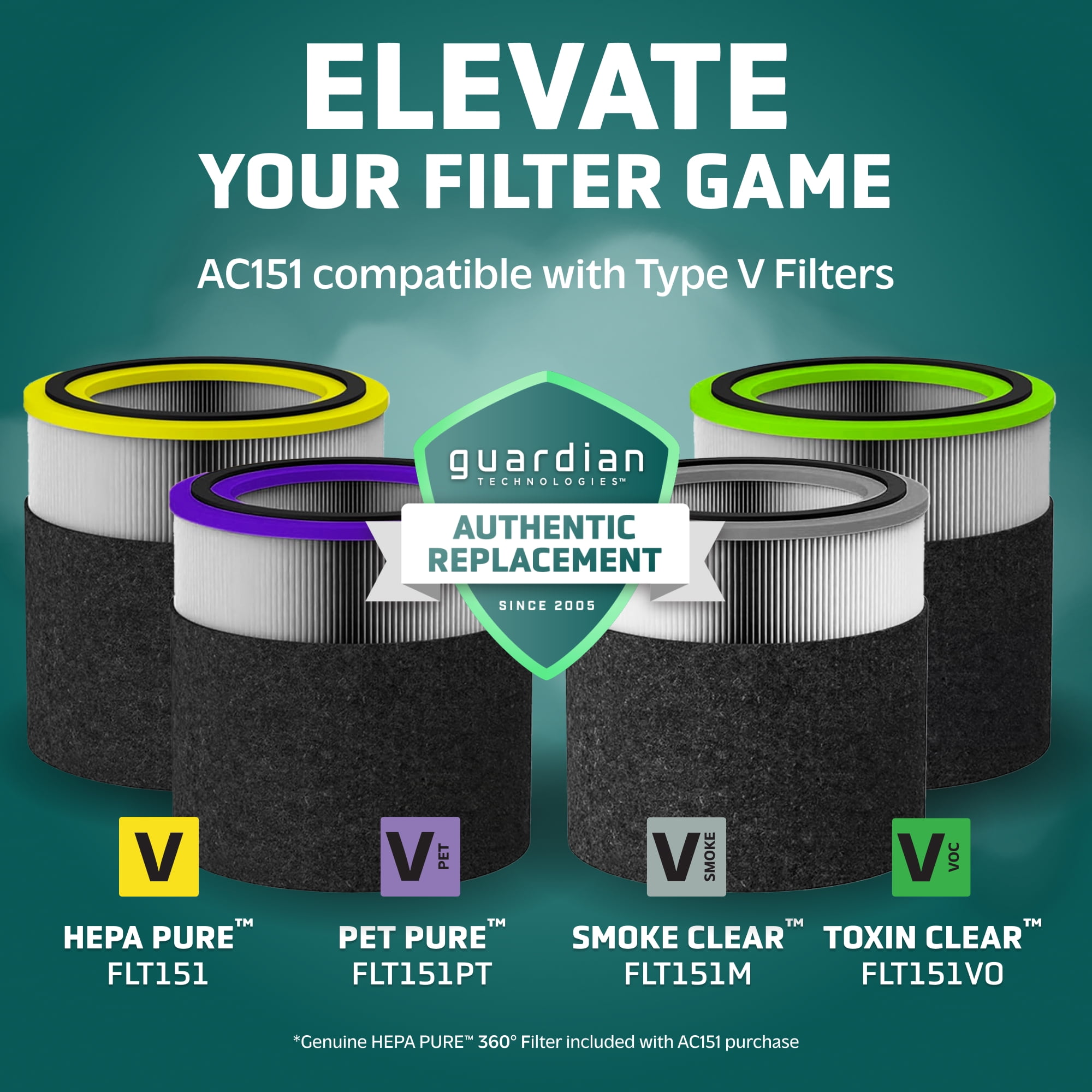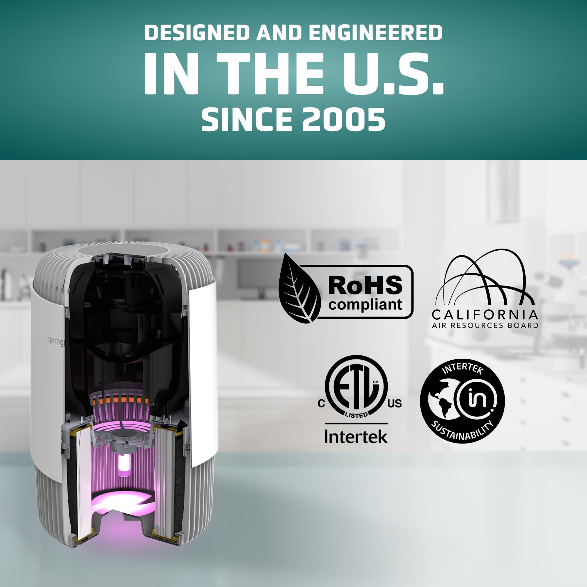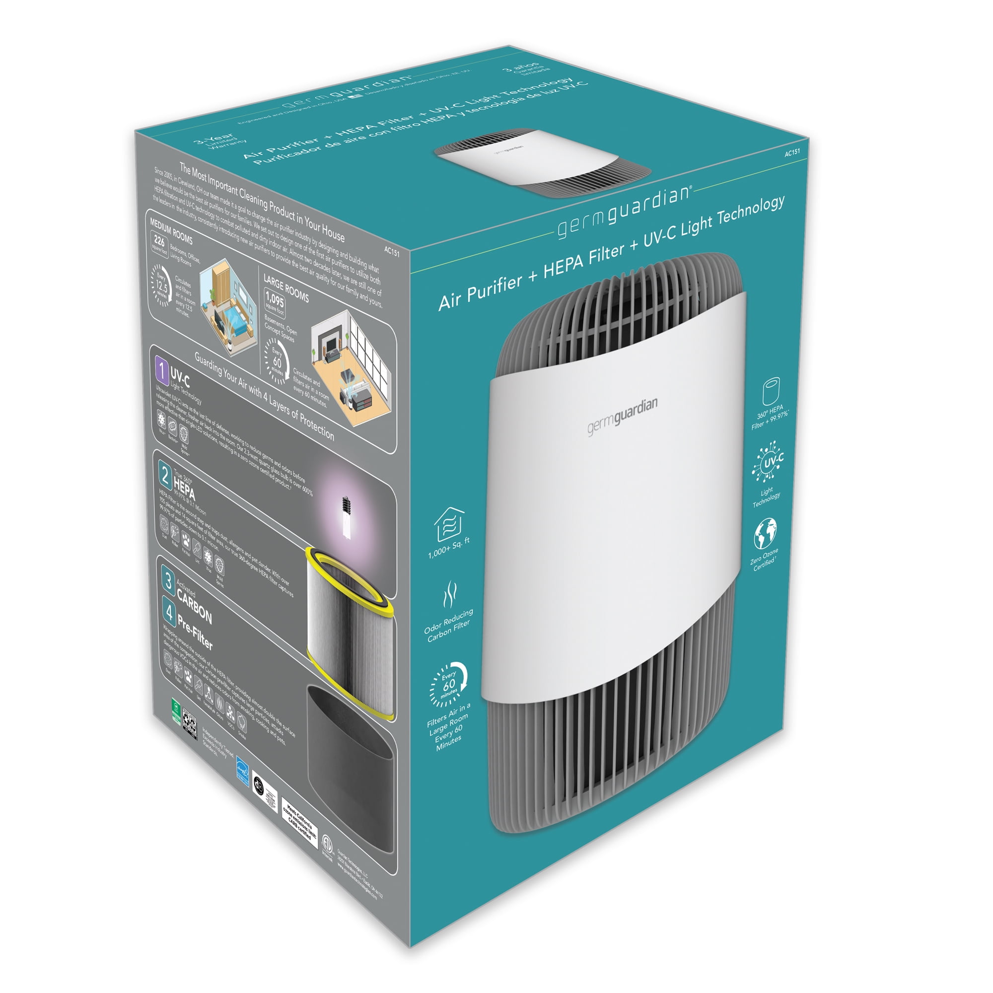 Guarding Your Air with 3 Layers of 360 Degree Protection: Genuine high-efficiency True 360 Degree HEPA PURE filter captures 99.97% of particles as small as 0.1 micron from all directions. With over 155 pleats and 14.0 square feet of filter area, our True HEPA PURE™ filter traps dust, pollen, harmful germs, and pet dander. Zero Ozone Certified: Ultraviolet – C (UV-C) acts as the ultimate line of defense, helping reduce airborne germs such as Staphylococcus Albus, Escherichia Coli, Aspergillus Niger, and Phi-X174 as well as airborne bacteria and mold spores*. Turbo charge your refresh with our UV-C optional setting. Our 2.3-watt quartz glass bulb is over 600% more effective than single LED-led solutions resulting in a ZERO OZONE verified product that releases cleaner, fresher air back into the room. Clean Air in 12.5 Minutes: Circulate and filter the air in a 146 sq. ft. room every 12.5 minutes or in a large 1,095 sq. ft. room every 60 minutes. Efficacy testing is performed in 30 cubic meter testing chambers to ensure accurate results and real-world replicable performance. Reduces Odors: Activated carbon pre-filter traps dust, pet hair, and other large particles while extending the life of the HEPA filter. Treated carbon absorbs volatile organic compounds from the air and reduces odors from smoking, cooking, and pets. ENERGY STAR Certified: Cleaning air since 2005! GermGuardian air purifiers are ENERGY STAR Certified, CARB (California Air Resource Board) Certified, ETL Certified, and Zero Ozone Verified! Quiet Operation: Choose from 3 speed options, with the lowest setting providing gentle white noise for a quiet, restful night’s sleep. Genuine GermGuardian Filters: Replacement filters for this air purifier are FLT151 HEPA Filter Model V. Genuine GermGuardian replacement filters for certified fit and maximum filtration. Off-brand filters often fail HEPA testing standards, fit incorrectly, reduce efficacy, and may cause damage to the air purifier. Filter Type: True HEPA