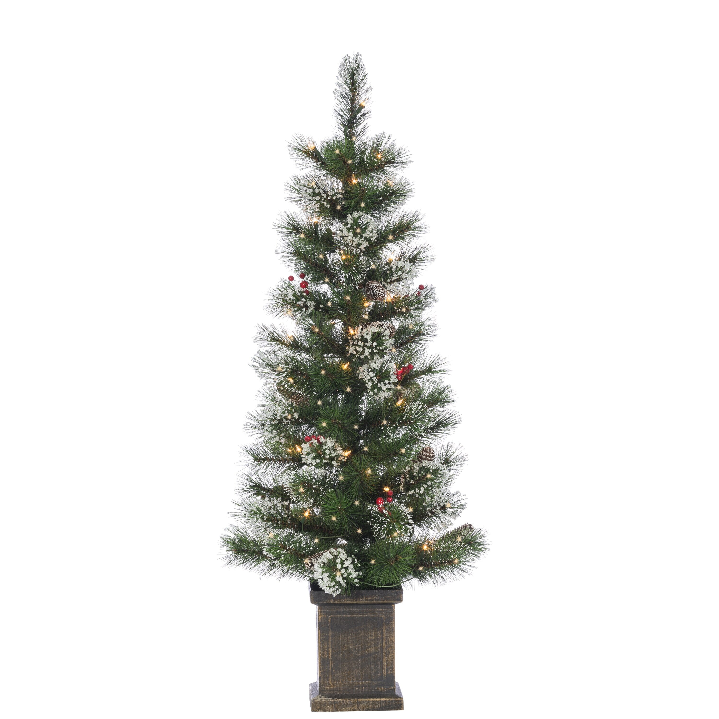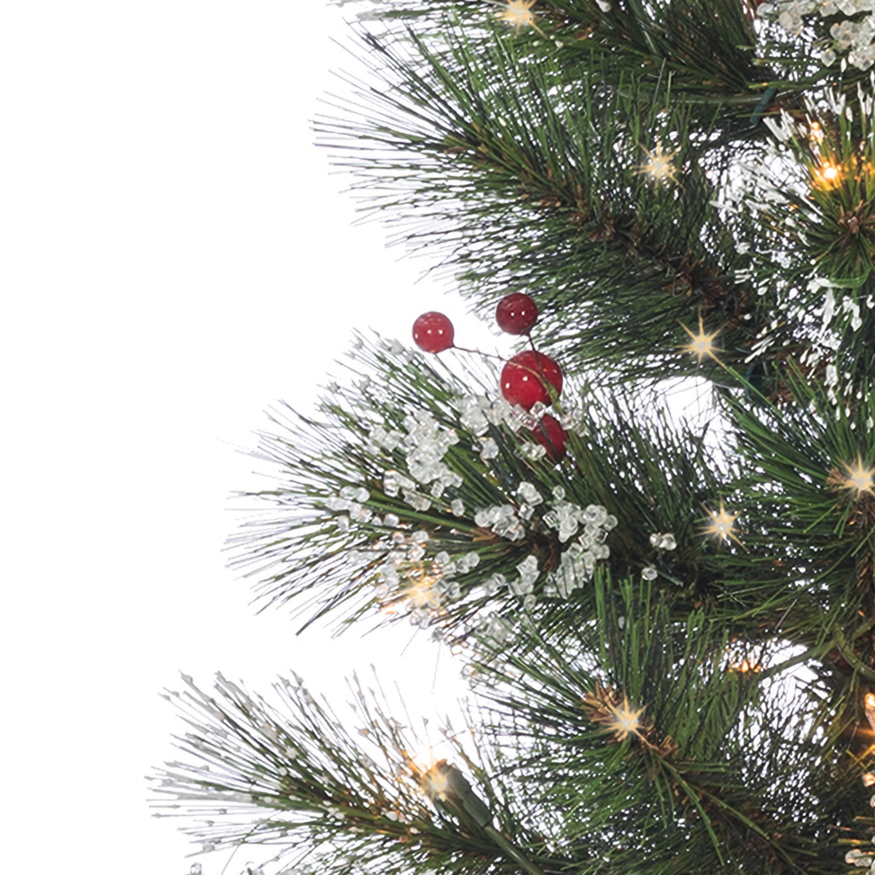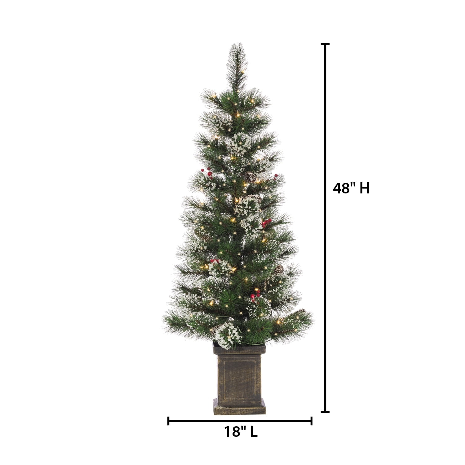 This set of two 4-Foot Potted Loveland Spruce trees are perfect for adding a touch of rustic elegance to your holiday decor.Crafted with a unique Loveland Spruce design, these trees feature iced tips, pine cones, and red berries that create a festive and natural look. The hard mixed needle branches provide a full and lush appearance, with 90 branch tips on each tree, ensuring that they will look stunning from every angle.The pre-lit design saves you time and effort, allowing you to focus on decorating and enjoying the holiday season. The trees come with 50 clear white lights that are carefully arranged throughout the branches, providing a warm and inviting glow that will illuminate any room. The lights are energy-efficient, ensuring that your holiday decorations won’t cause a spike in your electricity bill.The potted design adds a touch of charm to these trees, making them perfect for use indoors or outdoors. The sturdy pots provide a stable foundation for the trees, so you can be confident that they will remain securely in place throughout the festivities.Constructed with high-quality materials, these trees are built to last and withstand the wear and tear of many holiday seasons. Whether you choose to use them as a set or individually, these trees are sure to make a statement in any room.Whether you’re looking to add a touch of natural elegance or create a cozy and welcoming atmosphere, these trees are sure to impress.
