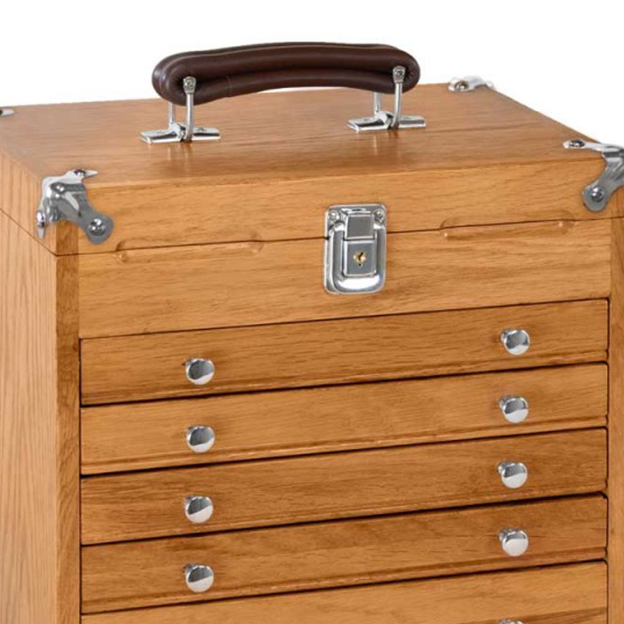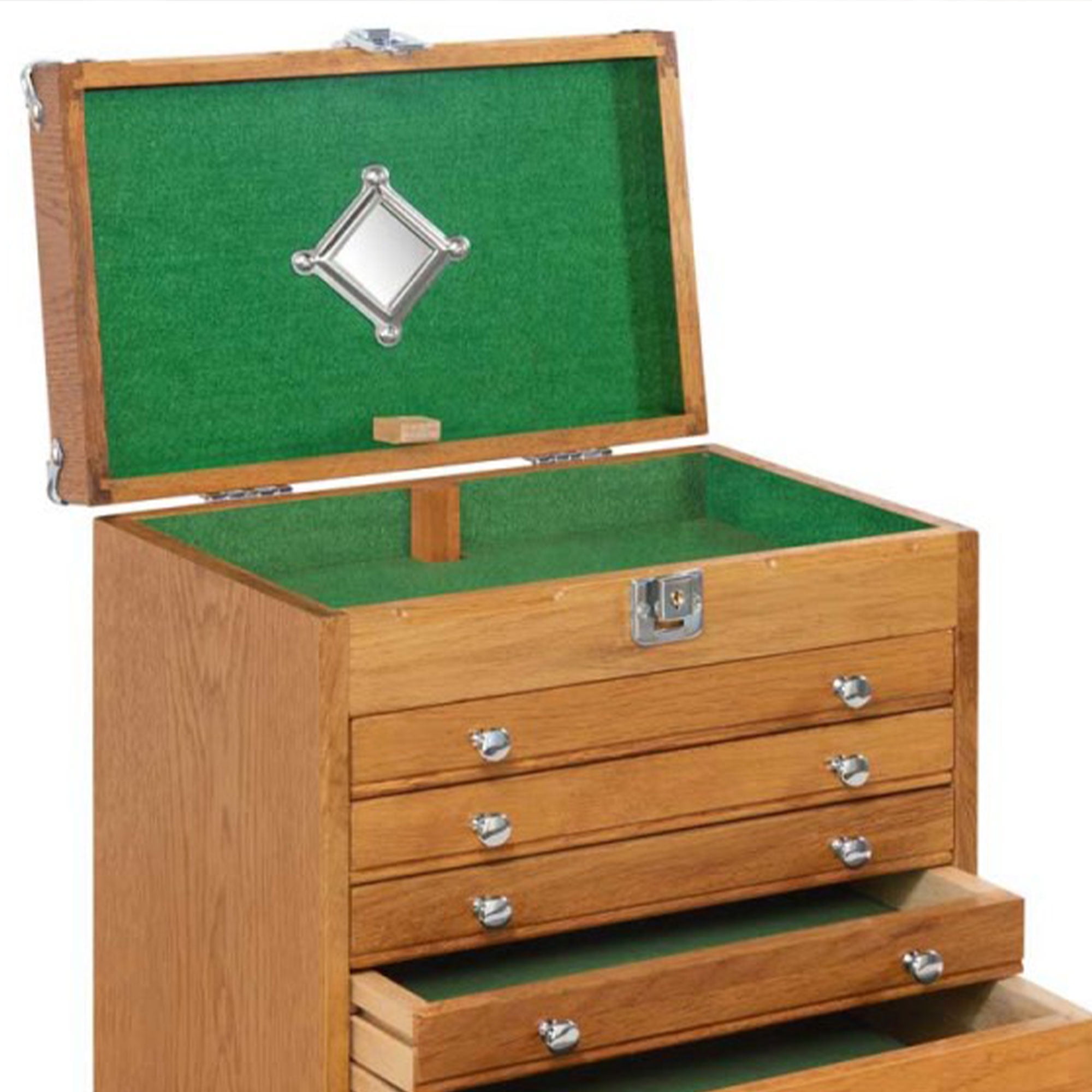 The Gerstner International GI-T16 Collector’s Chest is an imported, classic American style chest with an interior locking system and top handle for added portability. It has six locking drawers and a top well. The All-Loc Drawer Security System locks drawers when the top lid is closed. Ideal for storing pocket knife collections, personal valuables, small office supplies, crafting items, jewelry, fly-fishing accessories, hobby tools, coin collections and more. 6 -drawers provide ample space for all your small treasures. Red Oak hardwood and red oak veneers provides protection from moisture, plus tongue and groove joinery insures strength and durability. Green felt lined interior. Fully lockable. Comes with 2 keys. Chrome hardware.