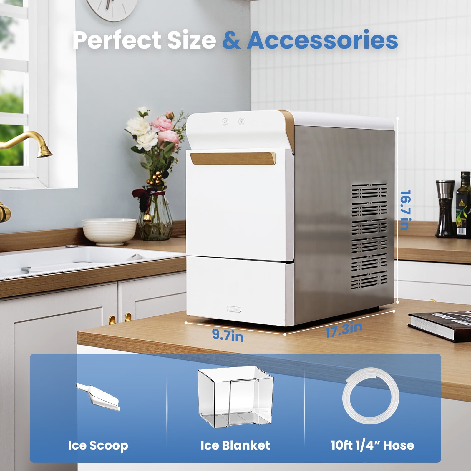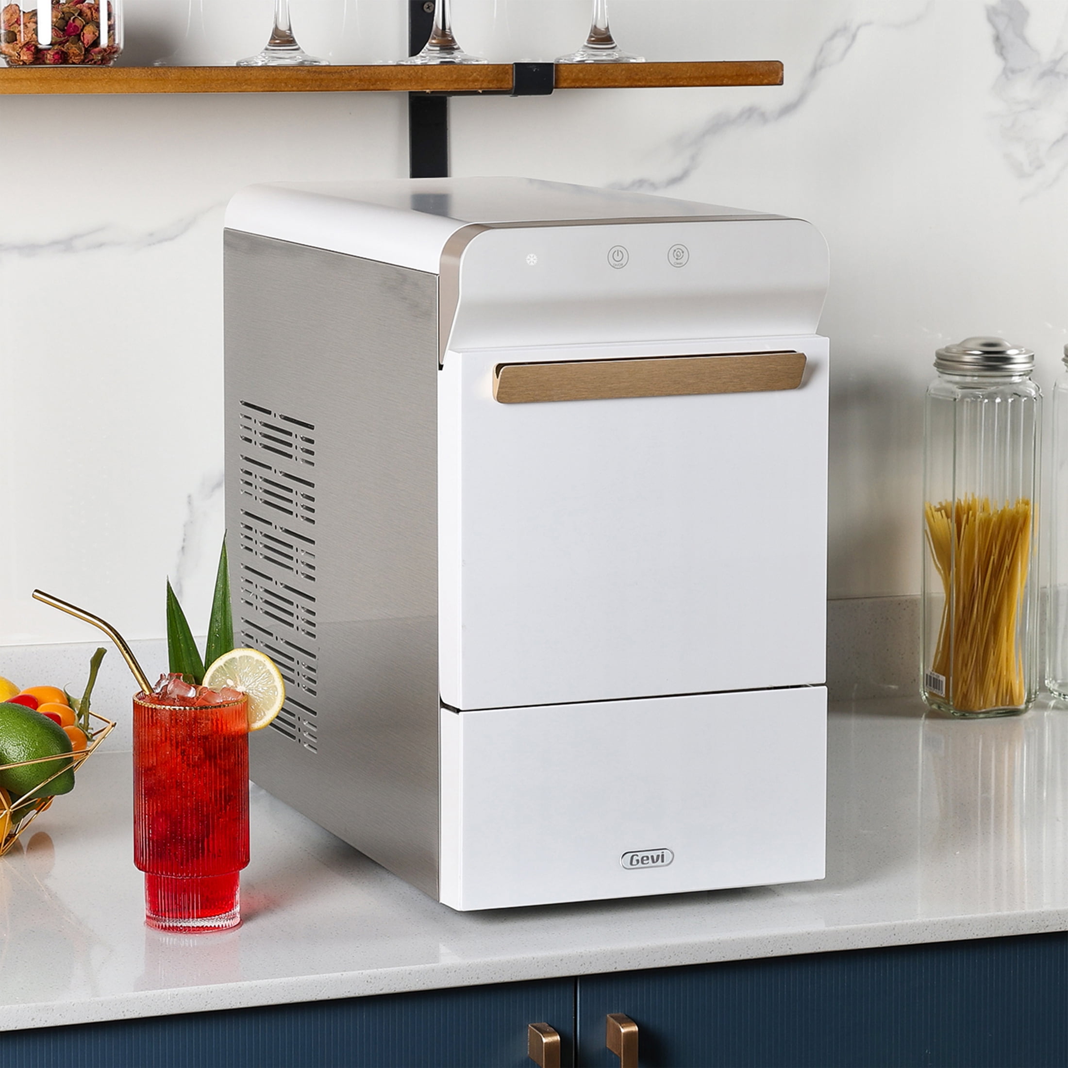 Gevi portable nugget ice maker delivers pebble ice charm for your home. This sleek, self-cleaning countertop model makes 30 lbs of soft, chewable pellet ice daily. Available in white, black, and stainless steel, its 16.9-inch design fits under cabinets or on counters. Elevate your drinks and home decor with this delightful pebble ice maker!