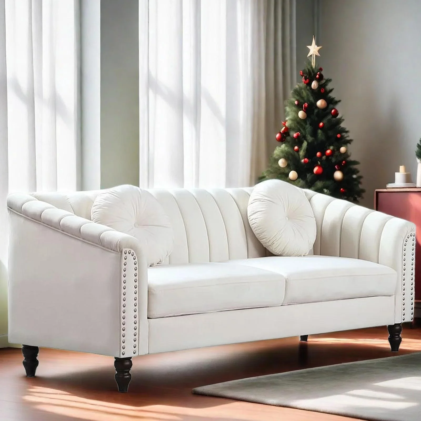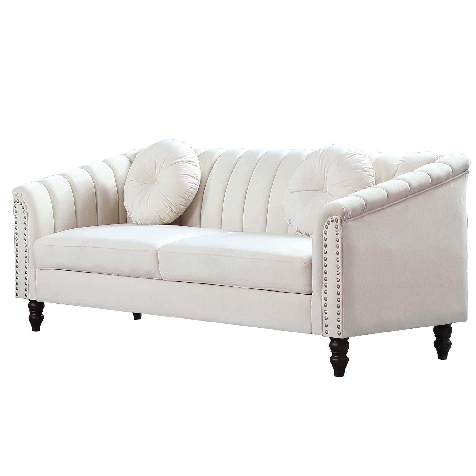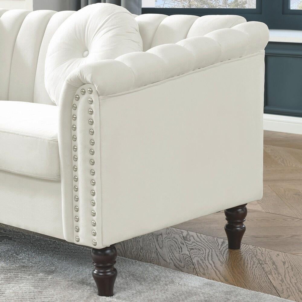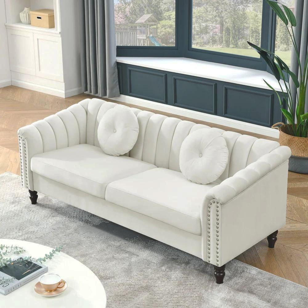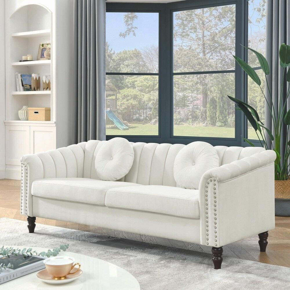 Gewnee Chesterfield Velvet Sofa Couch with Nailhead Trim and 2 Pillows for Living Room,Beige