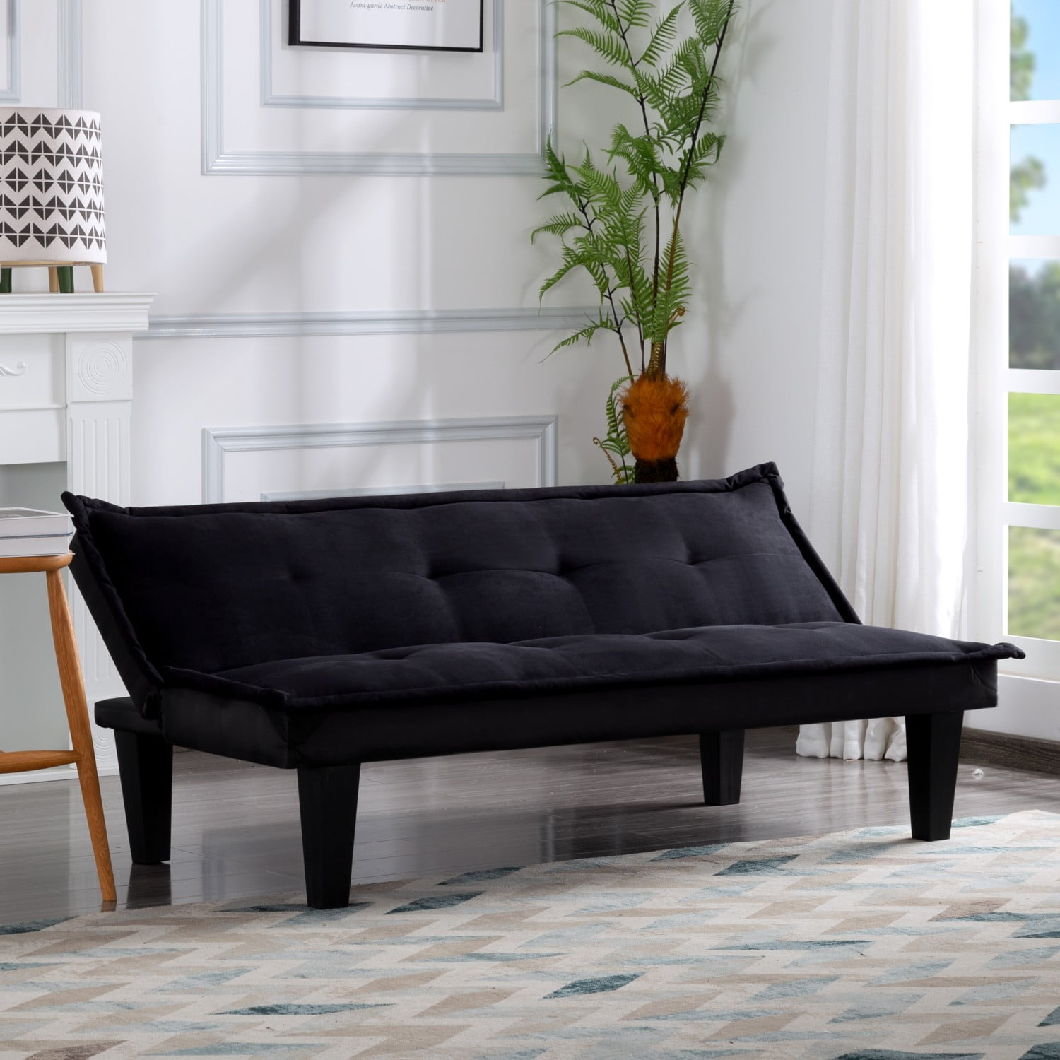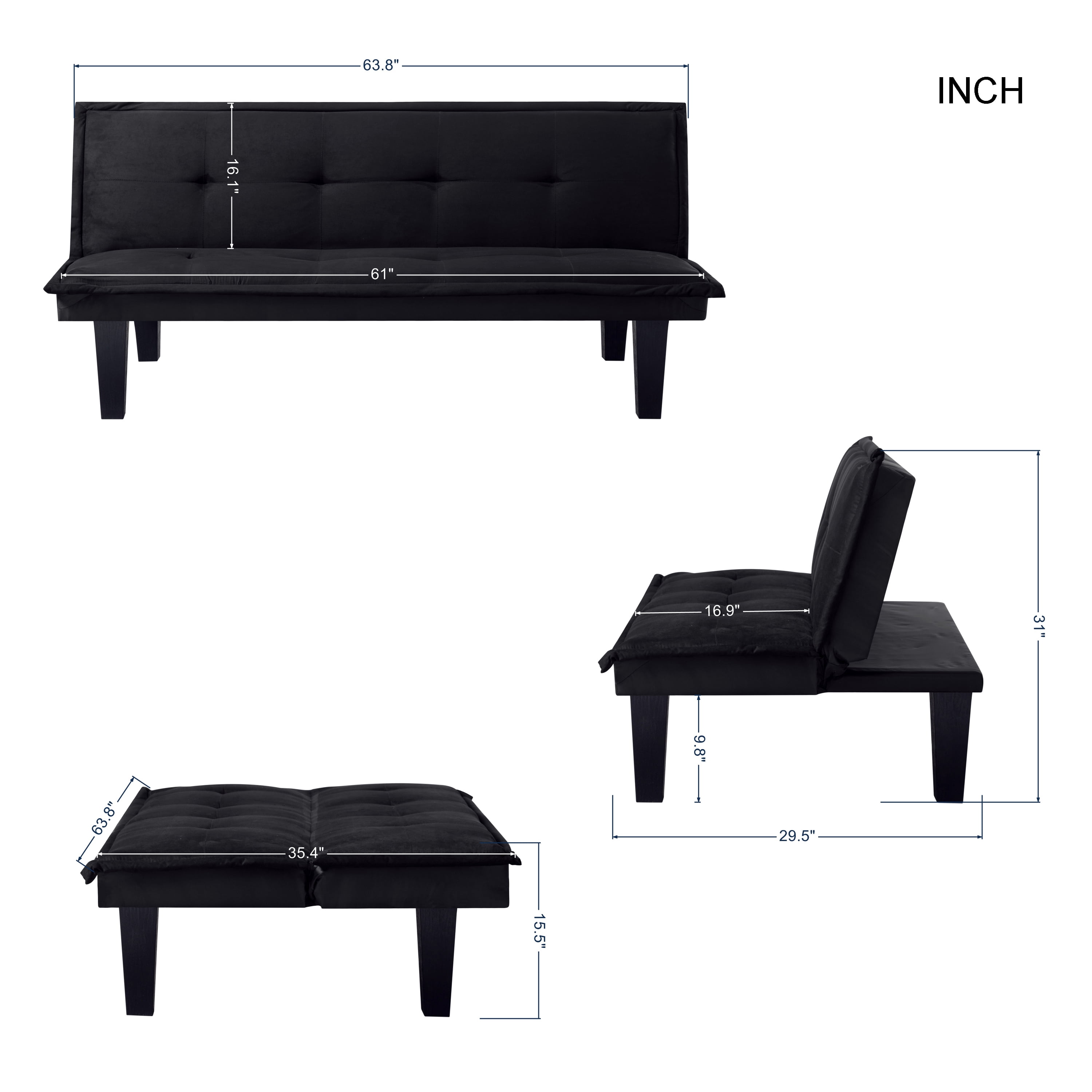 – 63.8″ Futon Sofa bed, can be converted to a fully functioning futon sleeper in few seconds, it is an excellent option for your home, office, and guest room. – Multi-functional design: The backrest has 3 adjustable positions , and converted into a sleeping bed. Perfect for unexpected overnight guests, or just a handy spot for a nap. Also perfect for small spaces. -Upholstered with faux suede, wrapped with piping edge. Founded on a solid and manufactured wood frame. Plastic legs.