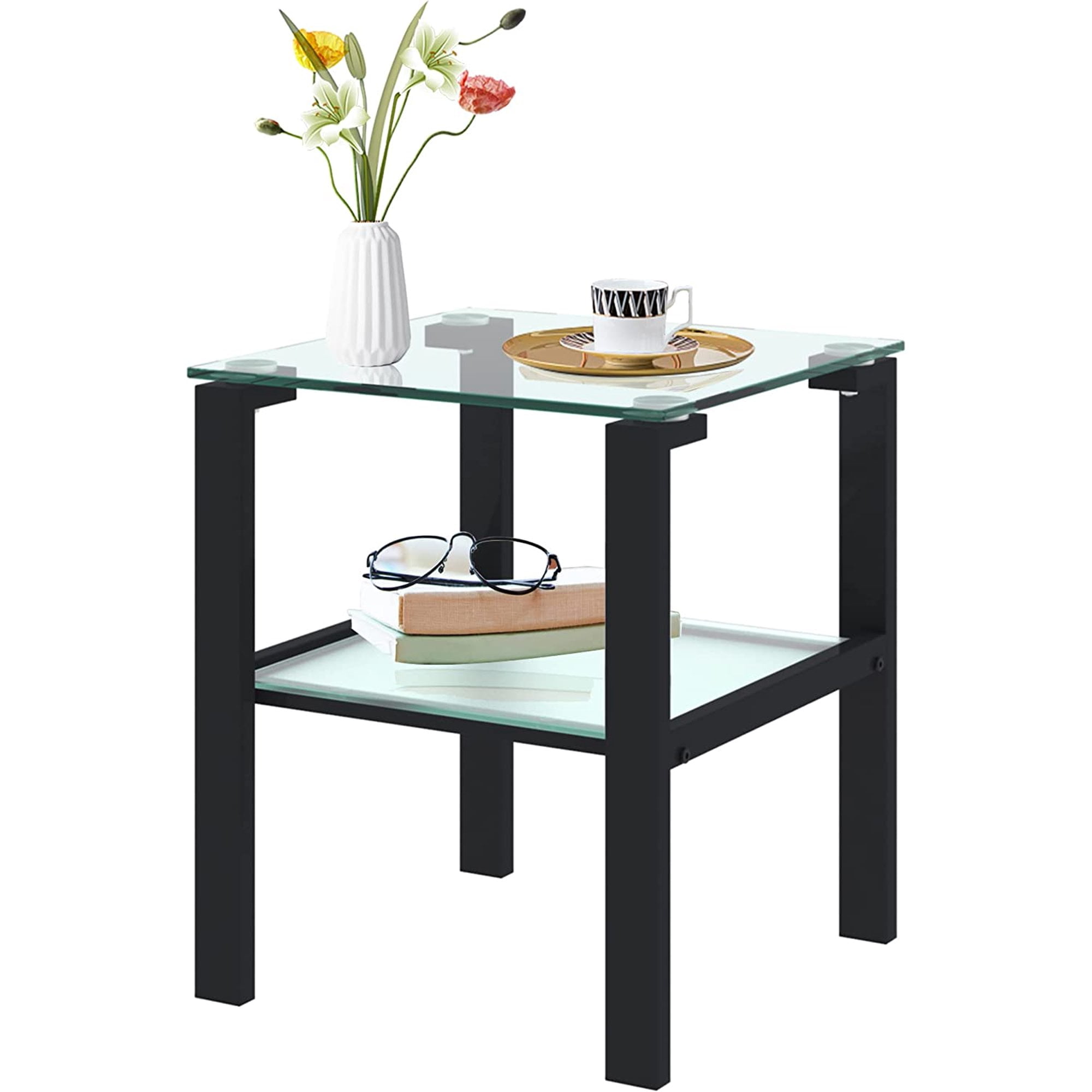 Gewnee Glass End Table,2-Tier Side Table Nightstand Corner Table in Black for Bedroom Living Room