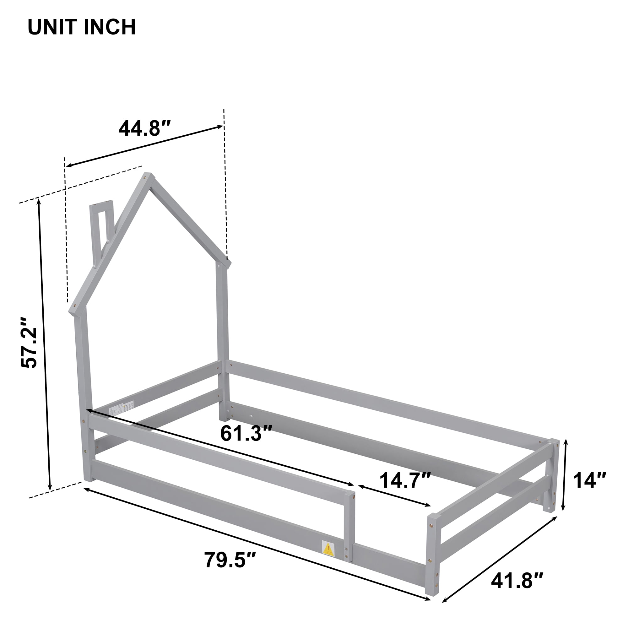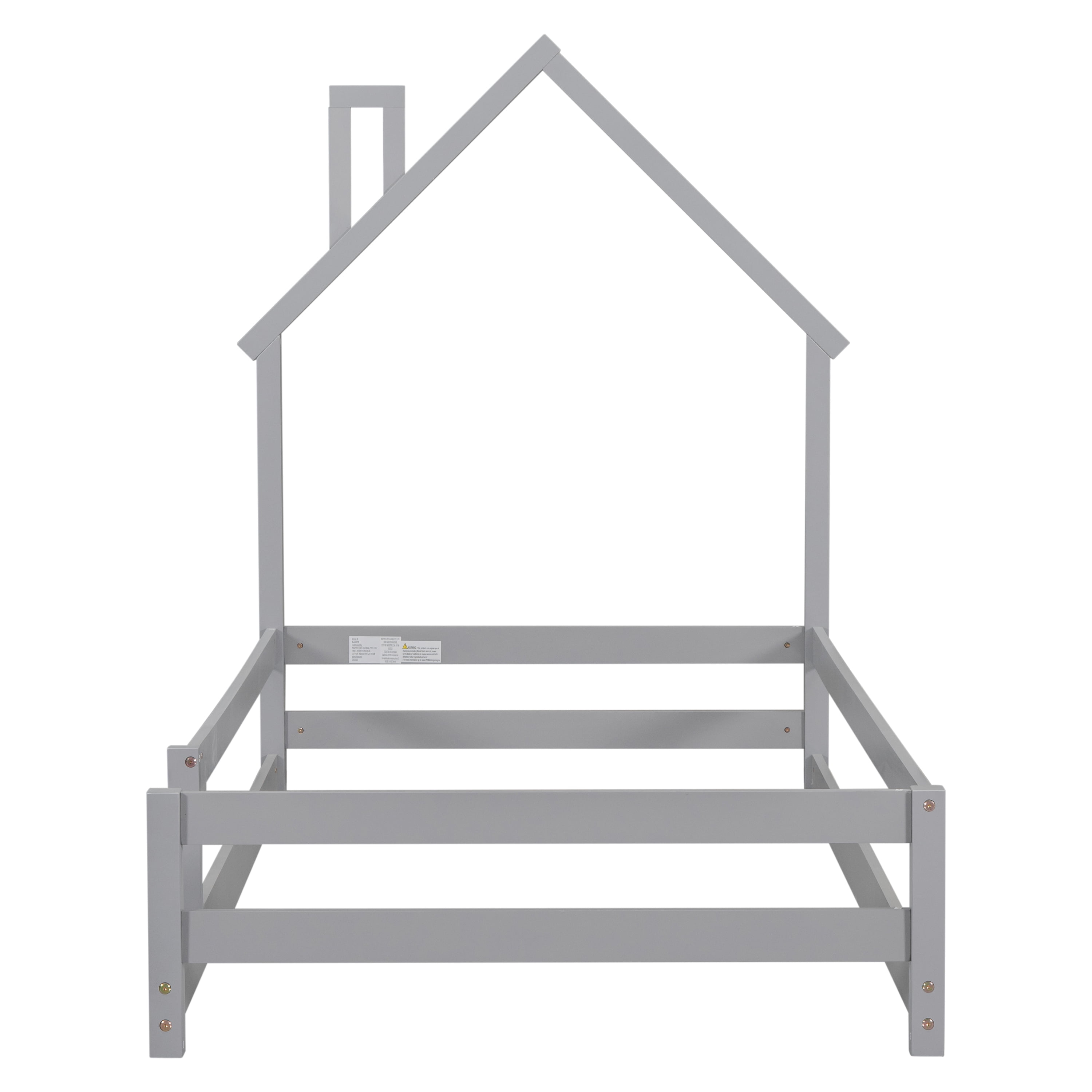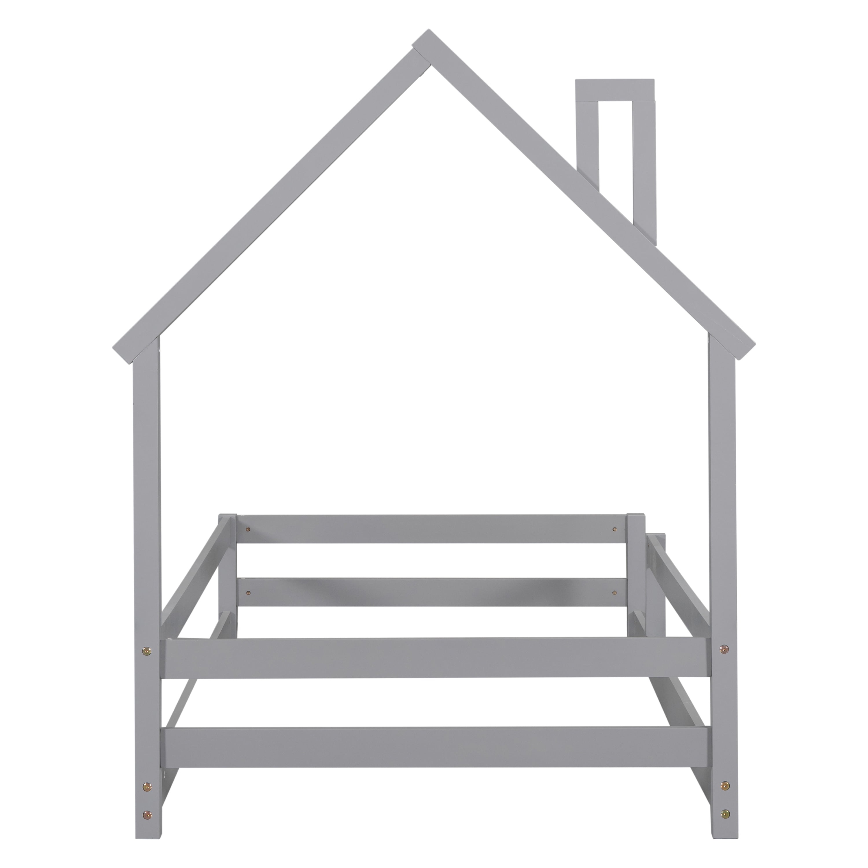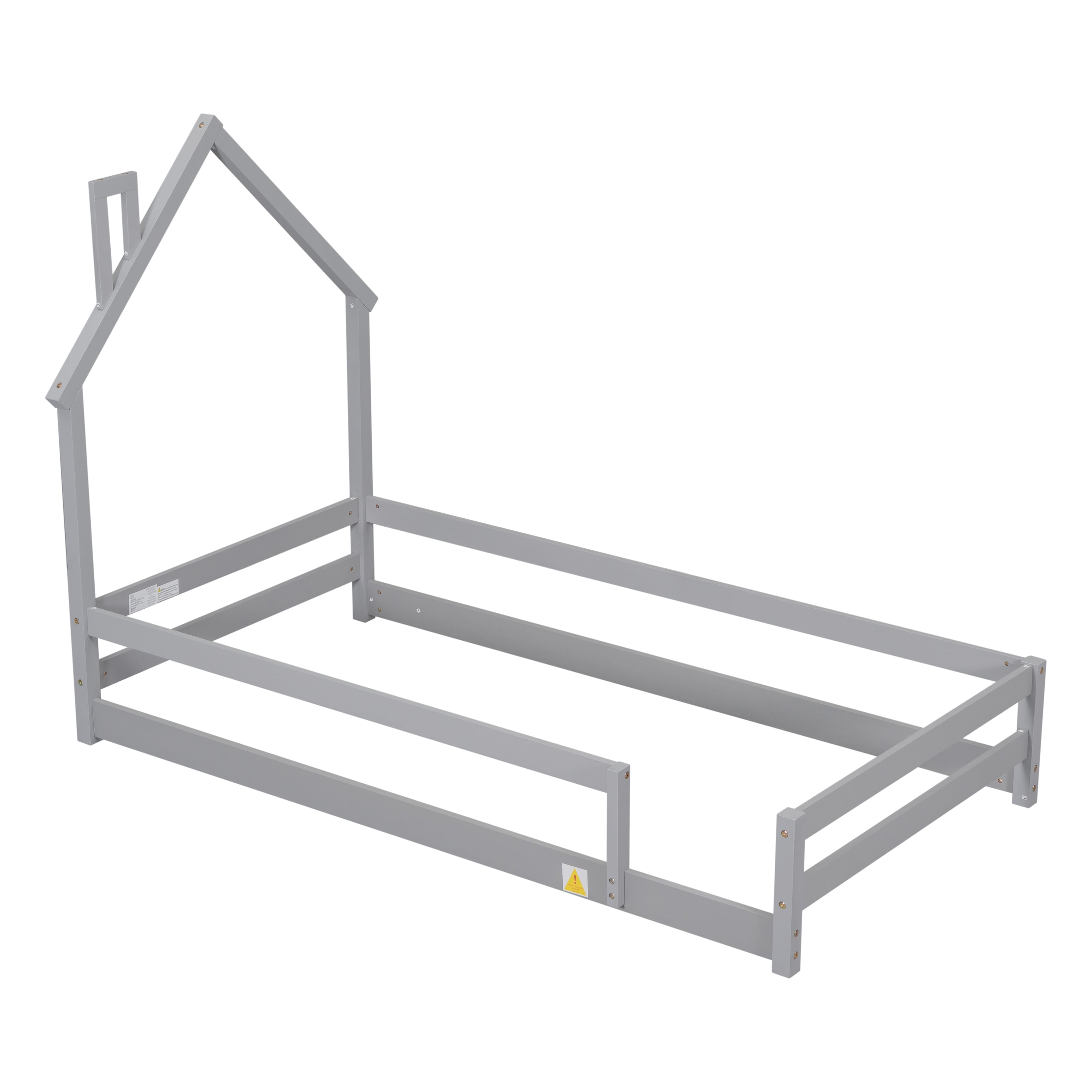 Gewnee Twin Size Wooden Children’s Bed with House Shape Headboard, Fenced Floor Bed, Gray