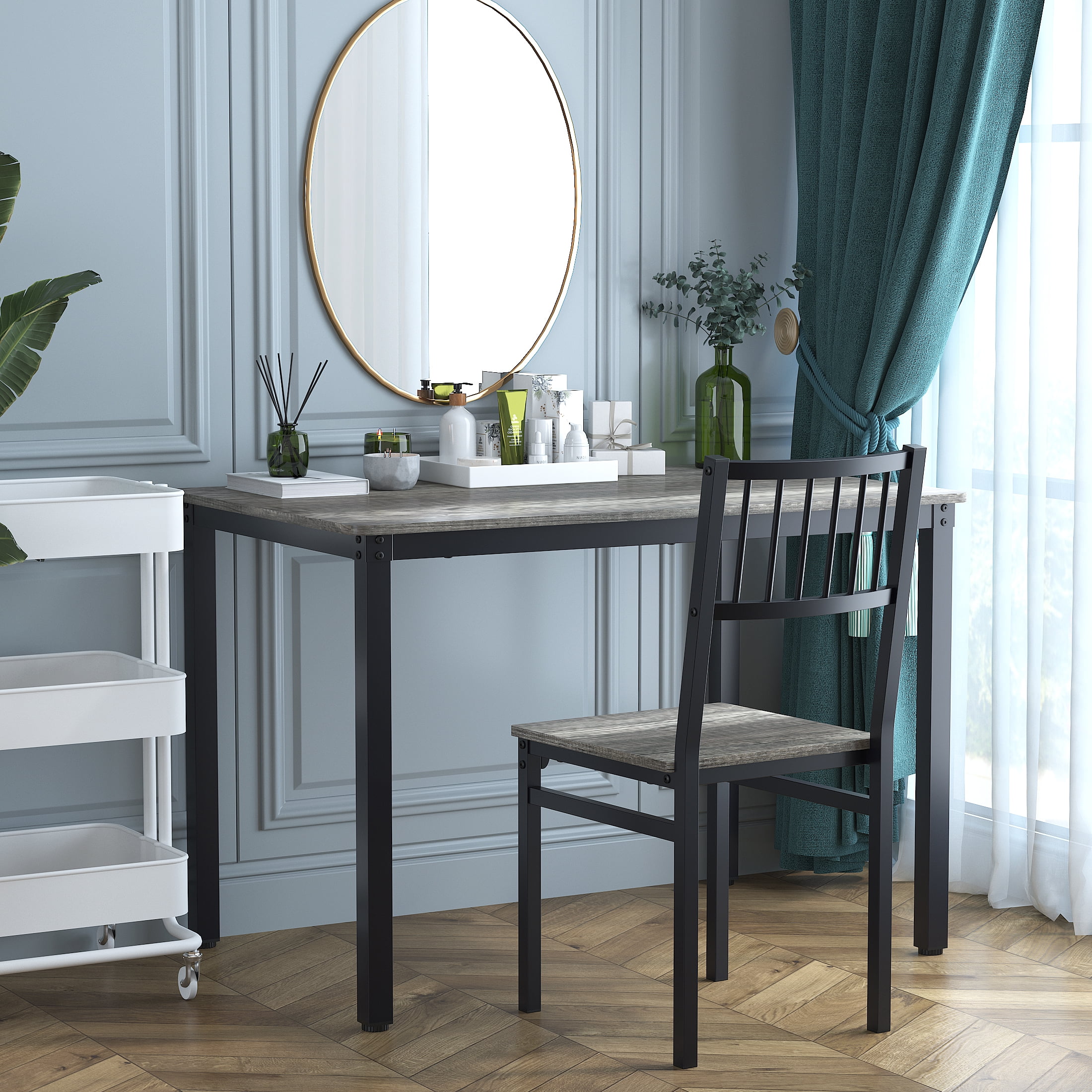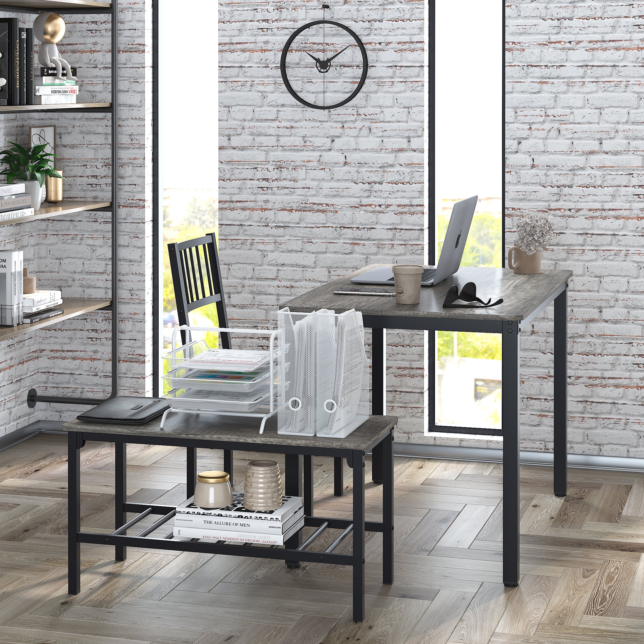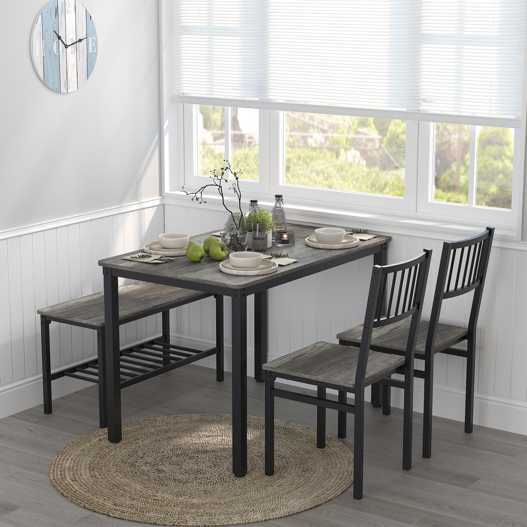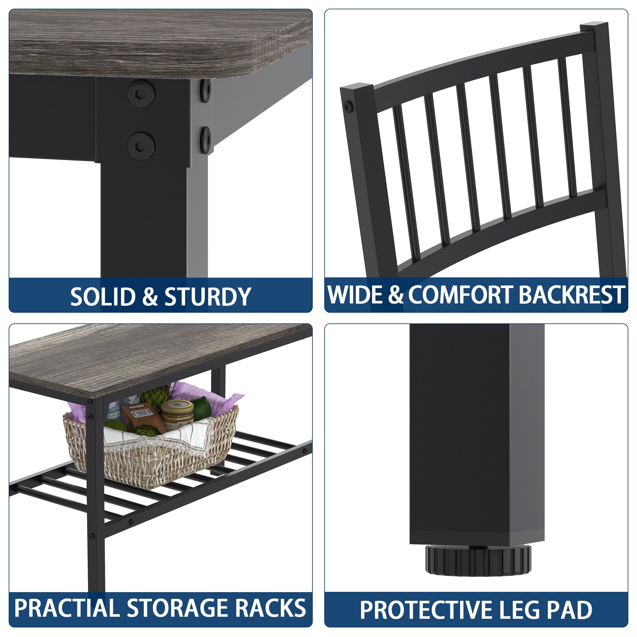 Key Features: 4 PERSON FAMILY DINING TABLE – Modern, elegant and fashionable design dining room table set includes a table, 2 chairs, and a 2-person bench, perfect for family meals or gatherings in your kitchen or dining area. BUILT-IN STORAGE RACKS – Metal racks under the bench can conveniently hold books, board games, seat cushions, blankets, table mats, coasters, shoes and much more. MULTIPURPOSE CONSOLE TABLE – Our bistro table set can also be used as a computer desk, study desk, writing desk, side table, entryway table and bench, breakfast nook or entertaining space. It is ideal for kitchen, dining room, cafe, pantry, apartment, etc. STURDY & DURABLE CONSTRUCTION – This dining table set is made of premium MDF and sturdy steel frame, which is corrosion-resistant and durable for a long lifespan. Thanks to firm structure, the table can withstand up to 220lbs, while each bench can bear 280lbs without wobbling. EASY TO ASSEMBLY AND CLEAN – This 4 piece dining table set comes with a clear and brief instruction. In addition, the smooth surface is waterproof and easy to keep clean with a damp cloth. Specifications: Material: Medium Density Fiberboard Thicken Board: 0.6″ Dining Table Size: 43.3” (L) x 27.4” (D) x 29.53” (H) Package Size: 47.2″(L) x 30.3″(D) x4.7″(H) Package Weight: 77lbs Table Bearing Capacity: Up to 220lbs Chair Bearing Capacity: Up to 280lbs Package Lists: 1 x Dining Table 2 x Chairs 1 x Bench 1 x Installation Manual All Accessories Round Corner Design offer you a more safety and stylish study table. Space Saving Design.
