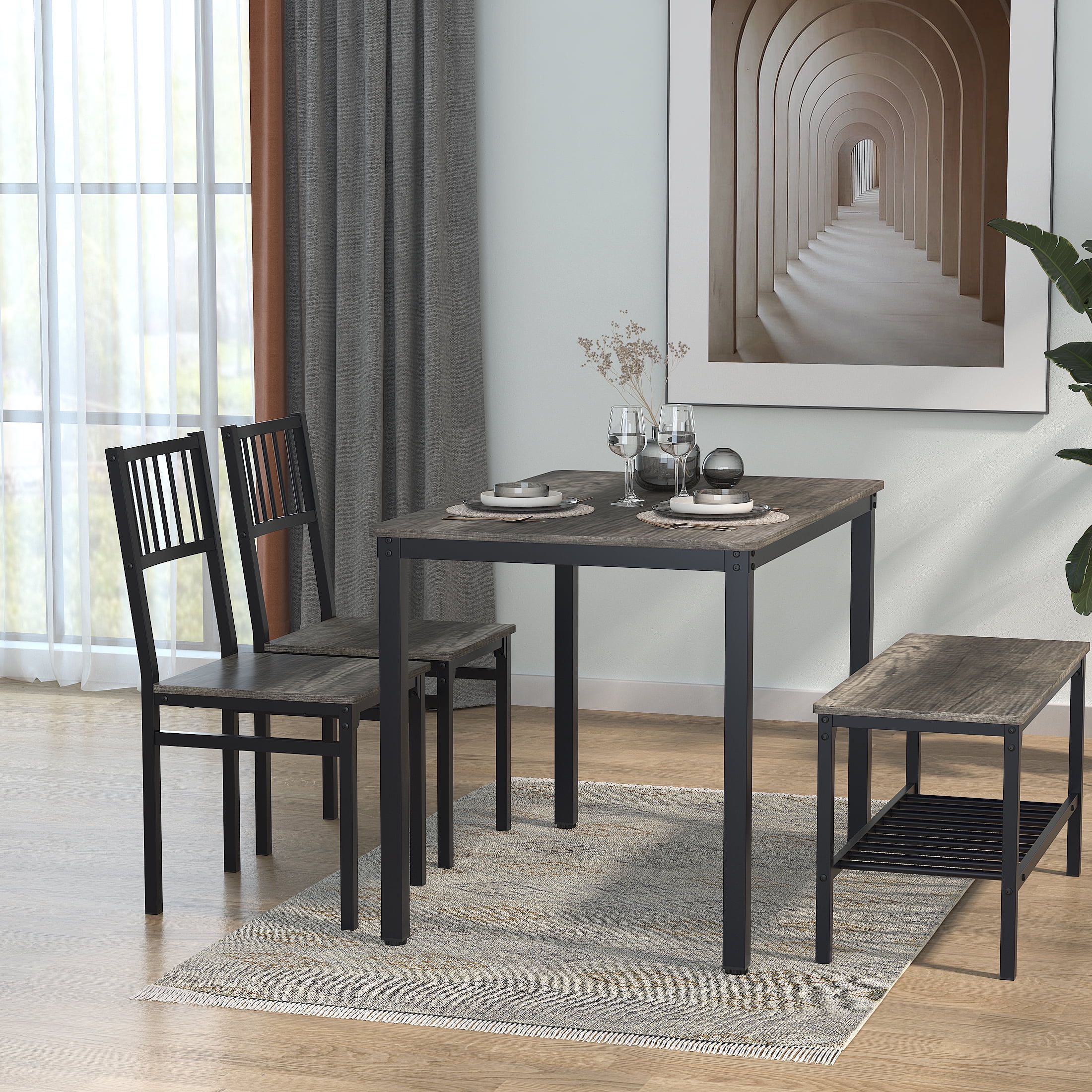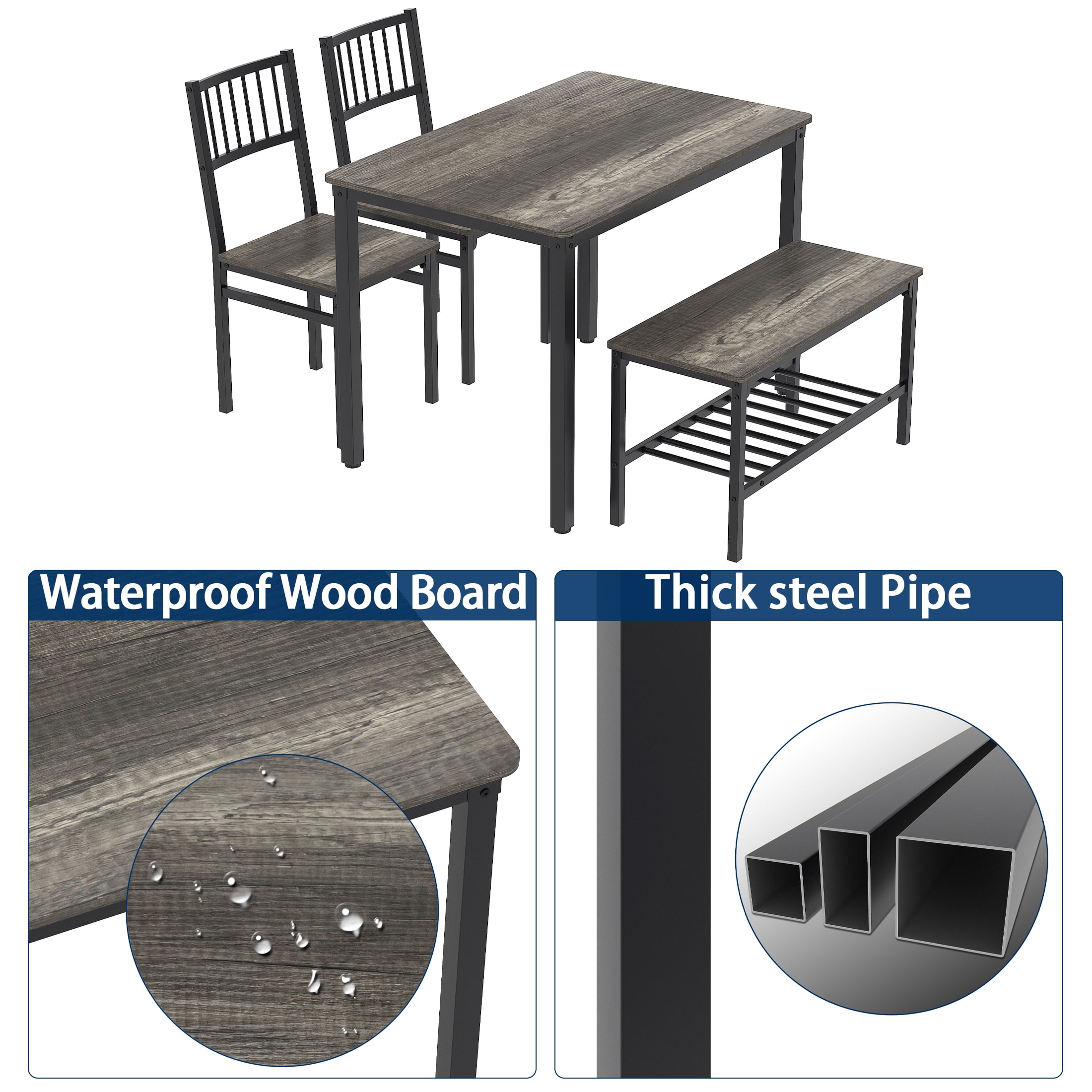 Key Features: 4 PERSON FAMILY DINING TABLE – Modern, elegant and fashionable design dining room table set includes a table, 2 chairs, and a 2-person bench, perfect for family meals or gatherings in your kitchen or dining area. BUILT-IN STORAGE RACKS – Metal racks under the bench can conveniently hold books, board games, seat cushions, blankets, table mats, coasters, shoes and much more. MULTIPURPOSE CONSOLE TABLE – Our bistro table set can also be used as a computer desk, study desk, writing desk, side table, entryway table and bench, breakfast nook or entertaining space. It is ideal for kitchen, dining room, cafe, pantry, apartment, etc. STURDY & DURABLE CONSTRUCTION – This dining table set is made of premium MDF and sturdy steel frame, which is corrosion-resistant and durable for a long lifespan. Thanks to firm structure, the table can withstand up to 220lbs, while each bench can bear 280lbs without wobbling. EASY TO ASSEMBLY AND CLEAN – This 4 piece dining table set comes with a clear and brief instruction. In addition, the smooth surface is waterproof and easy to keep clean with a damp cloth. Specifications: Material: Medium Density Fiberboard Thicken Board: 0.6″ Dining Table Size: 43.3” (L) x 27.4” (D) x 29.53” (H) Package Size: 48″(L) x 30.3″(D) x4.7″(H) Package Weight: 77.17lbs Table Bearing Capacity: Up to 220lbs Chair Bearing Capacity: Up to 280lbs Package Lists: 1 x Dining Table 2 x Chairs 1 x Bench 1 x Installation Manual All Accessories