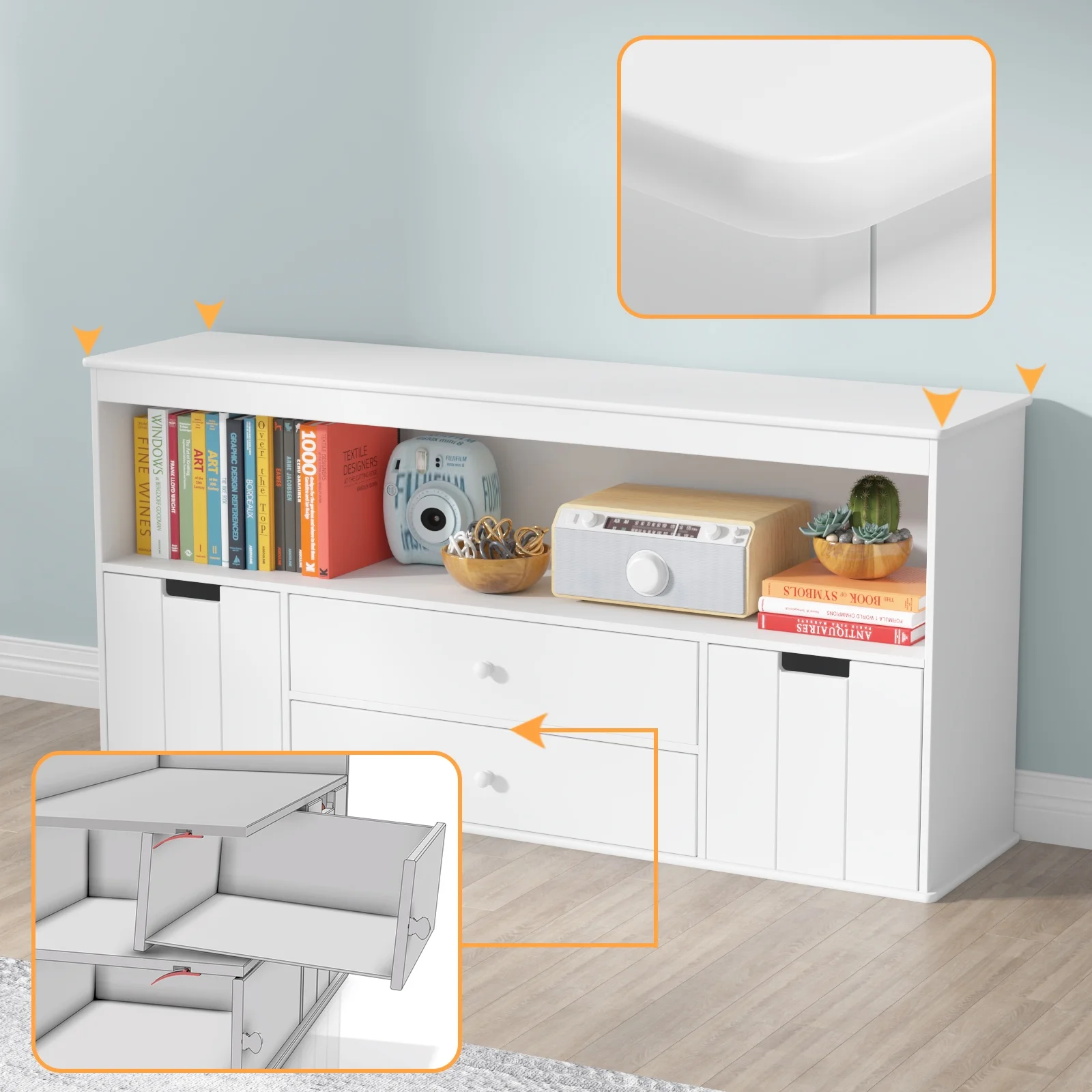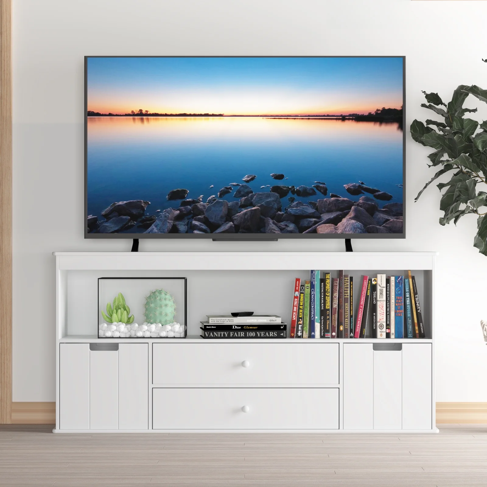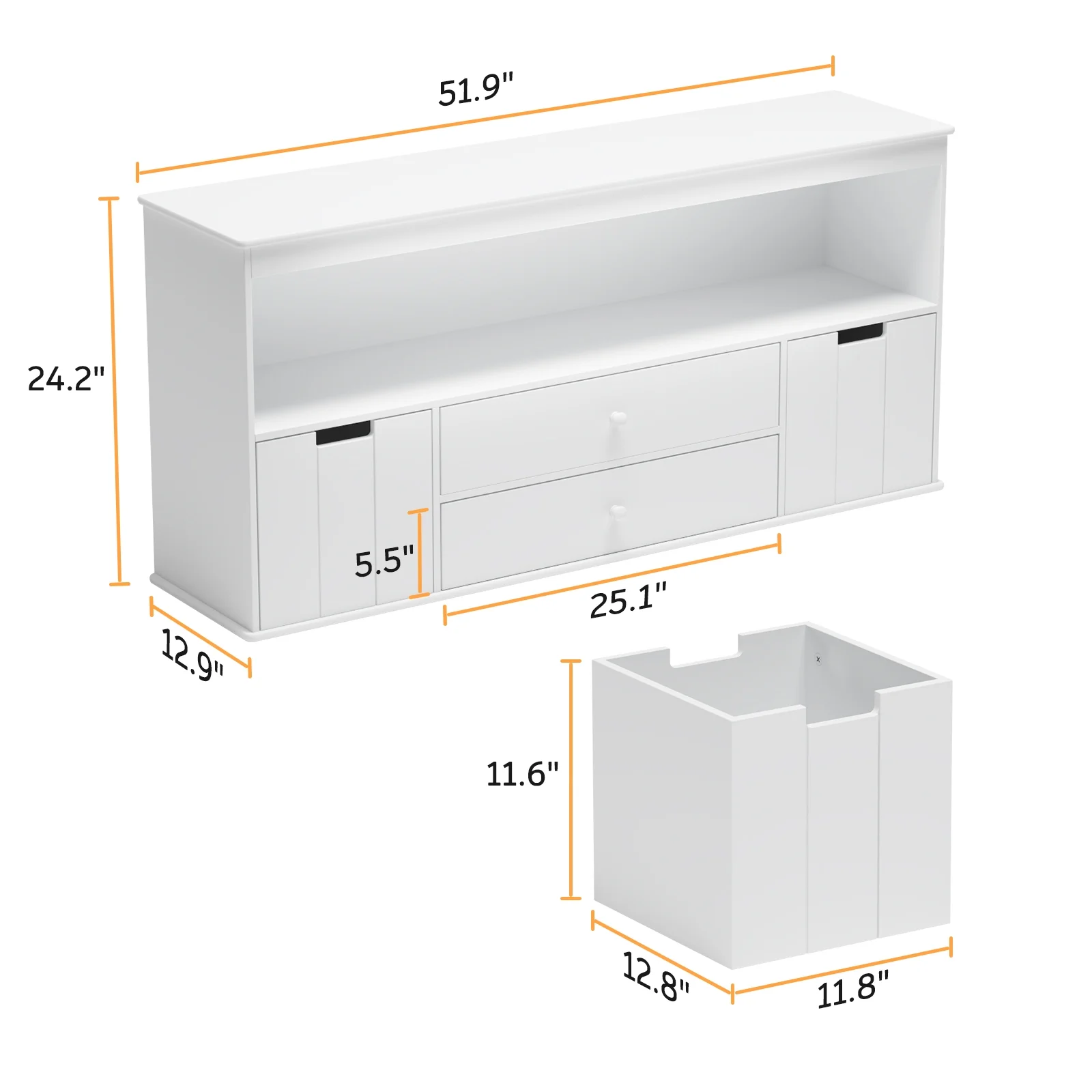 Features: Large Capacity Cabinet – Featuring a large space shelf, two removable cabinets, and two drawers, this cabinet is great for organizing your kid’s toys, books, photo frames, and every scattered stuff. Simple design open-ended shelf space and drawers can be a classroom storage cabinet, kid’s bookcase, building block case, and more. Durable with Sturdy Construction – Our storage cabinet is made from hardwearing MDF with a clean white finish to complement classic and modern interiors. Its structure is strong enough to withstand a weight of 150 lbs, therefore the credenza could be to a TV stand or Kitchen cabinet. Multifunction Storage Cabinet – This toy storage cabinet could be placed in the living room, bedroom, kid’s room, reading room, an entryway to as the toys chest, toy storage cabinet, TV cabinet, kitchen table, entry decoration, etc. It will make your stuff neat and organized, No more worrying about the mess in your home. Storage & Space Saving Solutions – This entertainment center provides you with useful storage solutions to organize your space and offer you value style and quality. Simple design but help save a lot of space. Easy to Assemble – All the boards and hardware are included. Instruction is also included for easy installation. Specifications: Material: Wood and MDF Product Size: 51.9 x 12.9 x 24.2 inches Package Size: 55.52 x 15.75 x 6.5 inches Gross / Net Weight: 73.86 lbs. / 70 lbs. Package List: 1 x Wood Storage Cabinet with Drawers 1 x Accessories Kit