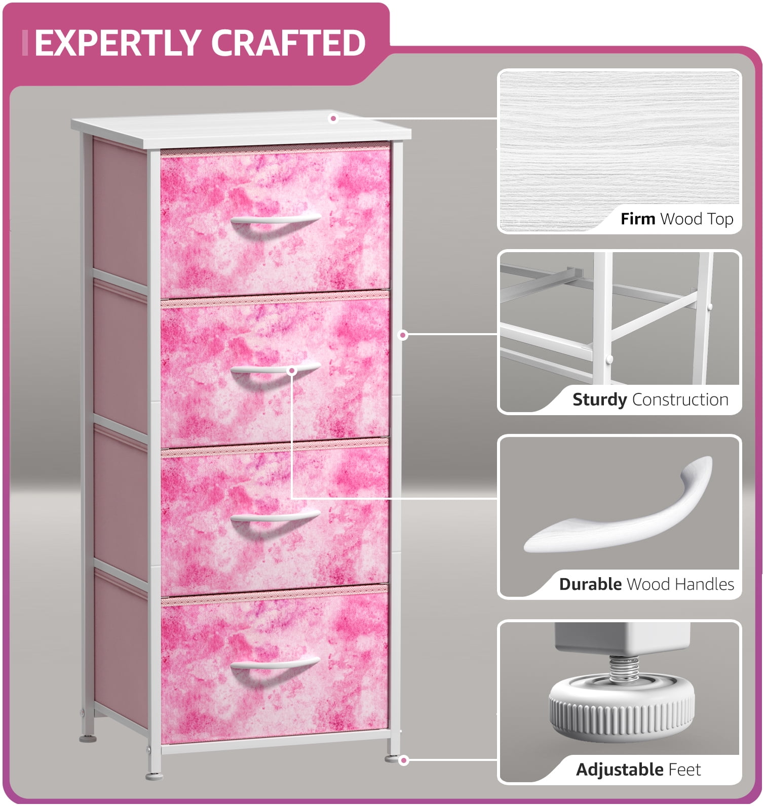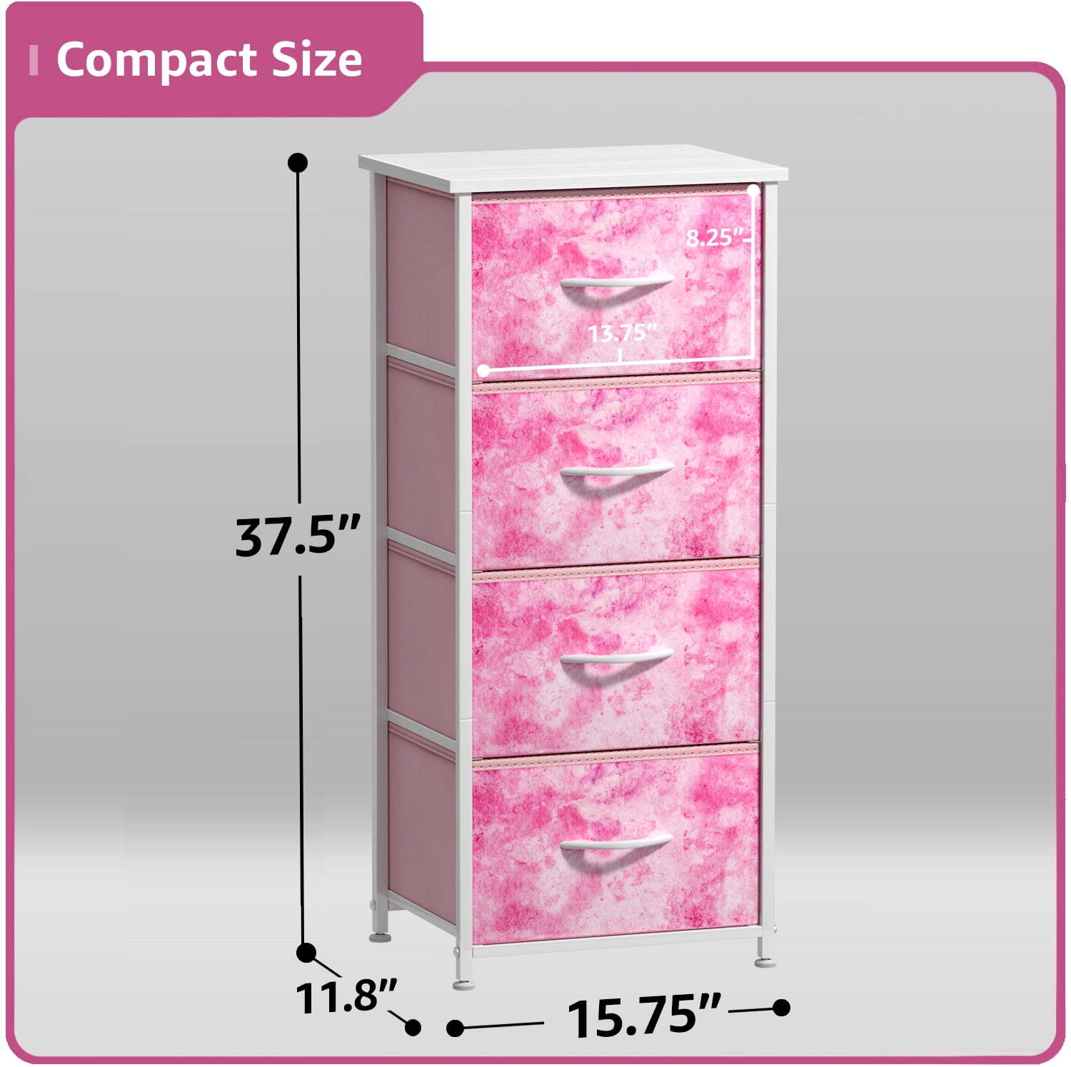 Update your child’s room with the Sorbus 4-Drawer Nightstand. This charming piece features a tabletop surface and pull-out drawers to tuck away household clutter. Place all of your child’s folded t-shirts, jeans, and pajamas, or extra blankets and toys within the spacious fabric drawers. For display, the top surface can be used for lamps, books, clocks, and more. The playful tie-dye color combo makes this furniture storage ideal for any nursery, playroom, or bedroom. It is lightweight for easy transport and when not in use, simply fold the fabric drawers flat for storage. Complete the look with any drawer configuration from the Sorbus Furniture Collection. Multi-purpose for any room. Bring on the toys, books, and blankets! Display this charming nightstand in your kid’s bedroom filled with linens and clothes or play area complete with coloring books, Legos, plushies, and dolls! The soft lightweight fabric makes it easy for kids to pull out their favorite toys for play dates or easily put them away within the color-coded drawers. In the nursery, this chest brightens up your little one’s sleeping space for stylish baby storage. With kids and teens in mind, it complements pastel rainbow décor, unicorn themes, and trendy ombré colors for a fun look. Trendy design with easy assembly. 4-drawer dresser (Tie-dye Pink). Lightweight and easy to assemble. Hardware and instructions INCLUDED. Drawers made of non-woven (polyester) fabric. Frame made of steel and MDF wood with white finish. Accessories shown in image NOT INCLUDED. Measures approximately 15.75” L x 11.8” W x 37.50” H.
