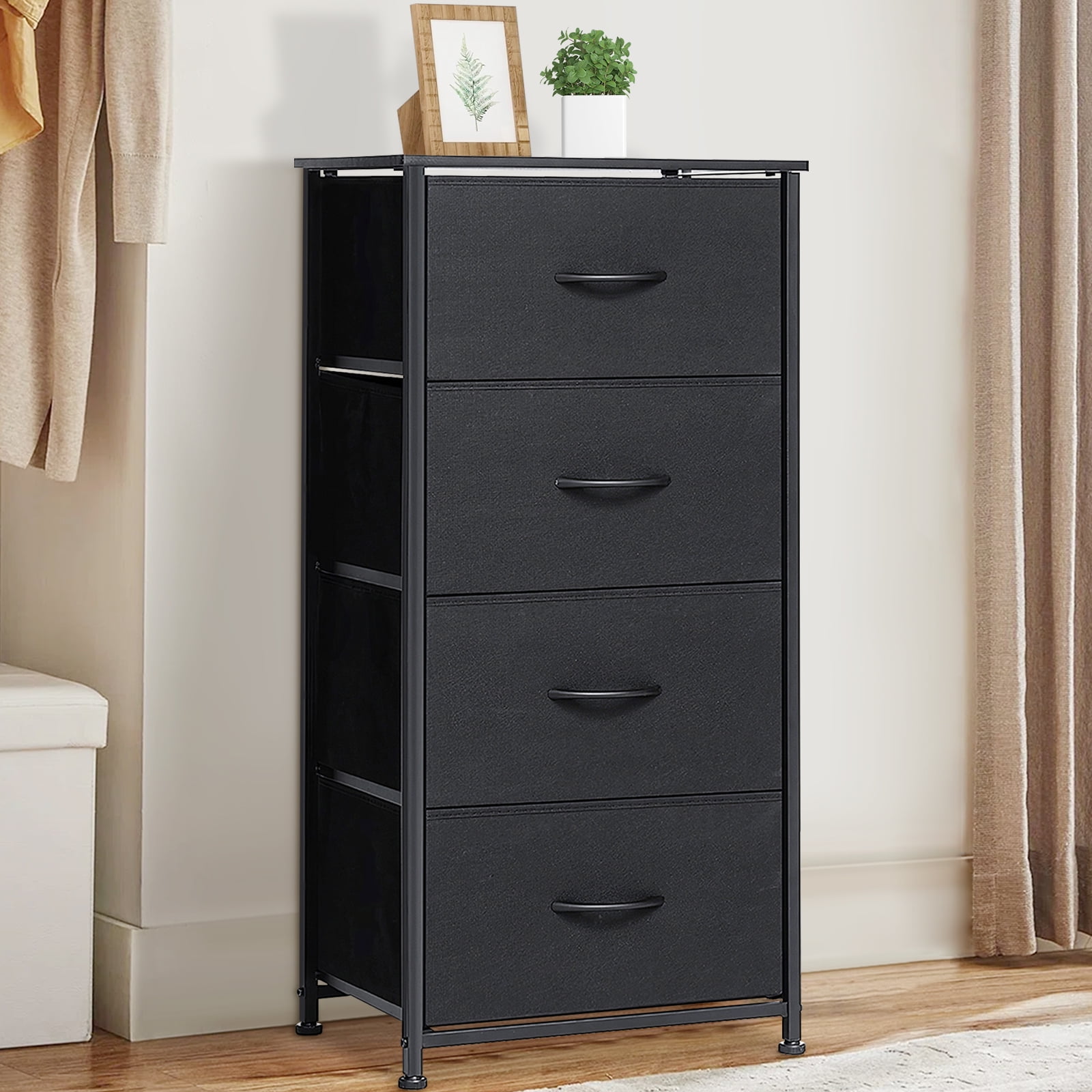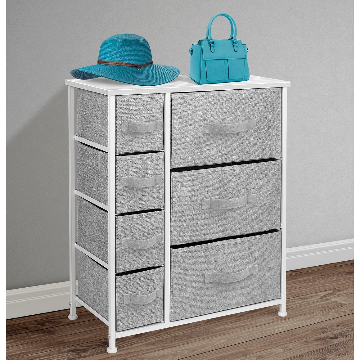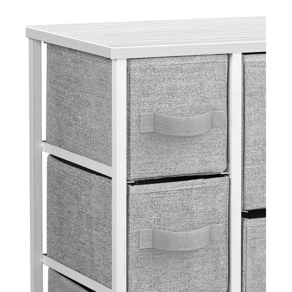 Sorbus River Layne Modern 7-drawer Chest,White 7-DRAWER DRESSER (BLACK) — Style meets function with our small dresser chest, complete with a wood surface and storage drawers — Pairs beautifully with the Sorbus Foldable Furniture Collection DISPLAY & DE-CLUTTER — Wood top provides hard surface for displaying lamps, alarm clocks, books, eyeglasses, charging station, and more — Drawers great for storing clothes, blankets, linens, baby clothes, lingerie, purses, scarves, socks, accessories, gadgets, toiletries, cosmetics, hair/beauty products, paperwork, toys, knitting supplies, and household clutter FOR HOME, OFFICE, DORM — Suitable for bedroom, living room dresser, guest room, closet, nursery, hallway, , college dorm, small apartment solutions, etc — Can be used as dressers for bedroom, storage cube dresser, 7 drawer dresser, small closet dresser, storage chest, living room dresser, sofa end tables, office supply storage, kids nightstand, or baby nursery table — Complements most décor whether traditional, rustic, or modern REMOVABLE & FOLDABLE DRAWERS — Soft fabric drawers with reinforced base — Easy pull handle for quiet opening and closing — Removable Drawers fold flat for easy storage when not in use — Entire unit is portable, lightweight, and easy to relocate to different spaces — Small drawers approx. 6” deep — Large drawers approx. 8” deep SMART & STYLISH DESIGN — Sleek wide storage — Made with strong steel frame and durable MDF wood top with smooth black finish — Charcoal gray drawers made of breathable, non-woven fabric — Wipe clean — Minimal assembly required — Hardware and instructions INCLUDED —Measures approximately 25” L x 11.87” W x 28.75” H This beautiful dresser chest features a tabletop surface and pull-out drawers to tuck away household clutter. The thoughtful design is great for small living spaces and works equally well near the bed or sofa. Organization enthusiasts will enjoy filling each drawer with clothing, linens, and knick-knicks from around the home. The lightweight frame makes this unit easy to transport and when not in use, simply fold the fabric drawers flat for storage. Use alone as a single unit or pair with any drawer configuration from the Sorbus Furniture Collection. With everything you need right by your side, getting organized has never looked better!