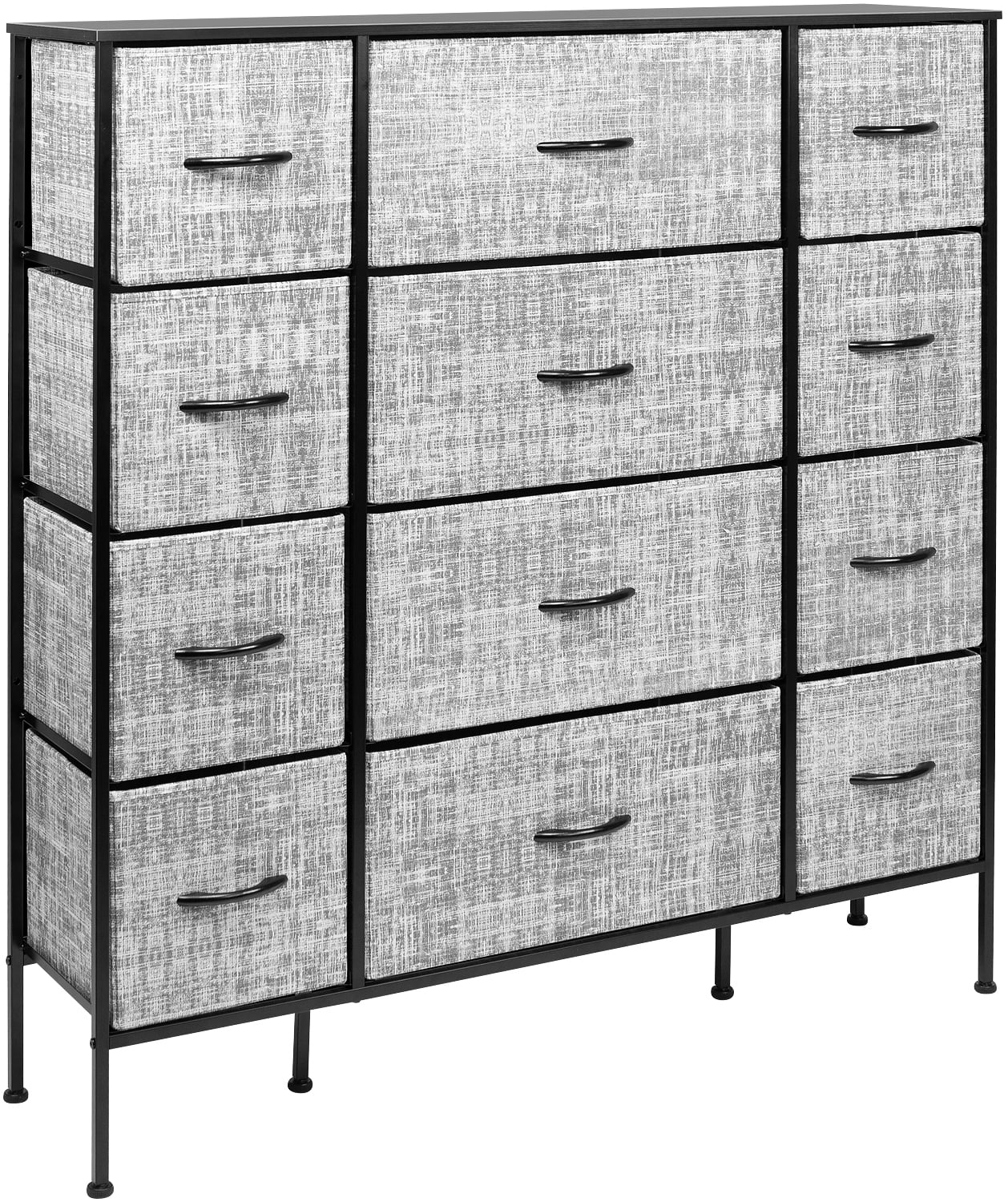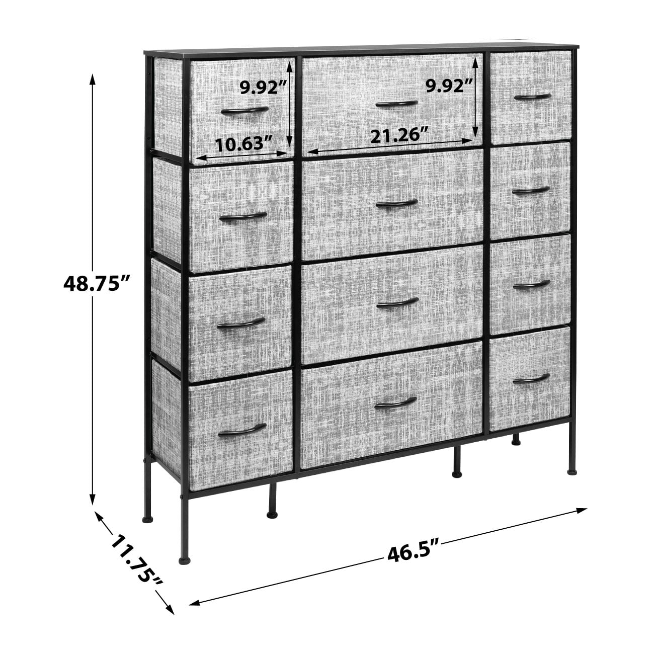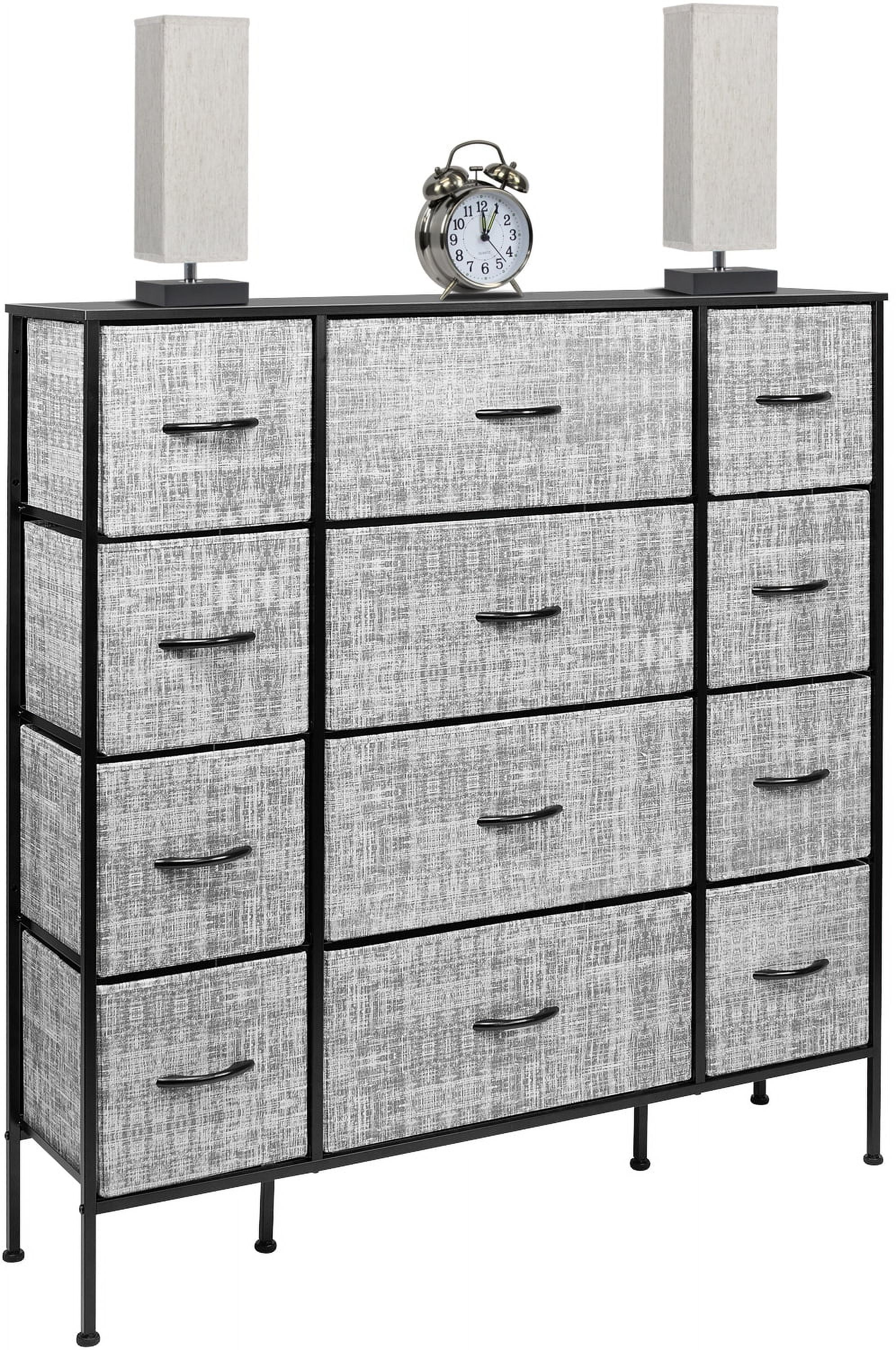 Organize your wardrobe with ease using the Sorbus extra-large steel and grey fabric 12-drawer dresser. Boasting a unique design with fabric drawers and a sturdy steel frame, this dresser offers lightweight storage without compromising on quality. Choose from various color options to match your decor and keep your essentials organized in style. Features: Strong steel frame MDF top 12 non-woven fabric drawers with cardboard base Grey drawer color White or black finish options Wood handles on drawers Foldable drawers for easy storage Adjustable feet for stability on uneven floors Minimal assembly required Measures 46.5 inches W x 11.75 inches D x 48.75 inches H
