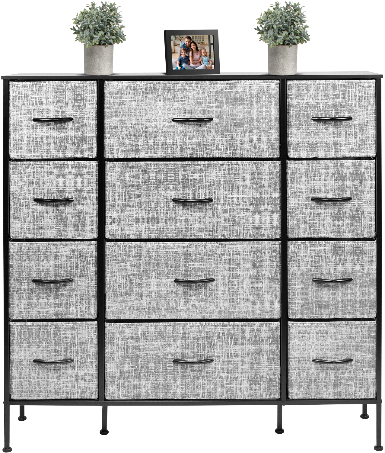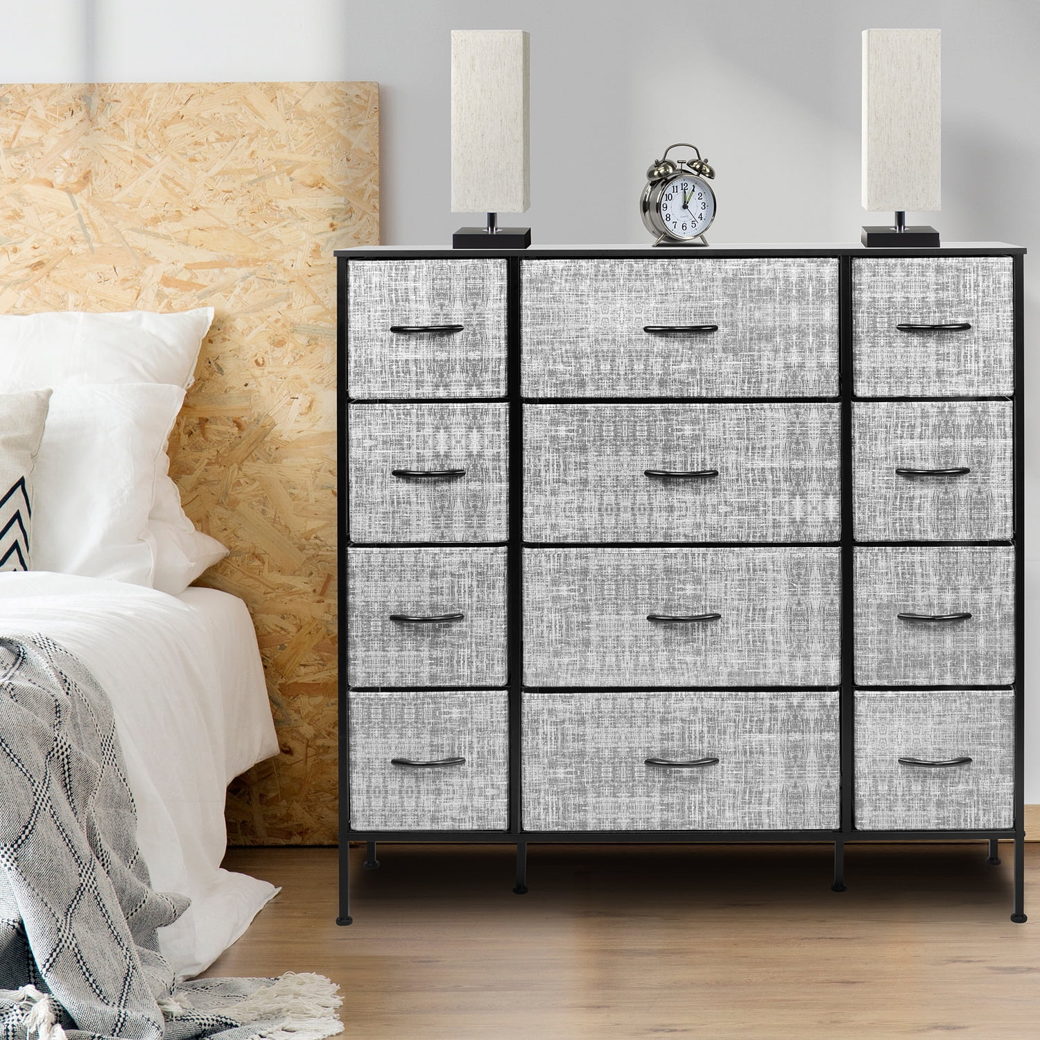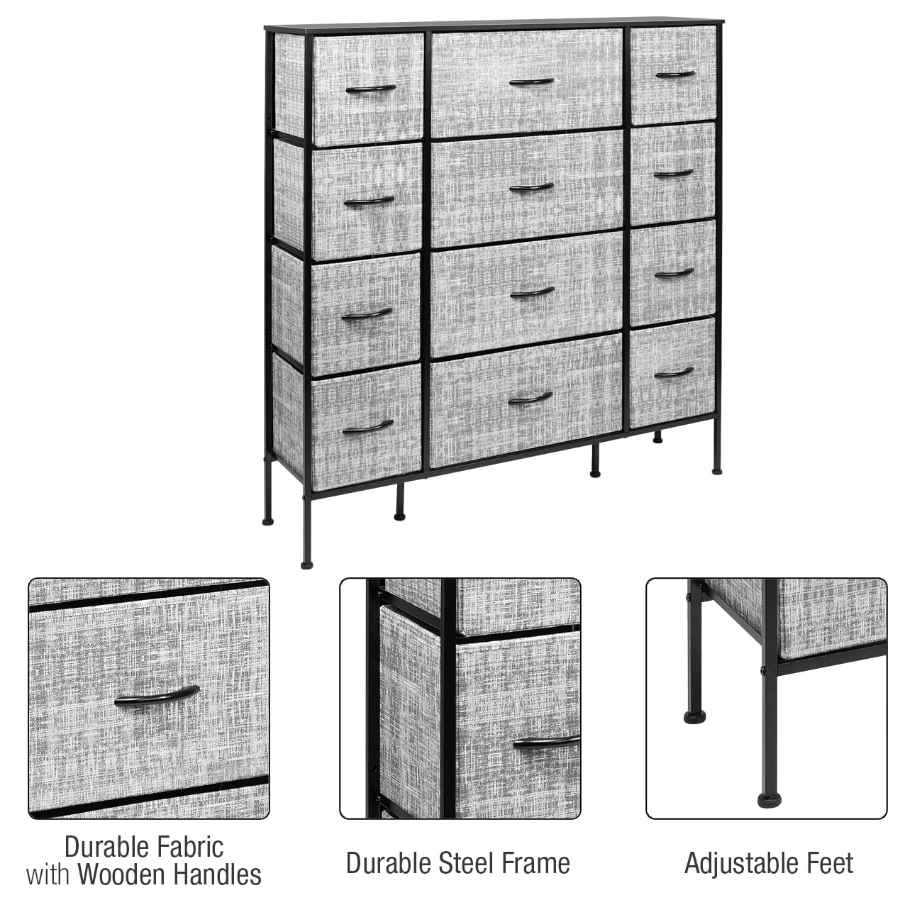 Organize your wardrobe with ease using the Sorbus extra-large steel and grey fabric 12-drawer dresser. Boasting a unique design with fabric drawers and a sturdy steel frame, this dresser offers lightweight storage without compromising on quality. Choose from various color options to match your decor and keep your essentials organized in style. Features: Strong steel frame MDF top 12 non-woven fabric drawers with cardboard base Grey drawer color White or black finish options Wood handles on drawers Foldable drawers for easy storage Adjustable feet for stability on uneven floors Minimal assembly required Measures 46.5 inches W x 11.75 inches D x 48.75 inches H