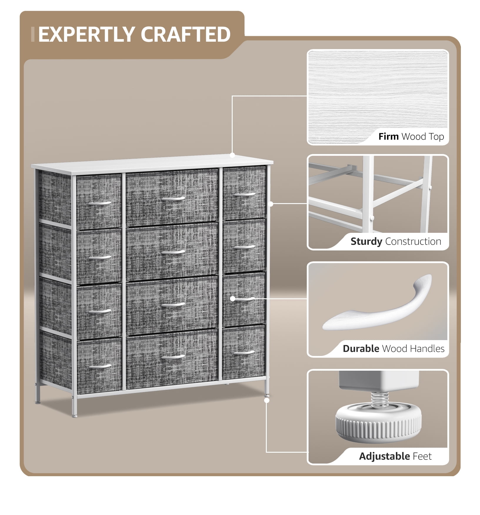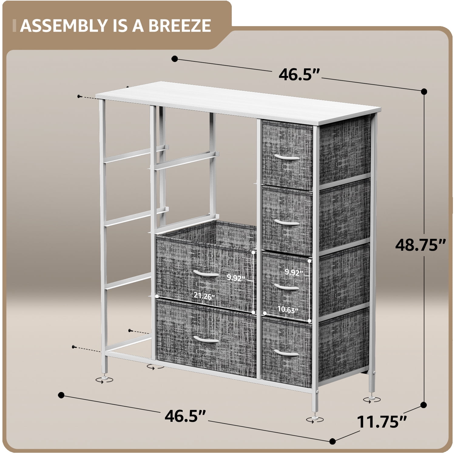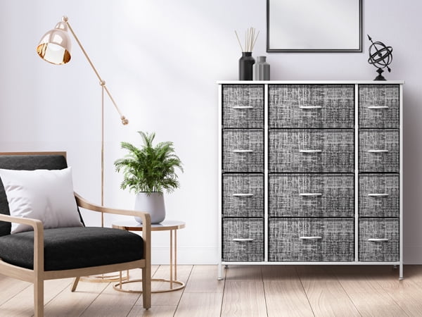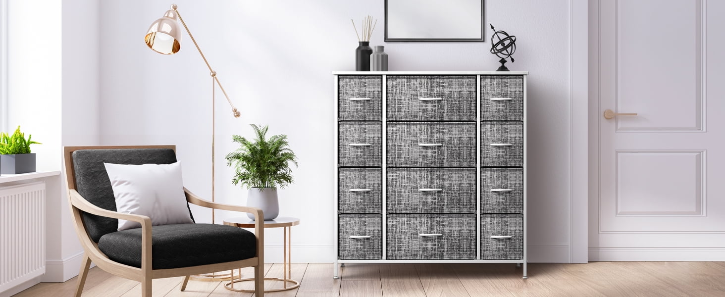 Organize your wardrobe with ease using the Sorbus extra-large steel and grey fabric 12-drawer dresser. Boasting a unique design with fabric drawers and a sturdy steel frame, this dresser offers lightweight storage without compromising on quality. Choose from various color options to match your decor and keep your essentials organized in style. Features: Strong steel frame MDF top 12 non-woven fabric drawers with cardboard base Grey drawer color White or black finish options Wood handles on drawers Foldable drawers for easy storage Adjustable feet for stability on uneven floors Minimal assembly required Measures 46.5 inches W x 11.75 inches D x 48.75 inches H