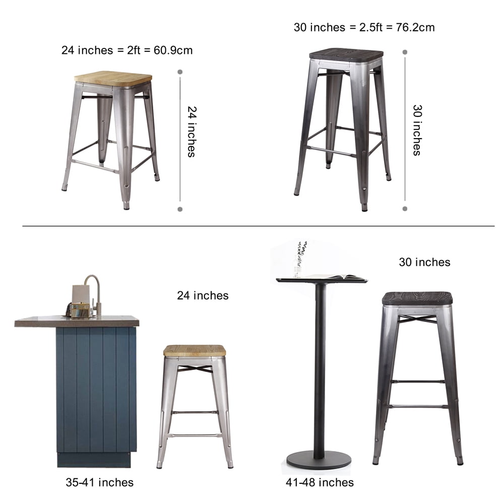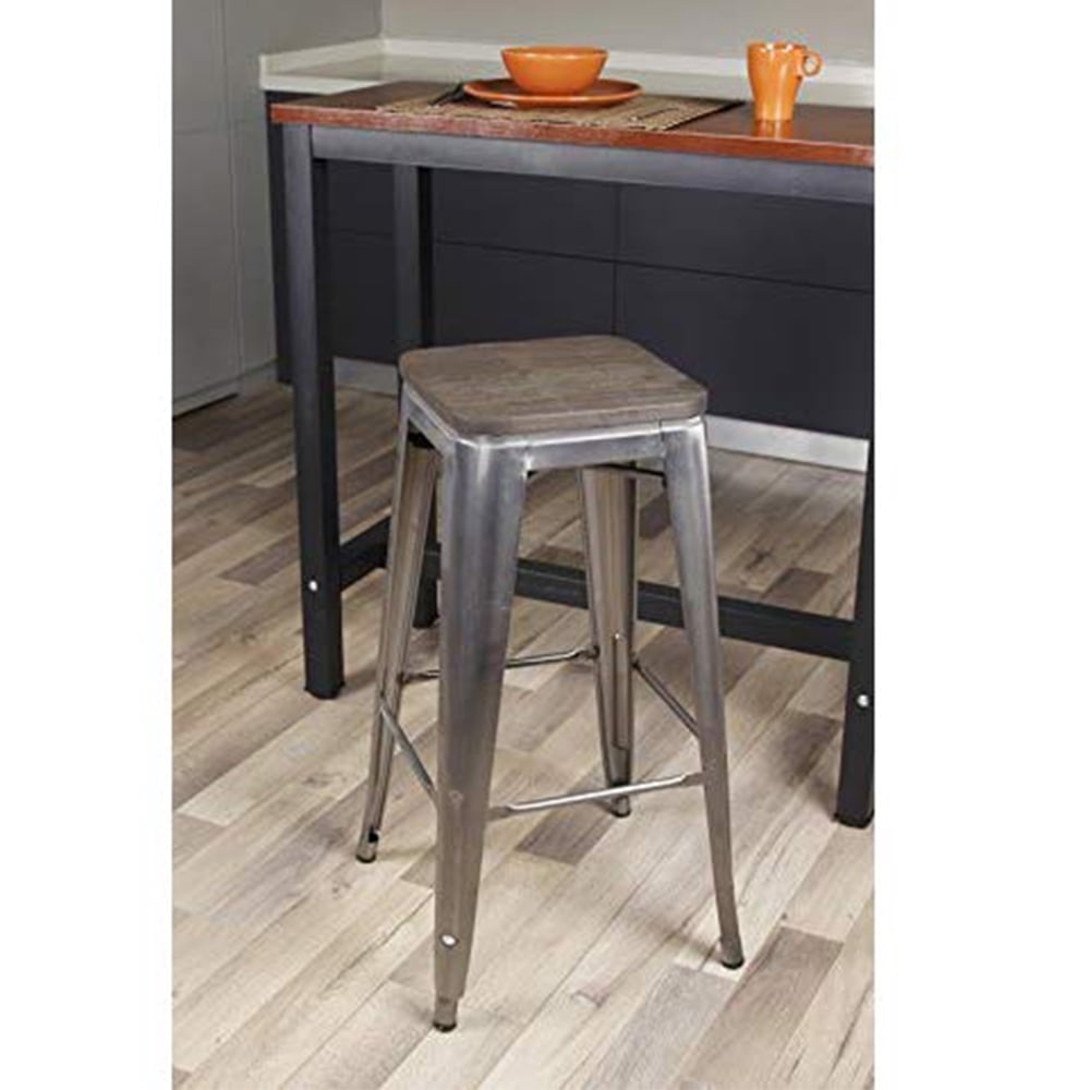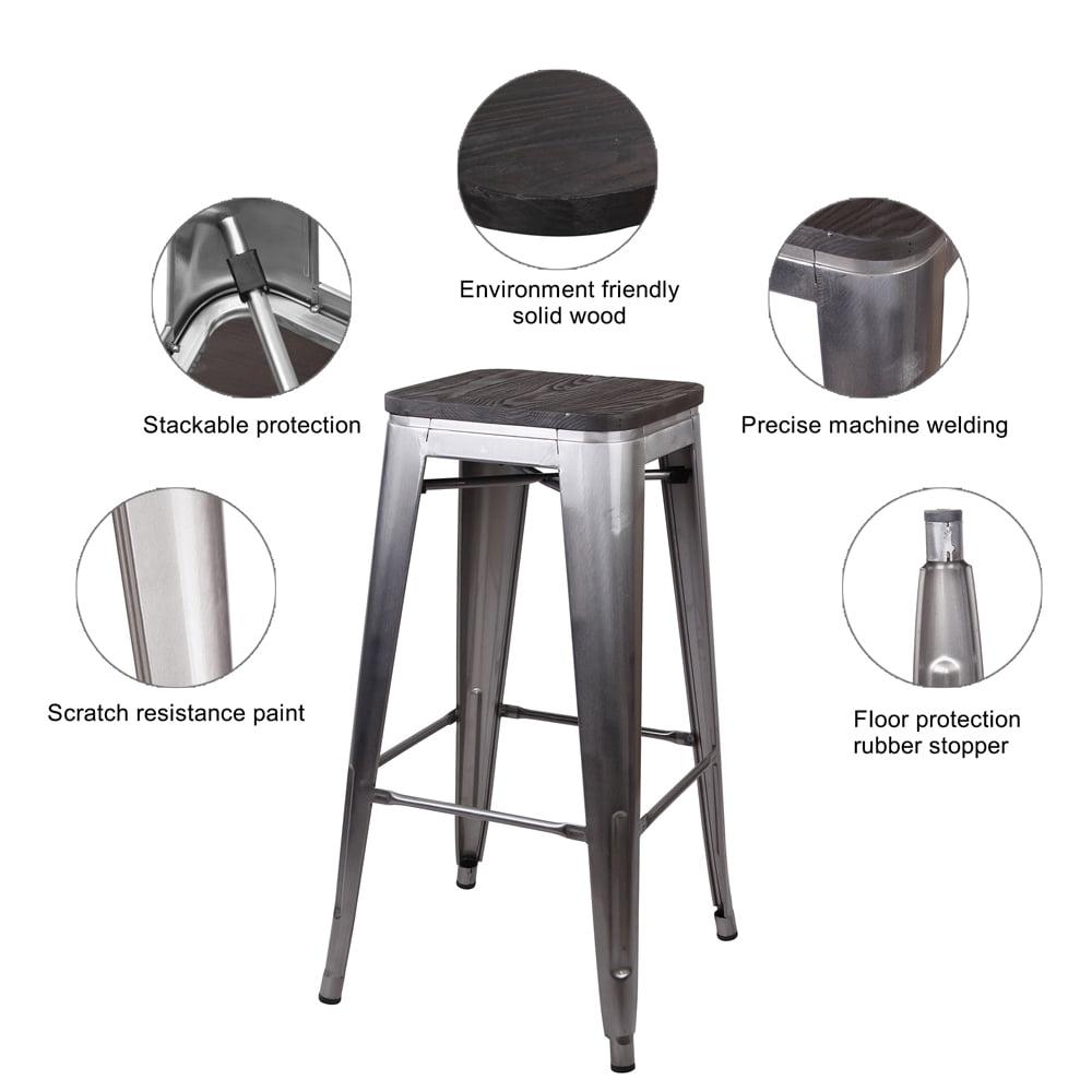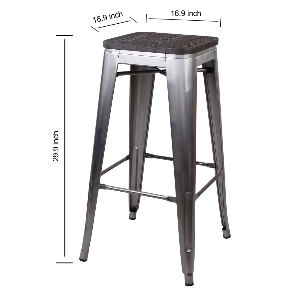 GIA Design Group 30 Inch Bar Height Backless Metal Stool with Dark Wood Seat, Gunmetal VERSATILE: These stools are made of an iron alloy with a gunmetal finish and a dark wood seat. The stools are elegant enough to be used in a kitchen, strong enough to be used in industrial shops, and durable enough to be used in game rooms, dorms, and bars SPACE SAVERS: These stools are lightweight and stackable, making them easy to move in and out of storage. The stools can be stacked on top of each other to increase space savings FUNCTIONAL & CHIC: The gunmetal scratch-resistant powder coat is elegant and long-lasting. The modern industrial look of the stools will perfectly compliment the city chic minimalist, the hard-working motorcycle mechanic SUPERHERO STRENGTH: With a weight capacity of 300 pounds, these stools can support the heaviest of loads. Made from a high-strength iron alloy, these stools are lightweight but extremely durable. Cross braces under each seat adds stability to the stool. Structural ribs pressed within the legs increases their torsional rigidity. DIMENSIONS: Each stool is 30″ tall, with a 12″ x 12″ seat, and a 17″ x 17″ base area for the legs.