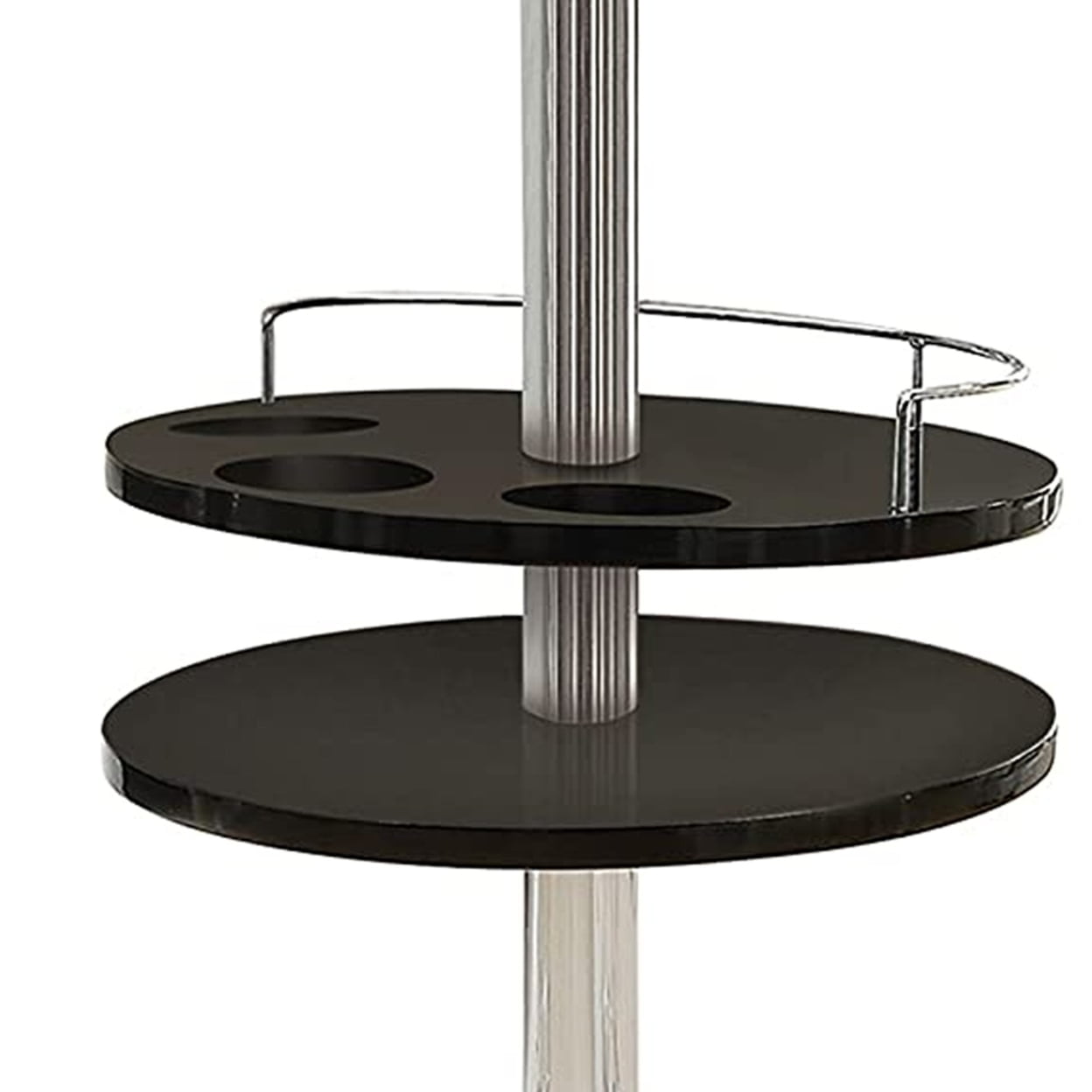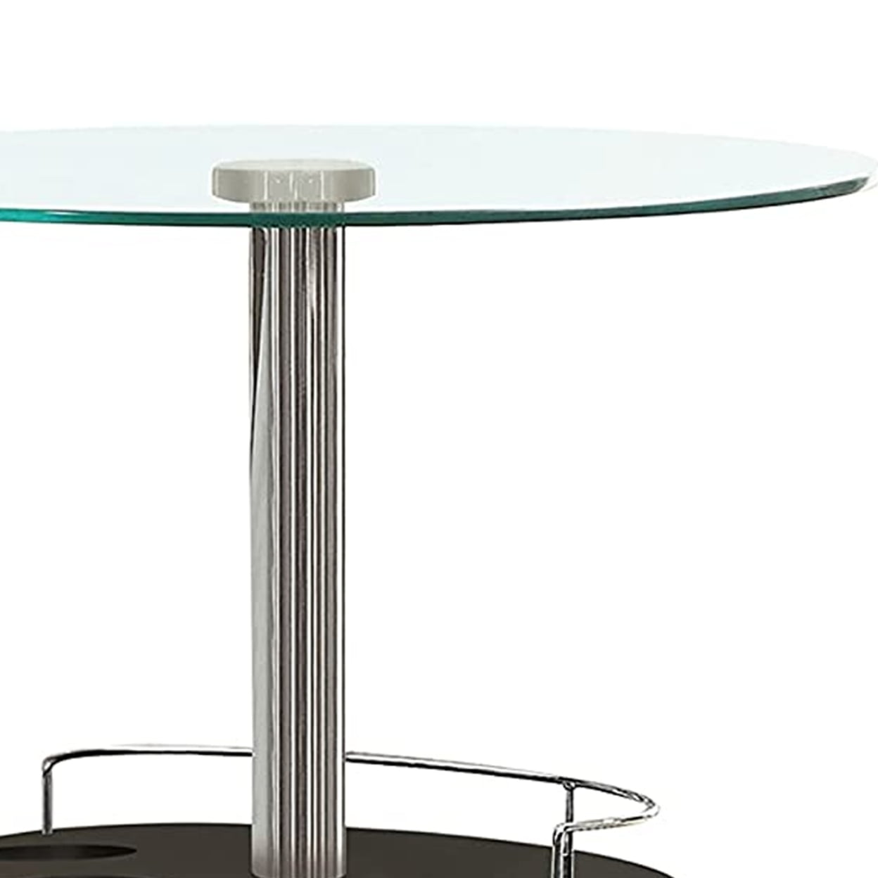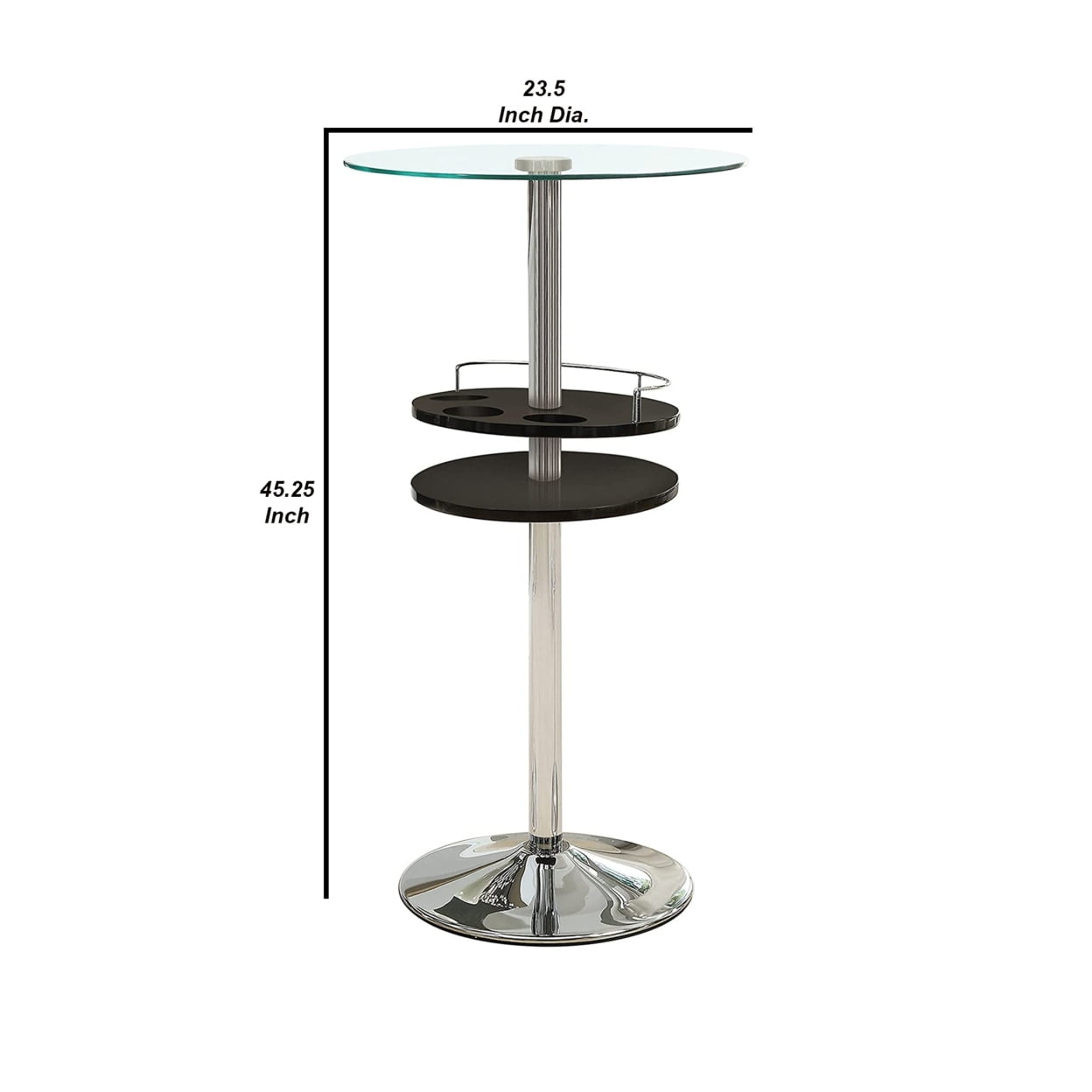 Featuring a built-in wine and stemware shelf, this contemporary bar table is perfect for compact spaces. Delivering modern style, the table features a round tempered glass tabletop perfect for indulging in a cocktail or serving up a great glass of wine. Underneath, its wine and glassware storage shelf is crafted with two layers of black glass that draw the eye. The table rests atop a pedestal base with a round foot and gleaming chrome finish. Measuring just under 24 inches across, this bar table fits virtually anywhere.