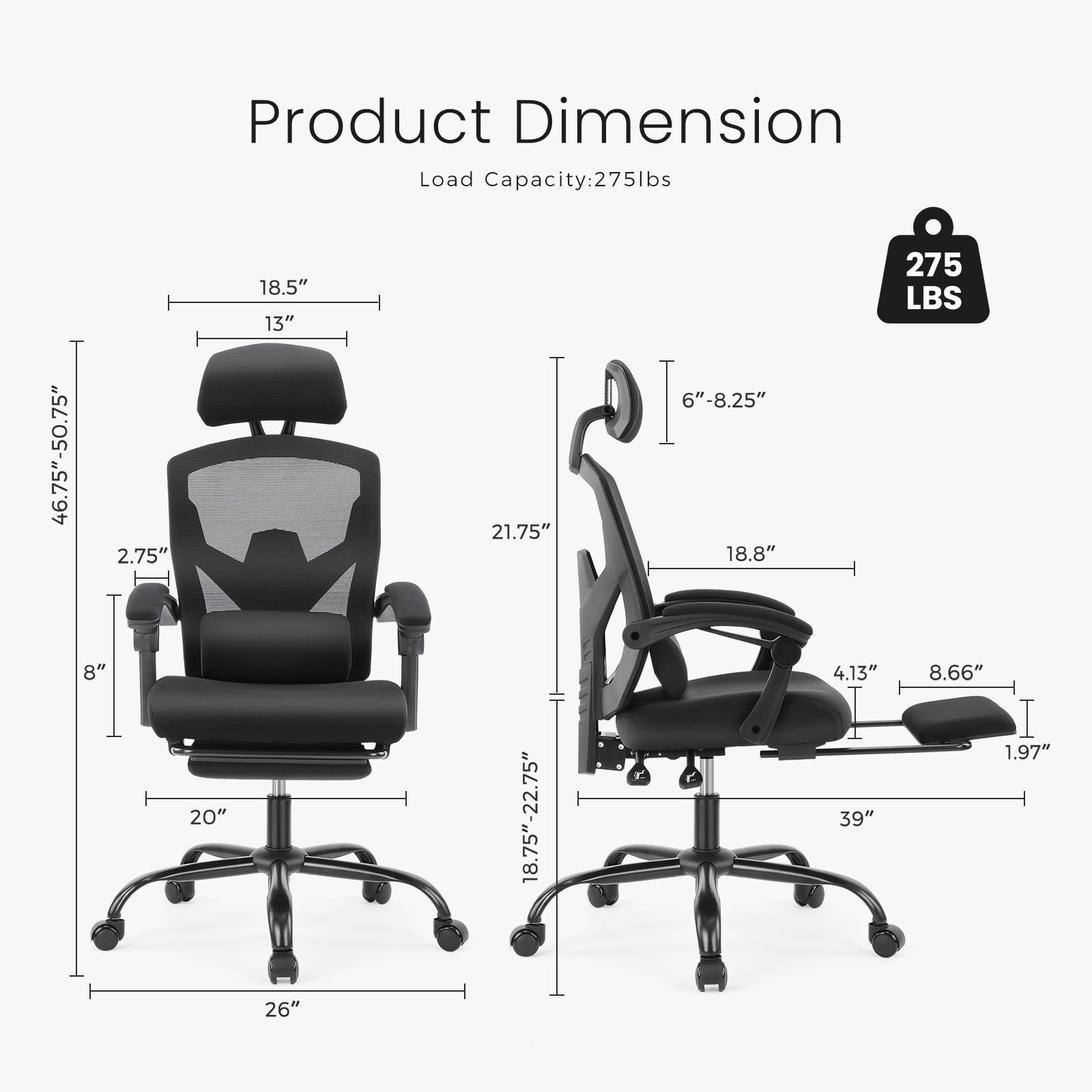 [Unmatched Comfort for All-Day Sitting]-Transform your workspace into a sanctuary with this high-back ergonomic office chair. Featuring breathable mesh fabric, lumbar support, and a fully adjustable headrest, footrest, and armrests, this chair delivers maximum comfort for both work and relaxation. Say goodbye to discomfort and enjoy unparalleled support no matter how long your day lasts. [Fully Adjustable for Personalized Comfort]-Find your ideal sitting position with ease. This chair offers a wide range of adjustments, including reclining functionality, height control, and customizable footrest and headrest settings. Tailor it to fit your body’s unique needs for a truly ergonomic experience that promotes well-being and enhances focus throughout the day. [Designed for Extended Comfort]-Engineered for comfort during long hours of sitting, this ergonomic chair features thick padding, a high-back design, and cushioned armrests. Whether you’re working, studying, gaming, or simply relaxing, you’ll enjoy hours of comfort without feeling stiff or fatigued. Ideal for those who spend extended periods at their desk or in front of a screen. [Effortless Mobility and Rock-Solid Stability]-Glide smoothly across your workspace with durable, easy-rolling casters that ensure fluid movement. The sturdy, heavy-duty base offers superior stability and support, so you can move around freely without worry. Whether adjusting your position or reaching for items, this chair lets you move with ease while maintaining solid support. [Responsive Customer Support You Can Count On]-We’re here for you every step of the way. Our dedicated customer service team is always available to assist with any inquiries or concerns, ensuring a seamless experience with your chair. Whether you need help with assembly or have questions about your purchase, we’re just a message away and ready to provide the support you deserve.