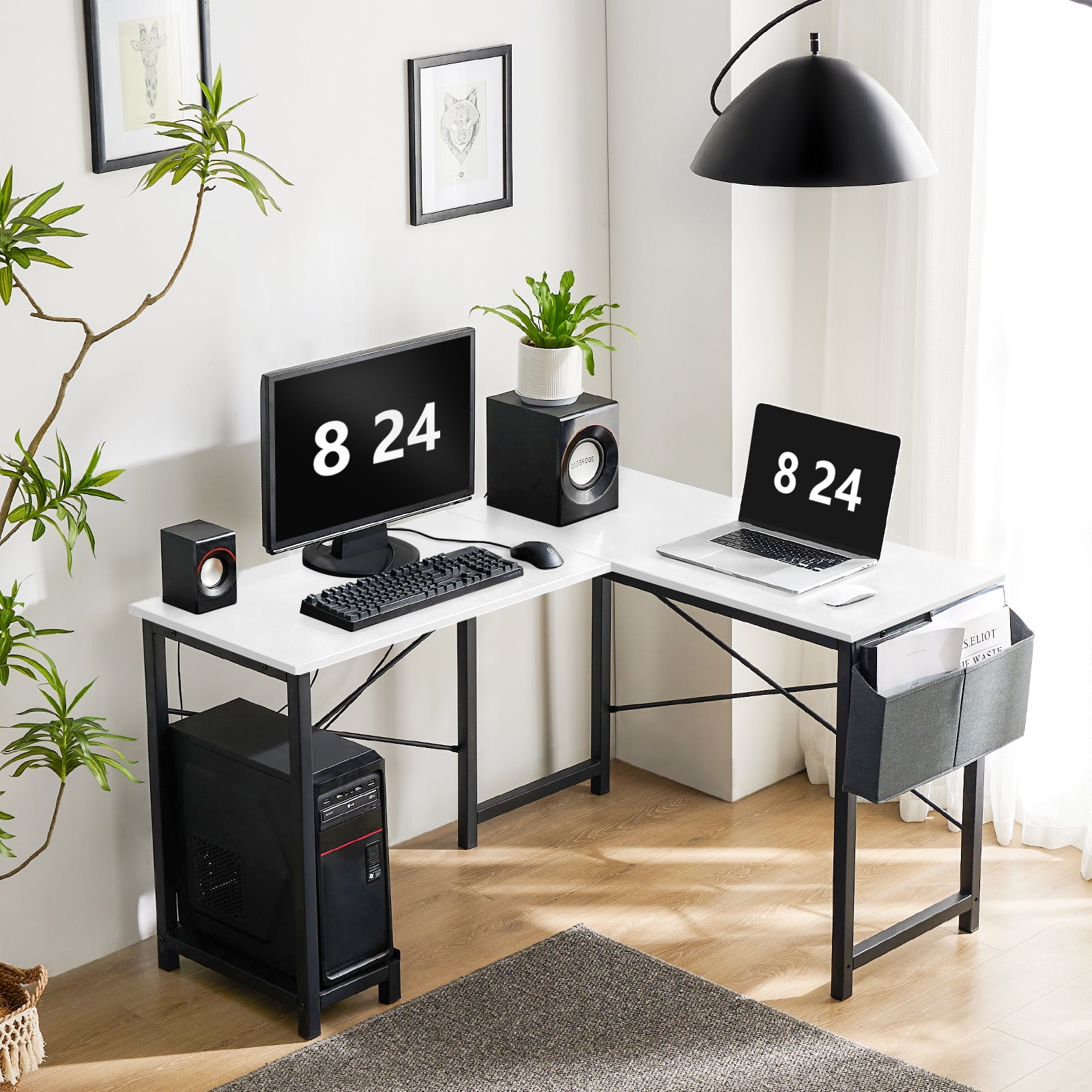 GIANNA L Shaped Computer Desk with Wooden Desktop CPU Stand Side Bag Reversible, White