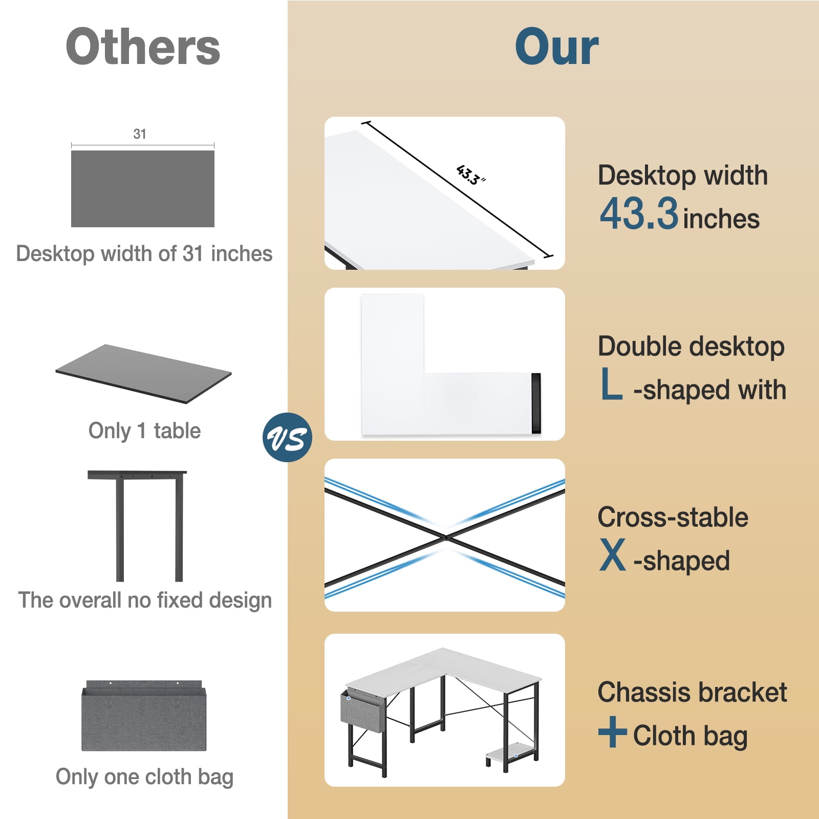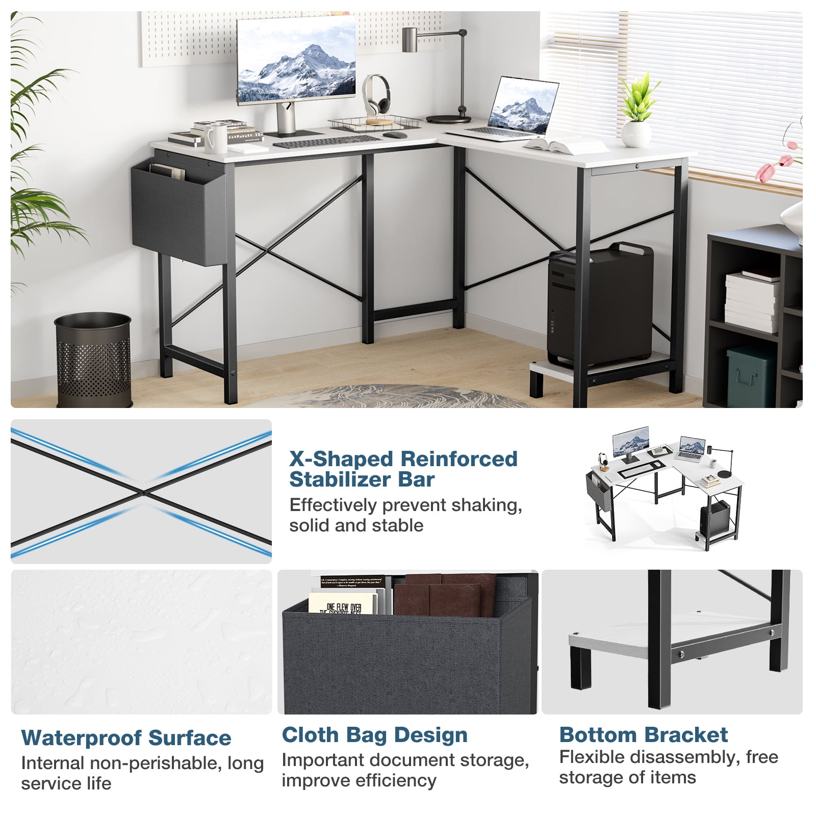 【Premium Materials】 Crafted with premium materials, this corner desk is built to withstand the rigors of daily use. The metal frame provides excellent stability and durability, ensuring that the l-shaped gaming desk remains sturdy during intense gaming sessions or prolonged work hours. Additionally, the desktop is waterproof and easy to clean. Overall Dimension: 49.61”(L)* 41.34”(W)* 29.13”(H). 【Sturdy Frame】Made of high quality, this corner desk with storage will give you a smooth user experience. With a sturdy metal frame, our office desk in L-shape will provide reliable support for you, with a maximum load of 200 lbs. construction enhances both functionality and aesthetics. 【User-Friendly Features】 This desk for the bedroom is designed with the user’s convenience in mind. The inclusion of a side storage bag allows for easy organization of essential items such as gaming accessories, office supplies, or personal belongings. The built-in CPU tray at the bottom provides a dedicated space to securely place your computer tower, keeping it off the floor and ensuring proper ventilation. 【Durable and Strong】This home office desk is made of a premium X-shaped metal frame and high-quality MDF. The desk frame is made of heavy-duty powder-coated steel with a corrosion-resistant surface to ensure stability and durability. The desktop is also friction-resistant and easy to clean. 【Fast Installation】Our simple study desk provides professional customer support. The box contains the product instructions, and installation tools, and can usually be assembled in 20 minutes.